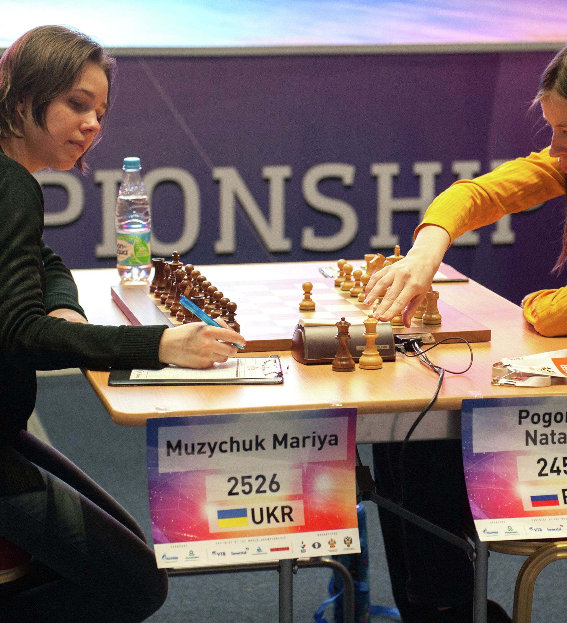 لعبت الأوكرانية (23 عاما) بالقطع البيضاء ولكنها لم تستطع الاستفادة من أفضلية اللون النظرية في البداية بل ووقعت في موقف صعب عند النقلة الـ26 بعد فتح ثغرات أمام دفاعات ملكها. غير أن الروسية (30 عاما) فوتت الفرصة الثمينة لتنظيم هجوم مباشر، مرتكبة عدة أخطاء تكتيكية متتالية. وتمكنت موزيتشوك من انتزاع المبادرة والتغلغل في عمق التشكيلات المعادية على الرقعة وتشكيل تهديد مميت على الملك الأسود بعد التضحية بأحد حصانيها. واستسلمت بوغونينا بعد النقلة الـ58.