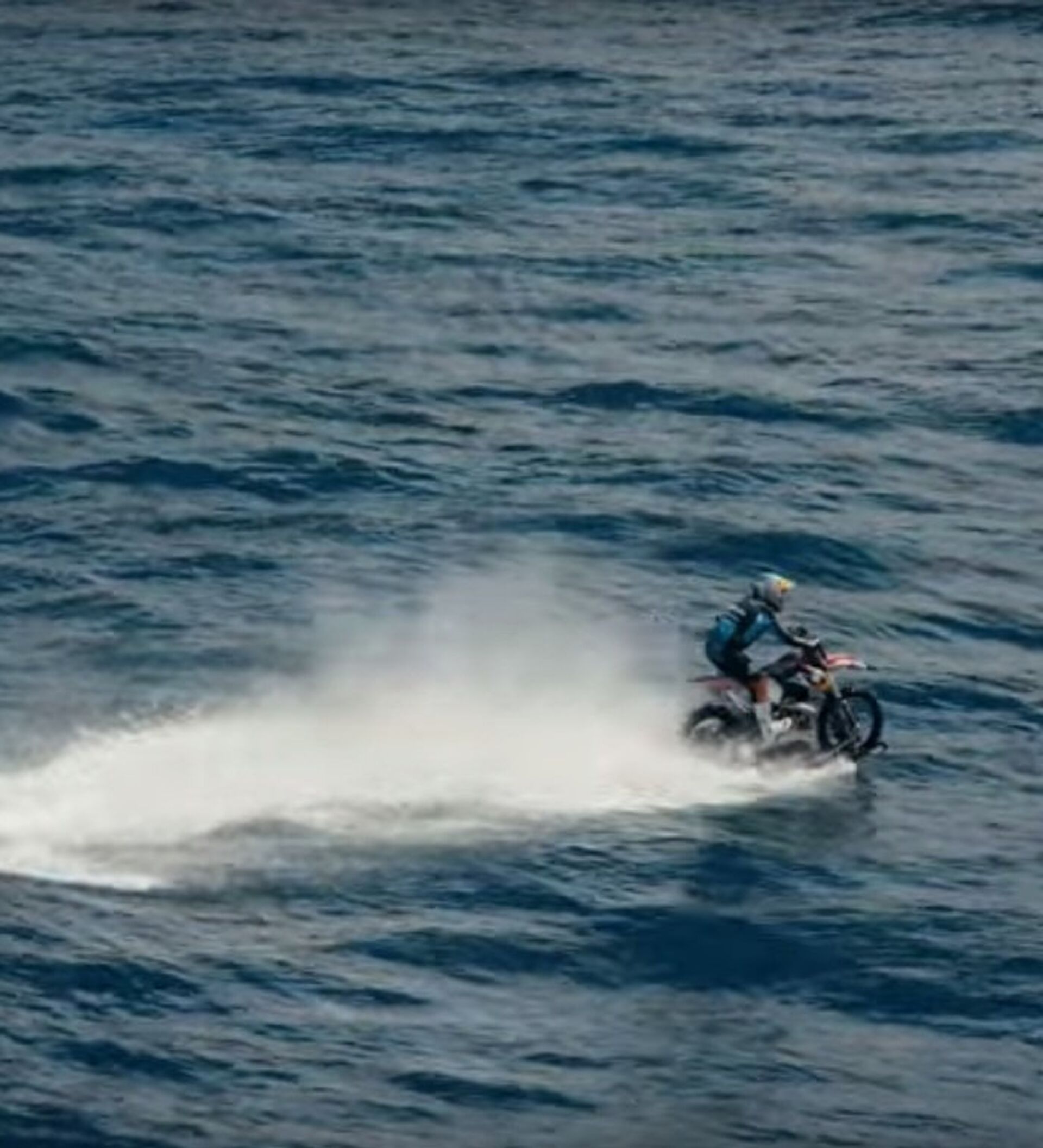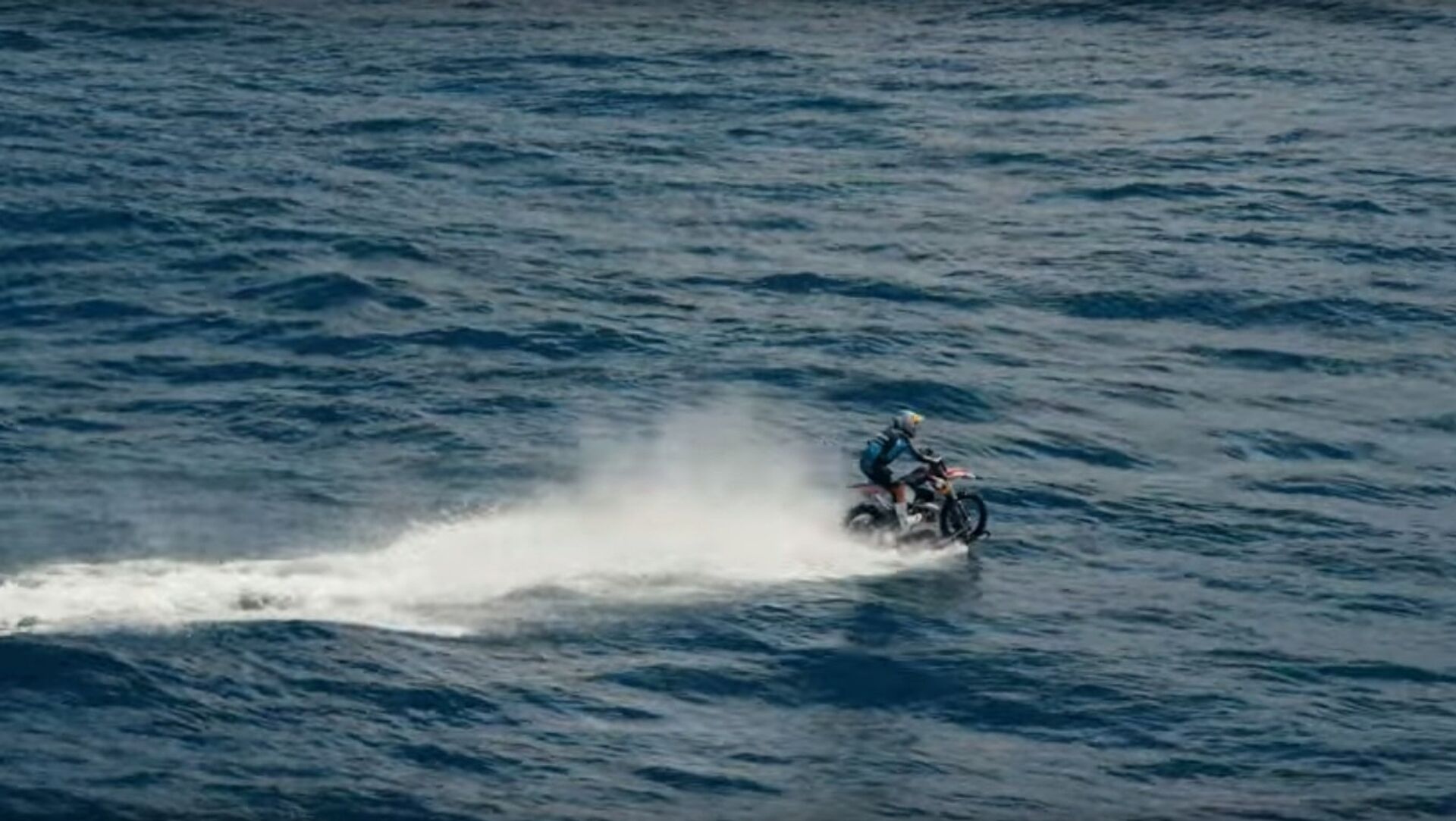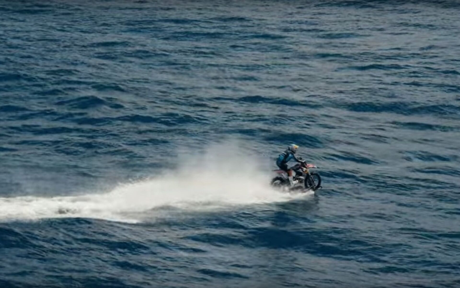ويمكن أن يشاهد مستخدمو الانترنت سائقاً للدراجة النارية يتسارع أولاً، ثم يدخل في البحر مباشرة بدراجته، لكنه لم يتوقف بل يستمر في السير. وليس السير فقط فحسب بل والقيام بألعاب بهلوانية.