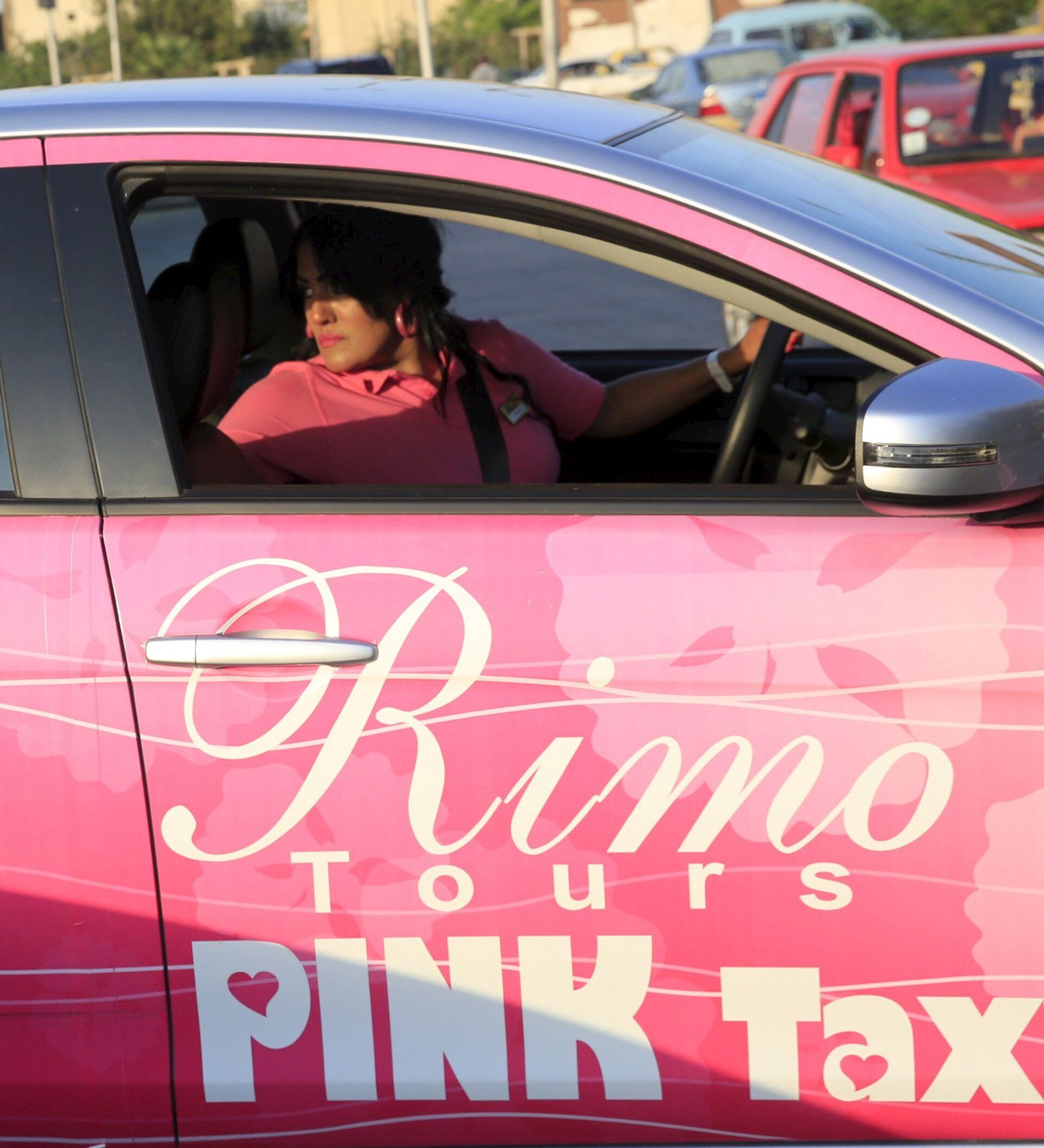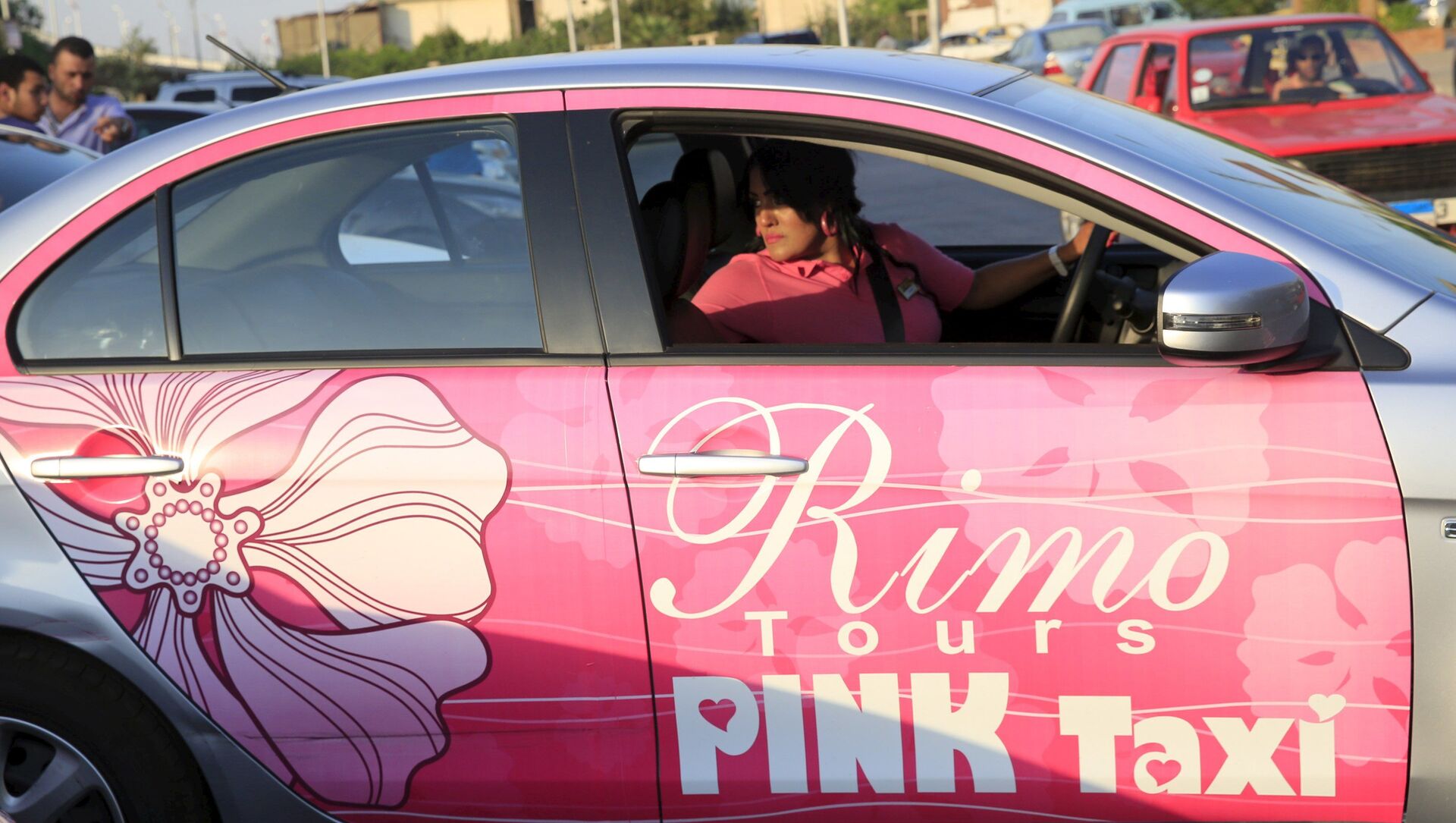 سائقات "التاكسي الزهري" يستمعن إلى الميكانيكي عند موقف السيارات في القاهرة. زي زهري، شعار زهري على السيارات، وحتى طلاء الأظافر زهري أيضاً. كل هذا جزء من مظهر النساء-السائقات اللاتي يقمن، ولأول مرة، بخدمة سيارات التكسي للنساء فقط. وتقوم شركة "التكسي الزهري" بتوظيف النساء فقط لتوصيل النساء فقط. وبدأت الشركة بالعمل من أجل توفير خدمة آمنة لتوصيل النساء داخل البلد الذي يتميز بنسبة تحرش عالية.