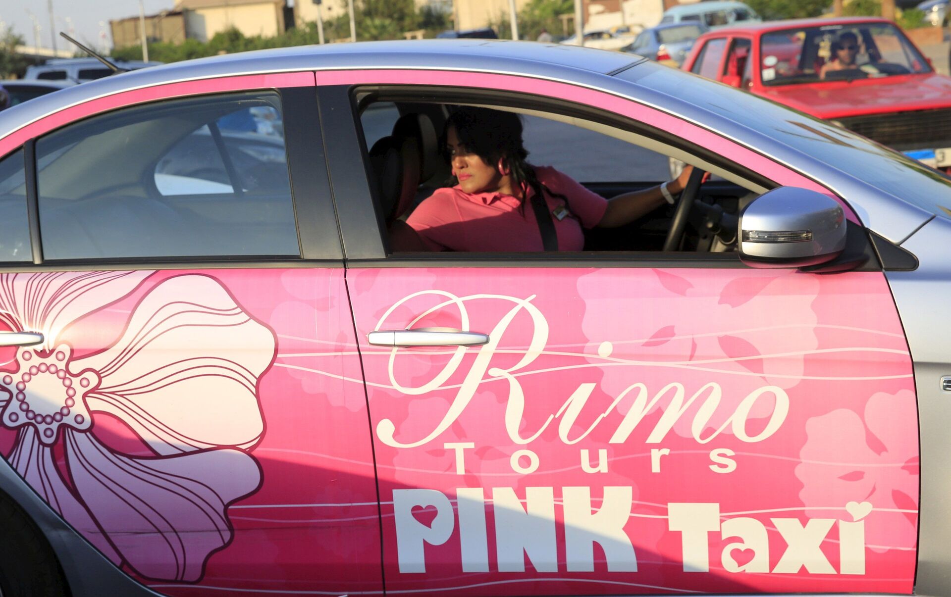 سائقات "التاكسي الزهري" يستمعن إلى الميكانيكي عند موقف السيارات في القاهرة. زي زهري، شعار زهري على السيارات، وحتى طلاء الأظافر زهري أيضاً. كل هذا جزء من مظهر النساء-السائقات اللاتي يقمن، ولأول مرة، بخدمة سيارات التاكسي للنساء فقط. وتقوم شركة "التاكسي الزهري" بتوظيف النساء فقط لتوصيل النساء فقط. وبدأت الشركة بالعمل من أجل توفير خدمة آمنة لتوصيل النساء داخل البلد الذي يتميز بنسبة تحرش عالية.