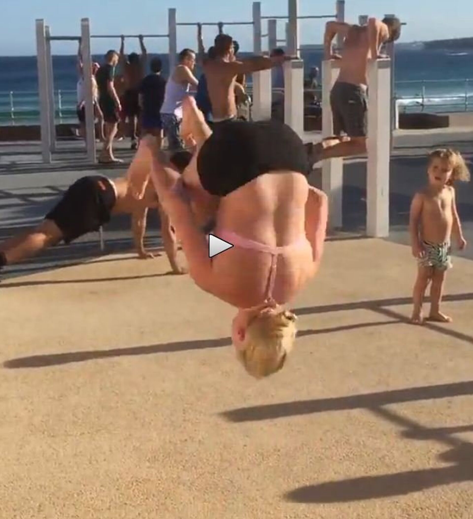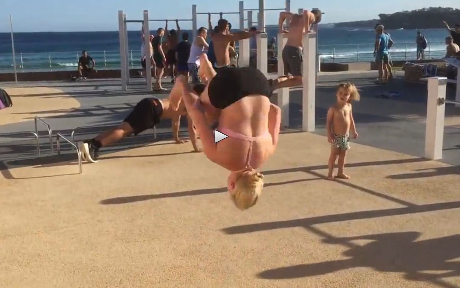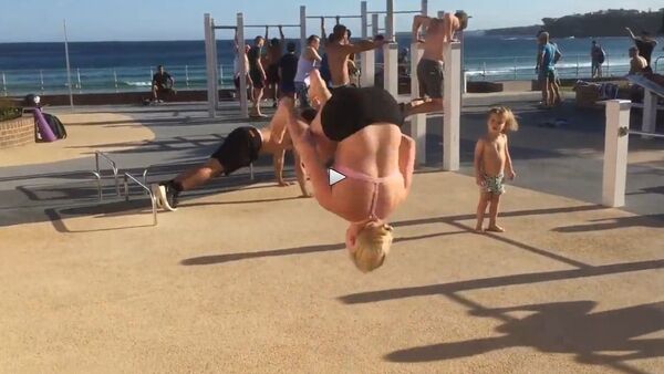 لفتت فتاة، تملك قدرات رياضية عجيبة، انتباه الرجال في نادي الرياضة الواقع على شاطئ البحر "بوندي" جنوب أستراليا. 25.01.2016, سبوتنيك عربي