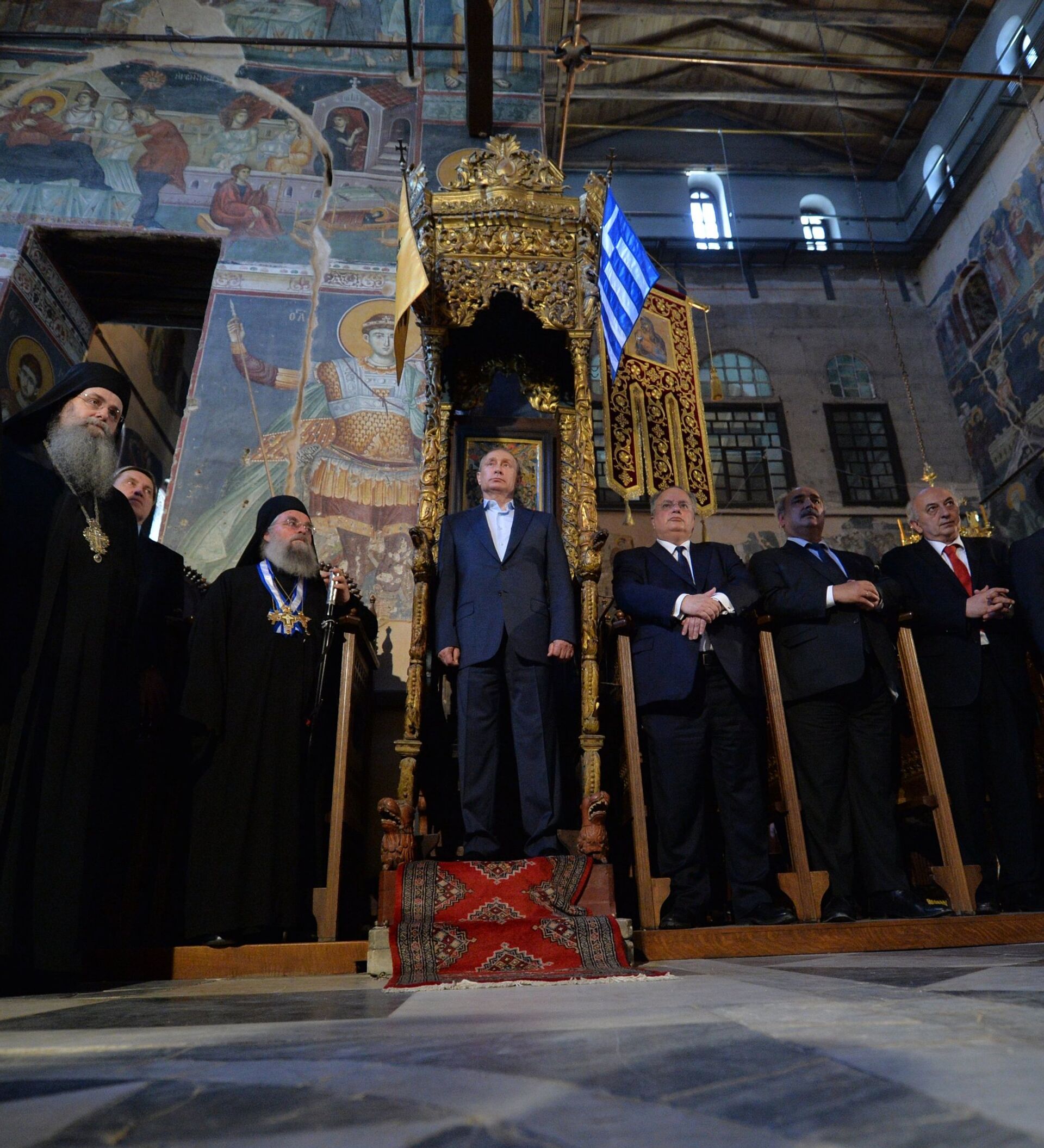 والتقى الرئيس الروسي مع الرهبان والقادة الدينيين، بمن فيهم بطريرك القسطنطينية المسكوني برثلماوس، وقدم الشكر لممثلي الكنيسة اليونانية الأرثوذكسية على ما يقومون به من أجل دعم العلاقات مع الكنيسة الأرثوذكسية الروسية والشعب الروسي، مشيرا إلى أن جبس آثوس المقدس يعتبر مصدرا للأسس الأخلاقية للمجتمع. وأعرب عن قناعته بتعزيز العلاقات بين روسيا وبين آثوس واليونان بشكل عام، و"التقارب الروحي سيحدد طبيعة علاقات الصداقة الوثيقة بيننا".