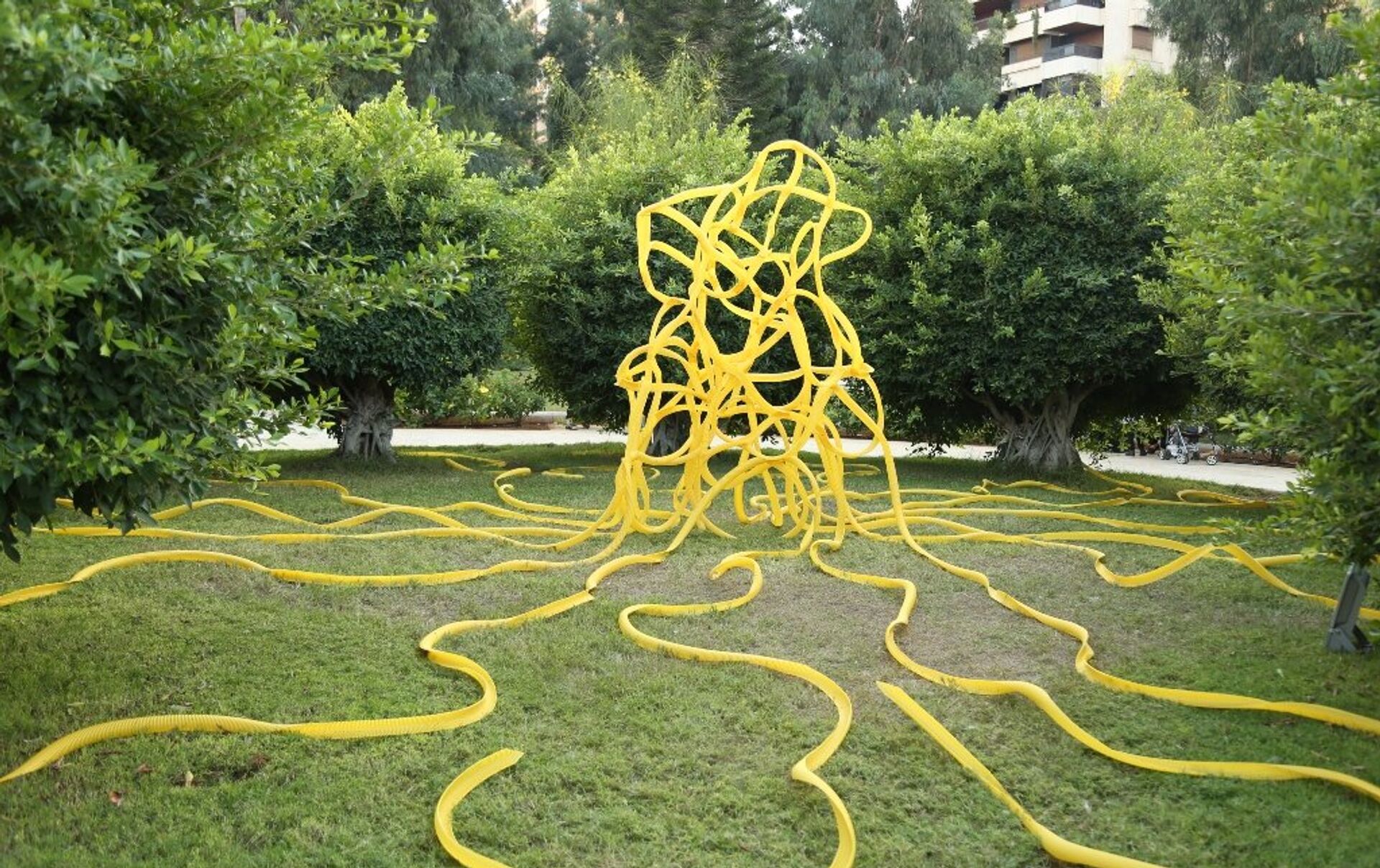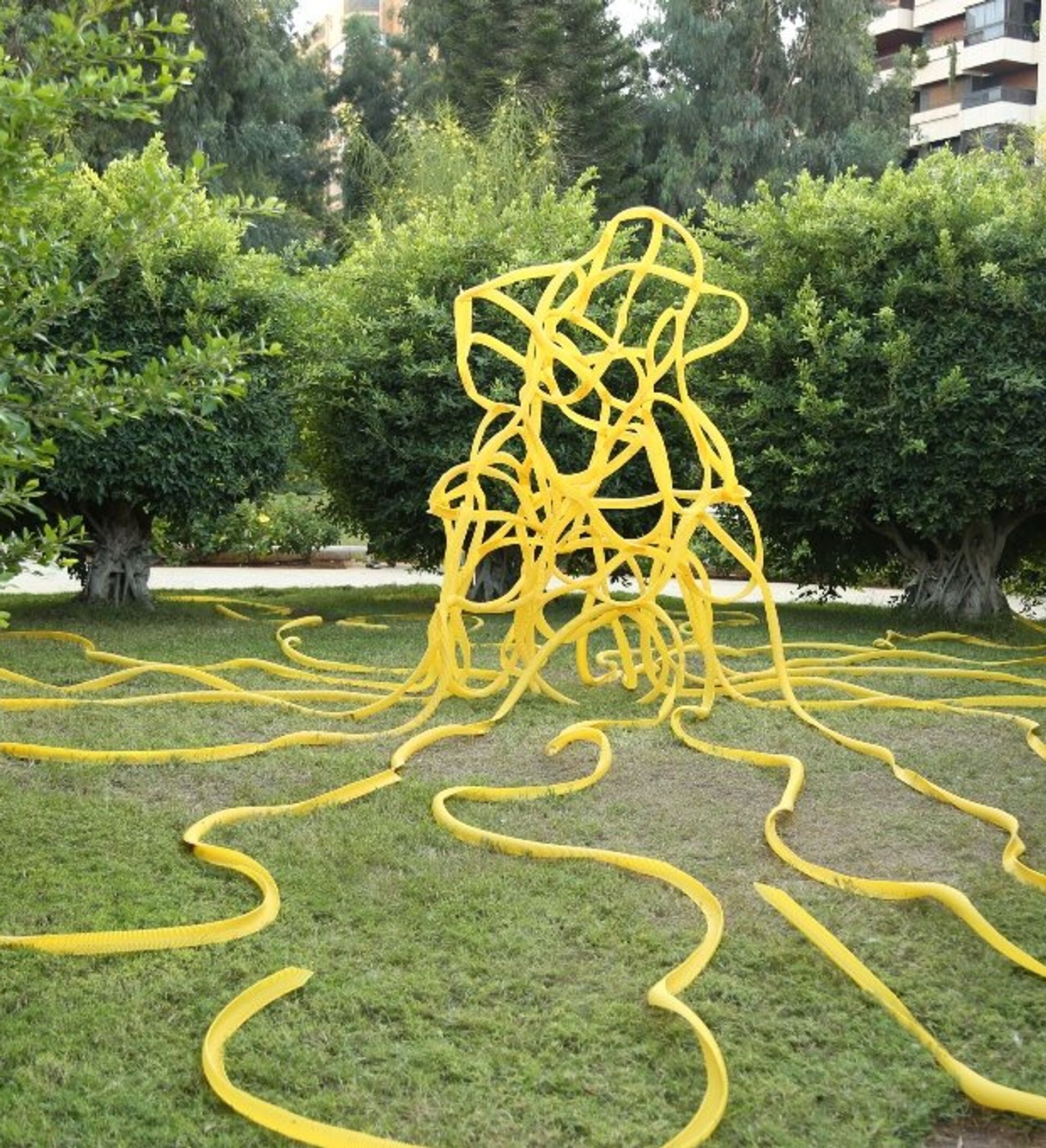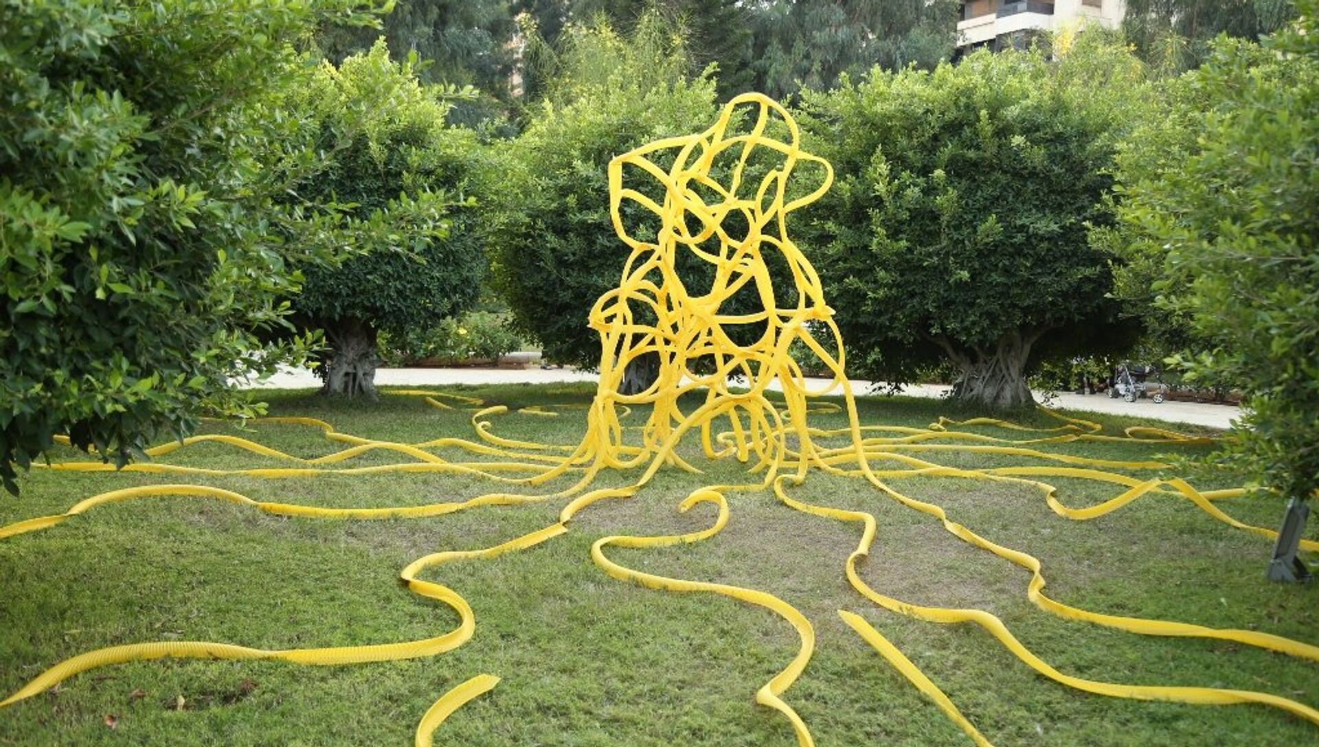 رانيا حلاوي القيمة على هذا المعرض قالت لـ"سبوتنيك": "جمعنا فنانين من البلدان العربية والأوروبية من أجل تعزيز الحوار والتواصل بين بعضهم البعض في مساحة عامة، واشترطنا على الفنانين الأوروبيين تنفيذ أعمالهم في هذه الحديقة لكي يتسنى لللبنانيين وللجمهور أن يروا كيفية صنع قطعة فنية".