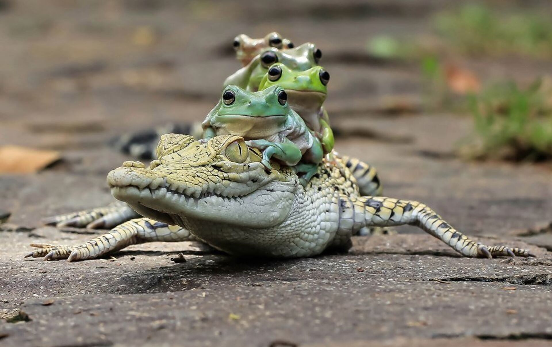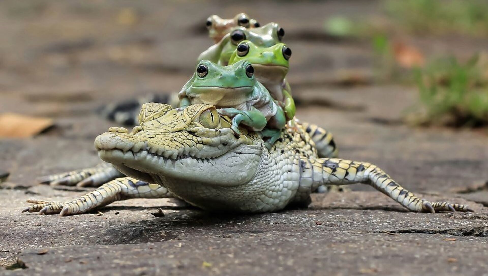 شاهد بالصور...الضفادع تستخدم التمساح كوسيلة للتنقل