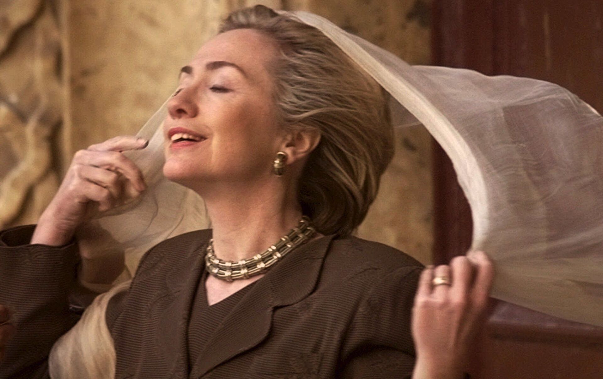 المرشحة للانتخابات الرئاسية الأمريكية من الحزب الديموقراطي هيلاري كلينتون تضع "منديلاً" لتغطي رأسها قبل دخولها هي وابنتها تشيلسي إلى قلعة صلاح الدين بمدينة القاهرة، مصر 21 مارس/ آذار 1999