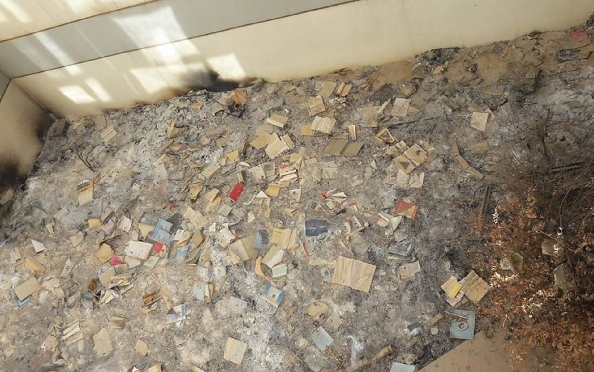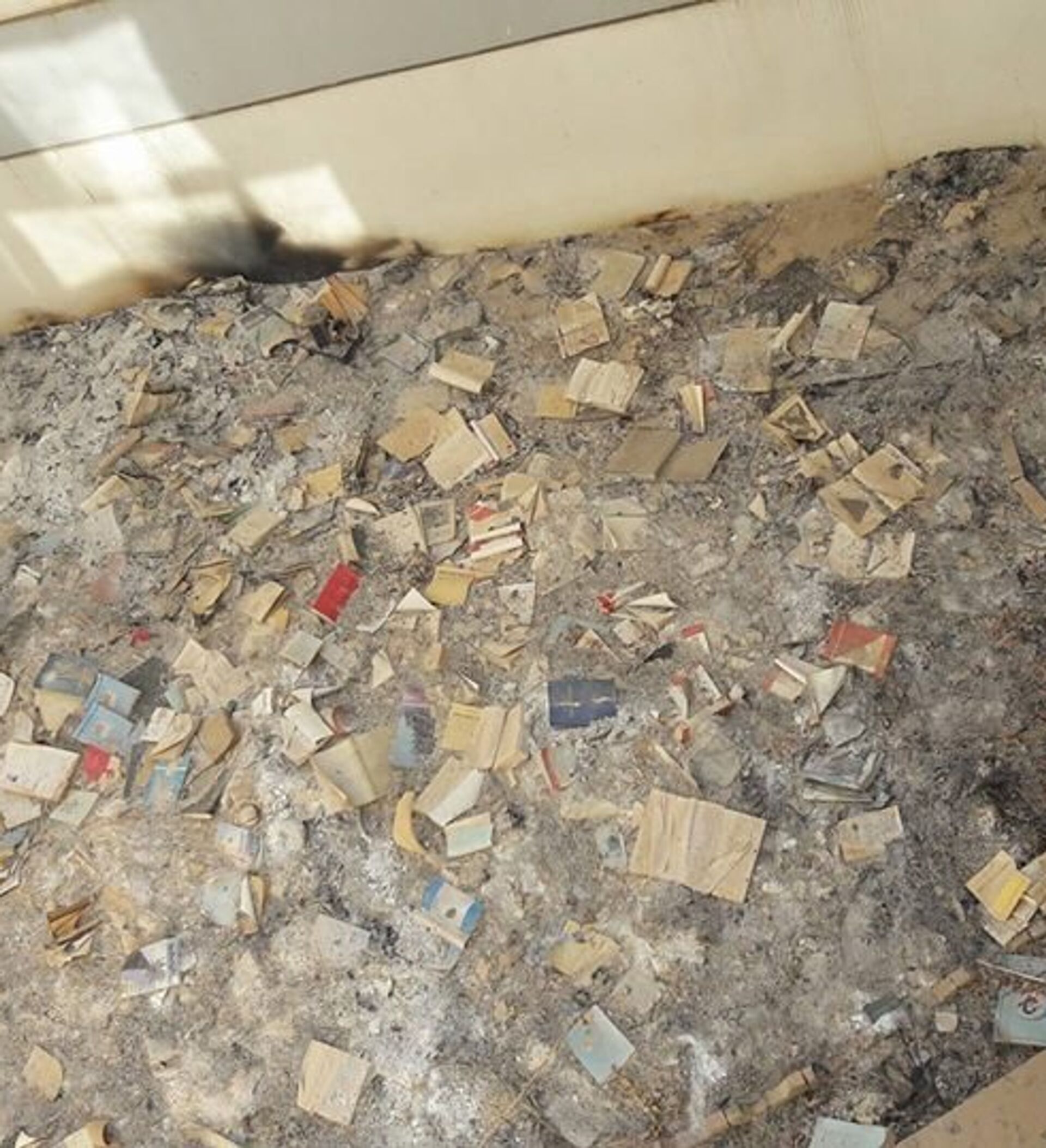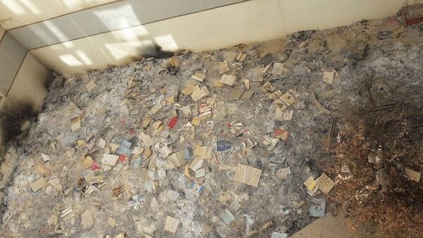 وتُظهر الصور فظاعة ما اقترفه تنظيم "داعش" بحق الكتب والمخطوطات المسيحية السريانية القديمة، جاعلاً منها ذرات رماد دون أن يترك حرفا واحدا حيا سوى أحجار وقطع حديد ذائبة، وكأنها تبكي ألماً التاريخ الذي مُزق أمامها بوحشية الدواعش وبطشهم الذي طال كل شيء في سهل نينوى والمحافظة والموصل معقلهم الأكبر والأخير في شمال العراق.