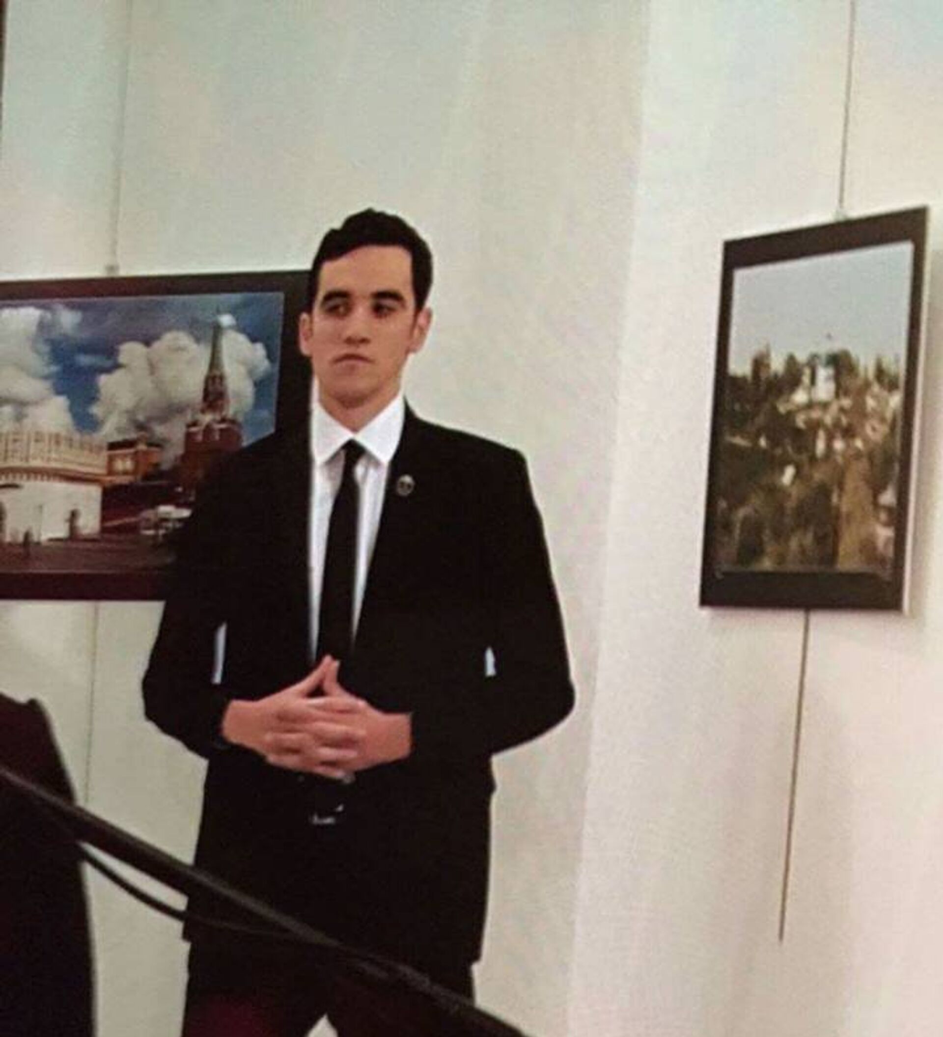 ويظهر القاتل في الفيديو يتحرك خلف السفير الروسي ويوجه نظره إلى بعض اللوحات، ثم يضع يده في سترته ليخرج المسدس ويقتل السفير الروسي مباشرة.