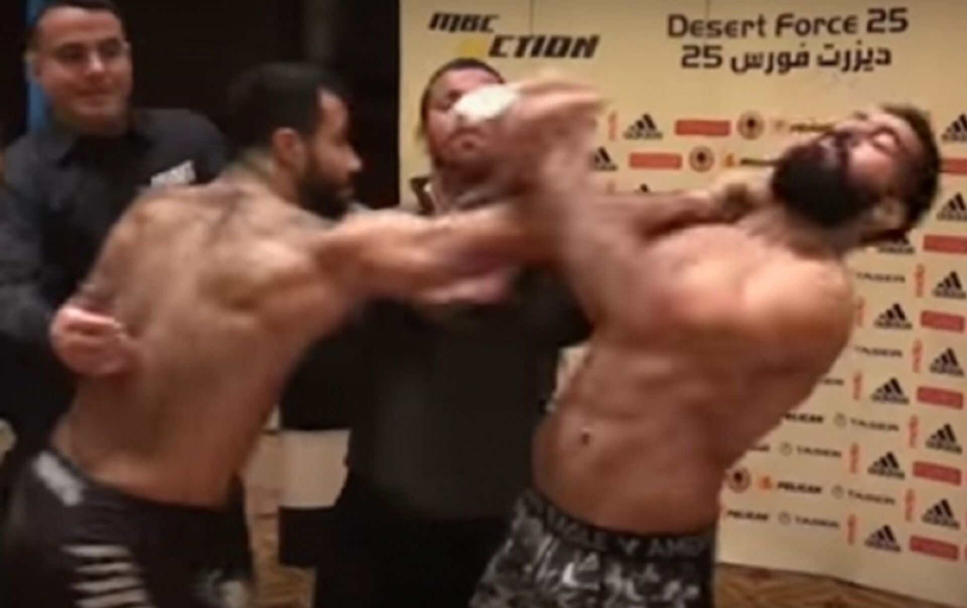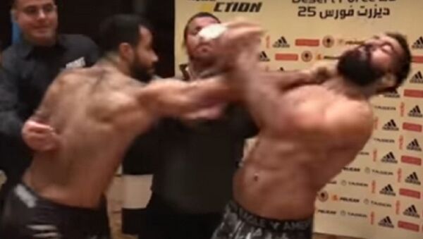 وكان المصارع المصرى أسامة صعيدى ومنافسه السعودى مصطفى راشد قد اشتبكا قبل دقائق من نزالهما فى بطولة "ديزرت فورس" للفنون القتالية المختلطة، التى أقيمت فى الأردن.
