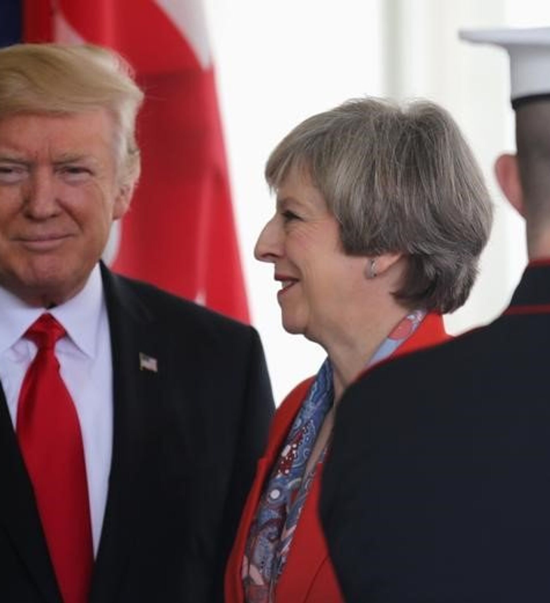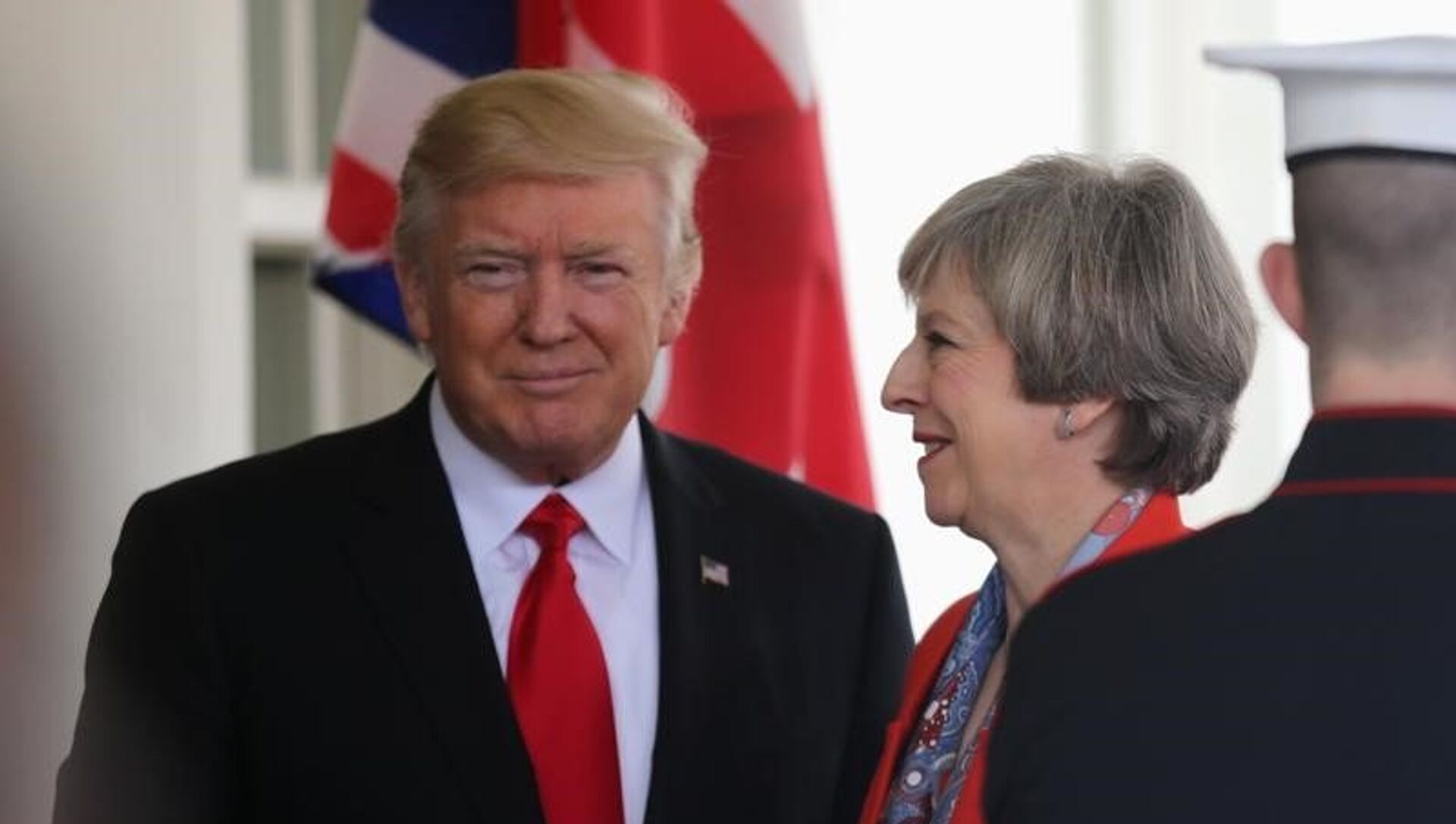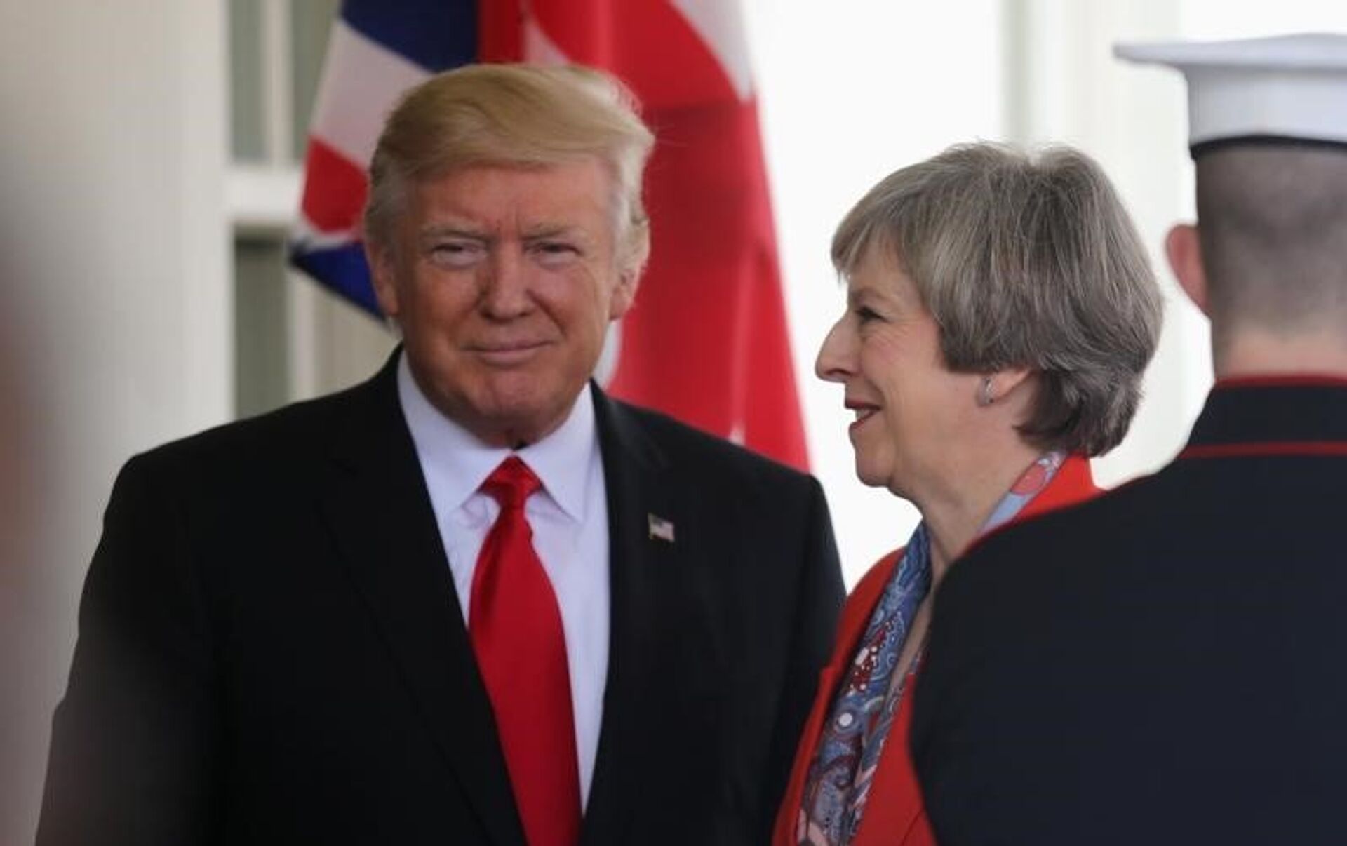 وأظهرت الصور خروج ترامب وماي مع بعضهما البعض من البيت الأبيض، وهو ممسك بيدها بصورة وصفتها بعض الصحف الإنجليزية بـ"بالحميمية".