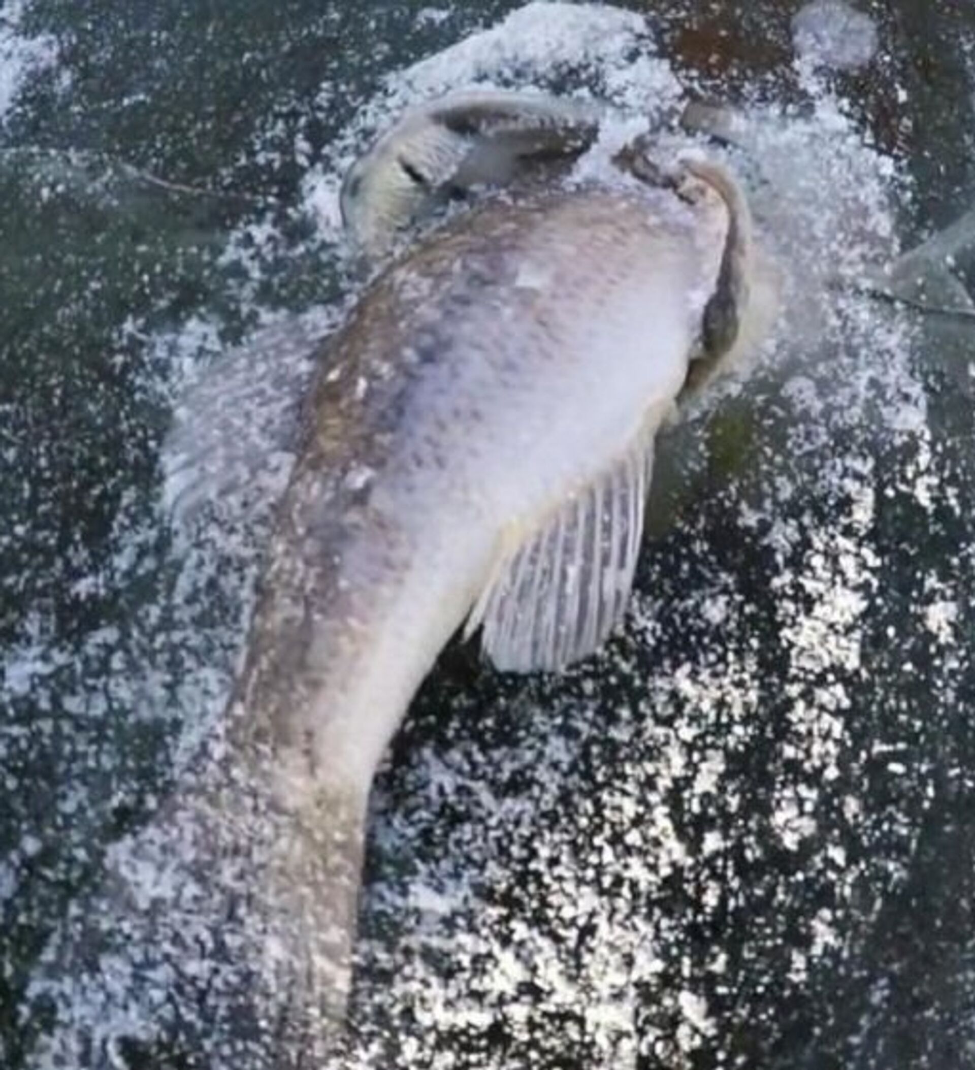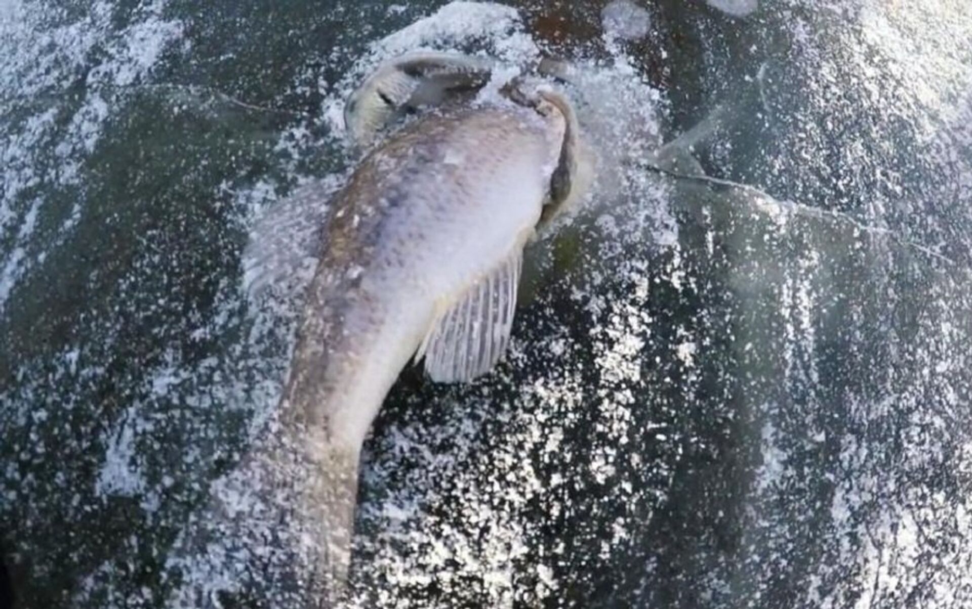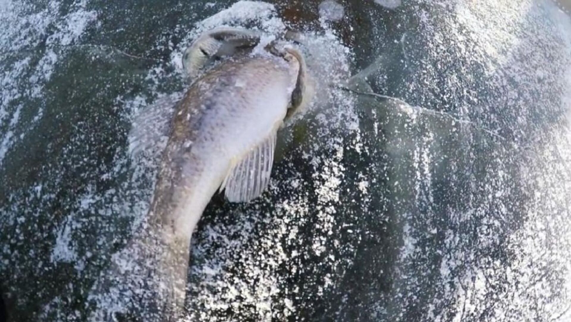 حيث كان بداخل هذه القطعة الجليدية سمكتان، واحدة نصفها خارج الجليد والأخرى حاولت اصطياد القسم الآخر الواقع داخل الجليد، وكما هو واضح من خلال الفيديو، فإن السمكة التي حاولت اصطياد السمكة العالقة، علقت أيضا وماتت معاً في حالة غريبة.
