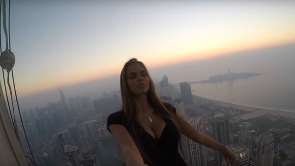 فيكي أودينتيكوفا، وهي عارضة أزياء روسية لديها أكثر من 3 ملايين متابع على إنستغرام، نشرت صوراً وفيديوهات لها وهي تتدلى من برج كيان في منطقة المارينا بدبي. 16.02.2017, سبوتنيك عربي