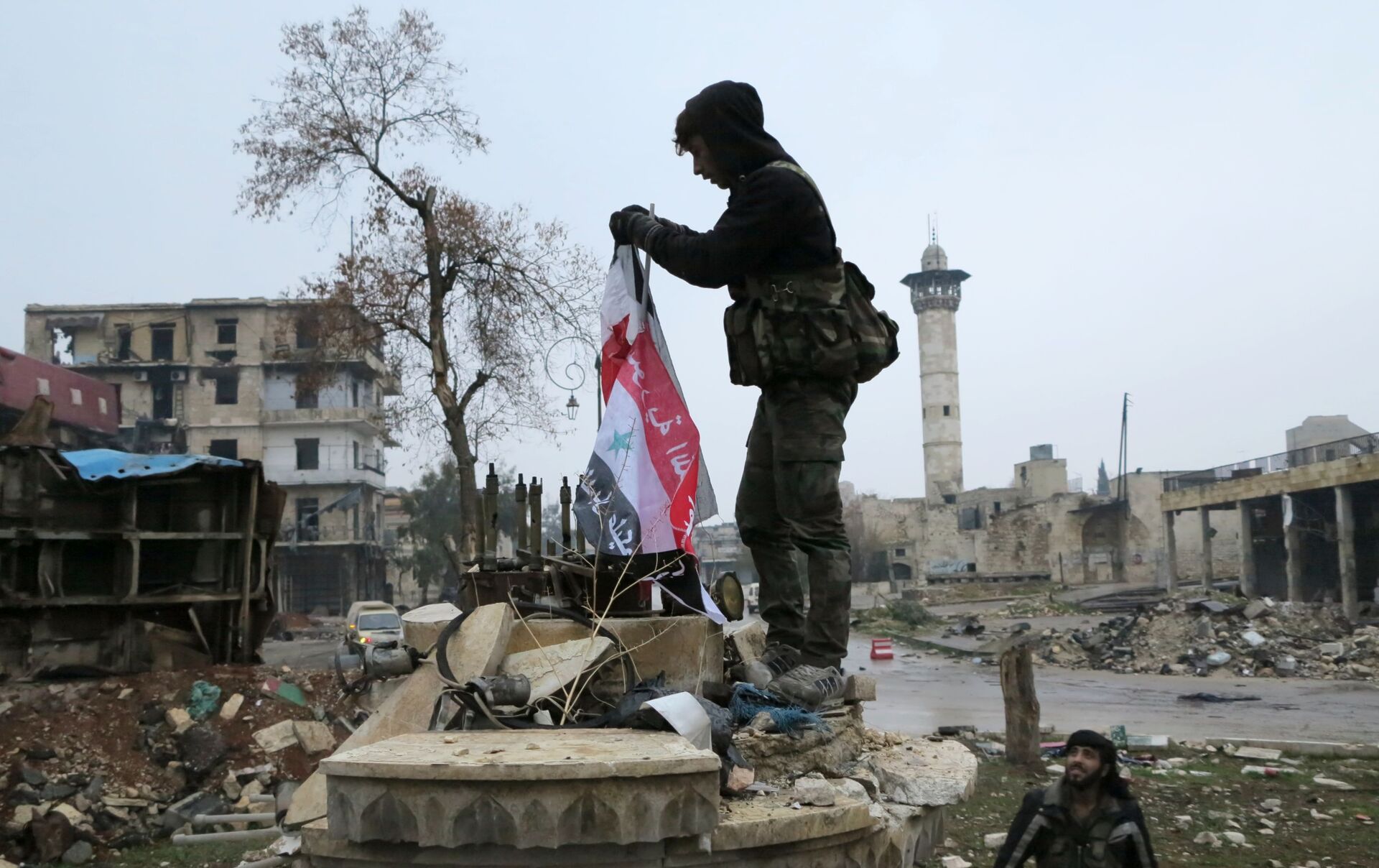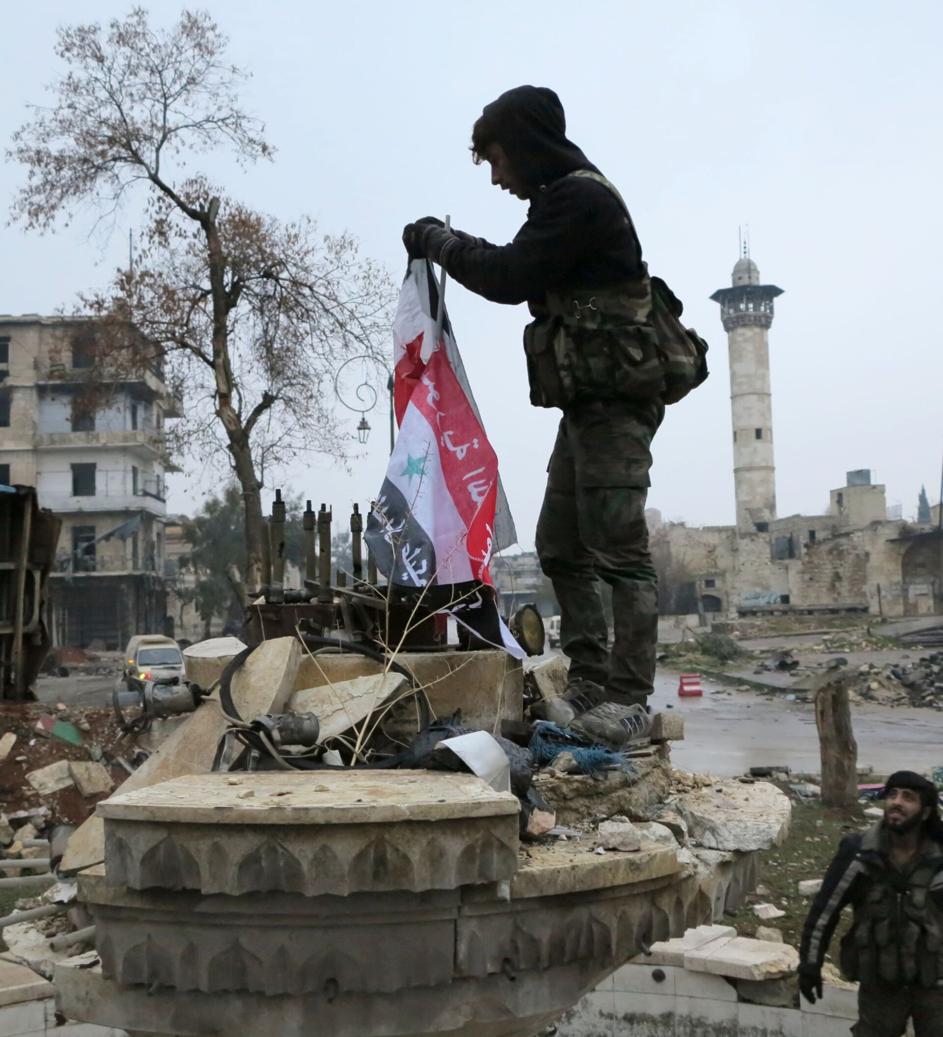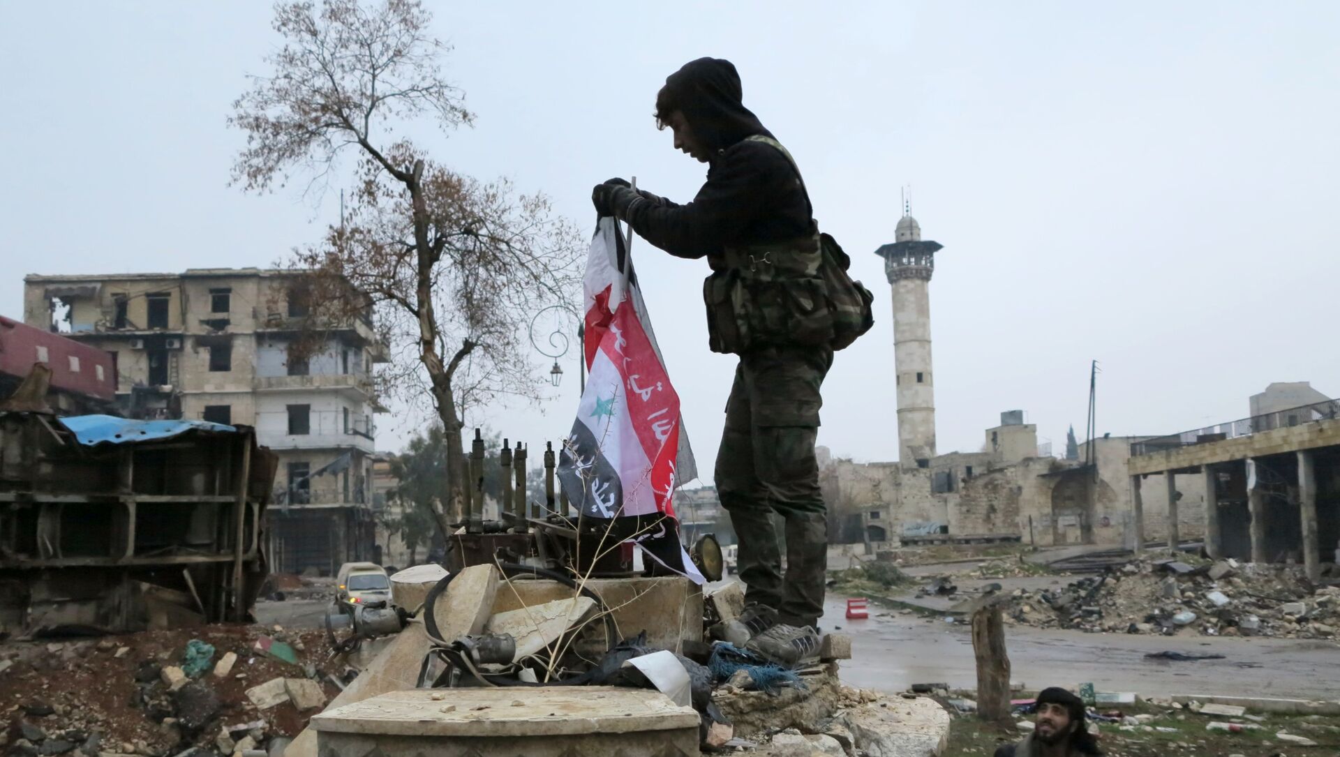 على بعد أقل من 100 متر من تادف يظهر العلم التركي، على أحد الأبنية داخل مدينة الباب…ويقول القائد الميداني "لولا الاتفاق الروسي — التركي كان الجيش السوري سيطر على مدينة الباب".