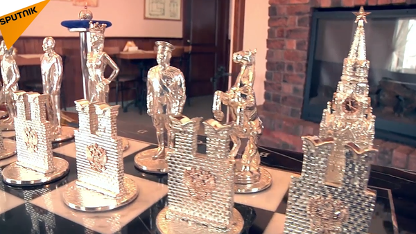ونرى في أحد جوانب لوح الشطرنج يقف كل من فلاديمير بوتين وسوفوروف*، وفي الجانب الآخر باراك أوباما ونابليون.