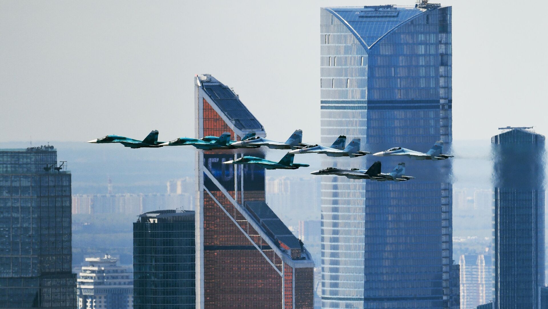 تدريبات العرض الجوي العسكري بمناسبة عيد النصر - المقاتلات متعددة المهام "سو-30اس ام" من الفريق الجوي "فيتيازي" (الفرسان الروس)، و "ميغ-29" من الفريق الجوي "ستريجي" (الخفافيش) تحلق فوق الساحة الحمراء في موسكو