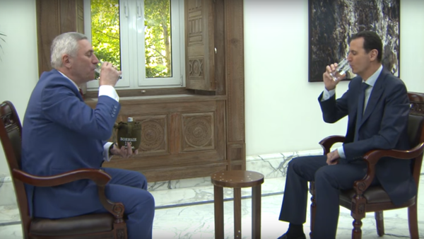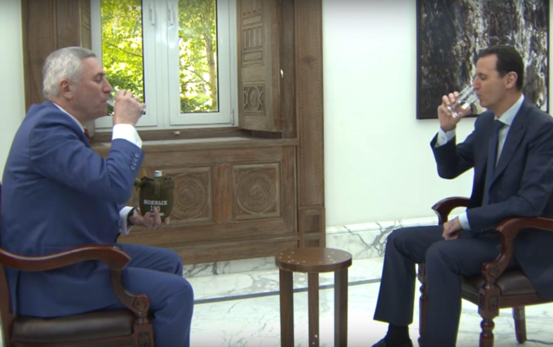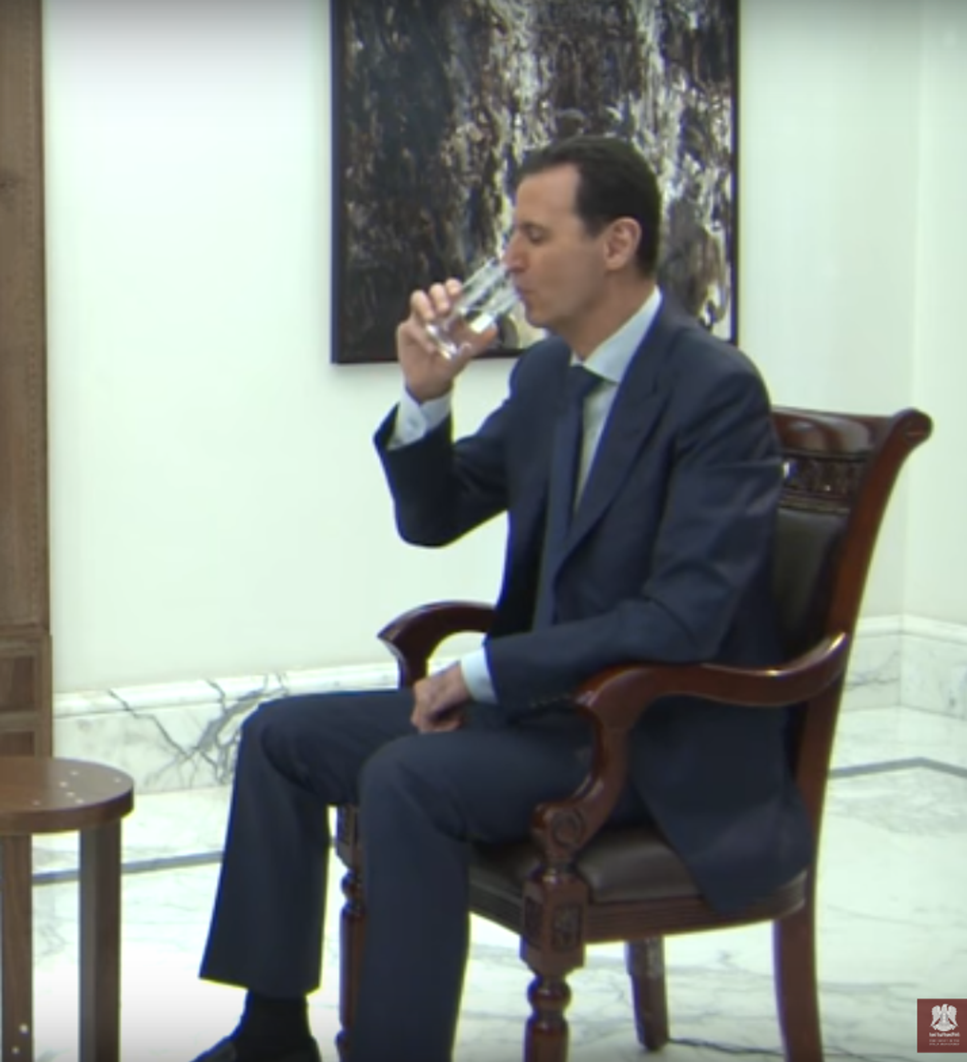 وبعدما تشارك الأسد والصحفي شرب الماء، قال الرئيس السوري لضيفه إن "المياه هي نعمة لأنها هبة من الله. ولكن هذه المياه التي جلبتها من نبع الفيجة يضاف لها بأن عمّدت بدماء المقاتلين السوريين من أجل أن تعود لكل منزل في دمشق".