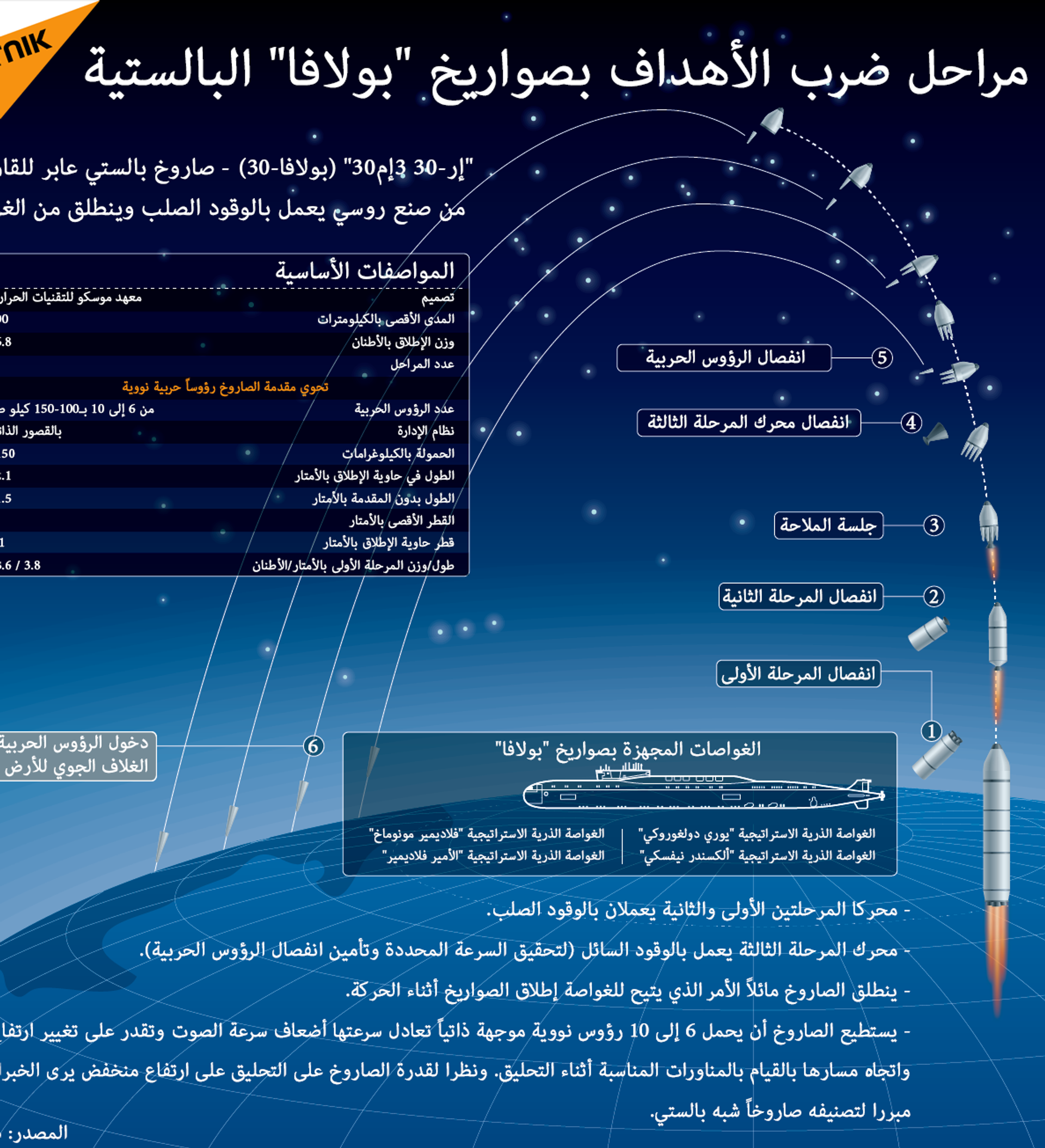 "إر-30 3إم30" (بولافا-30) صاروخ بالستي جديد عابر للقارات من صنع روسي يعمل بالوقود الصلب وينطلق من الغواصة.