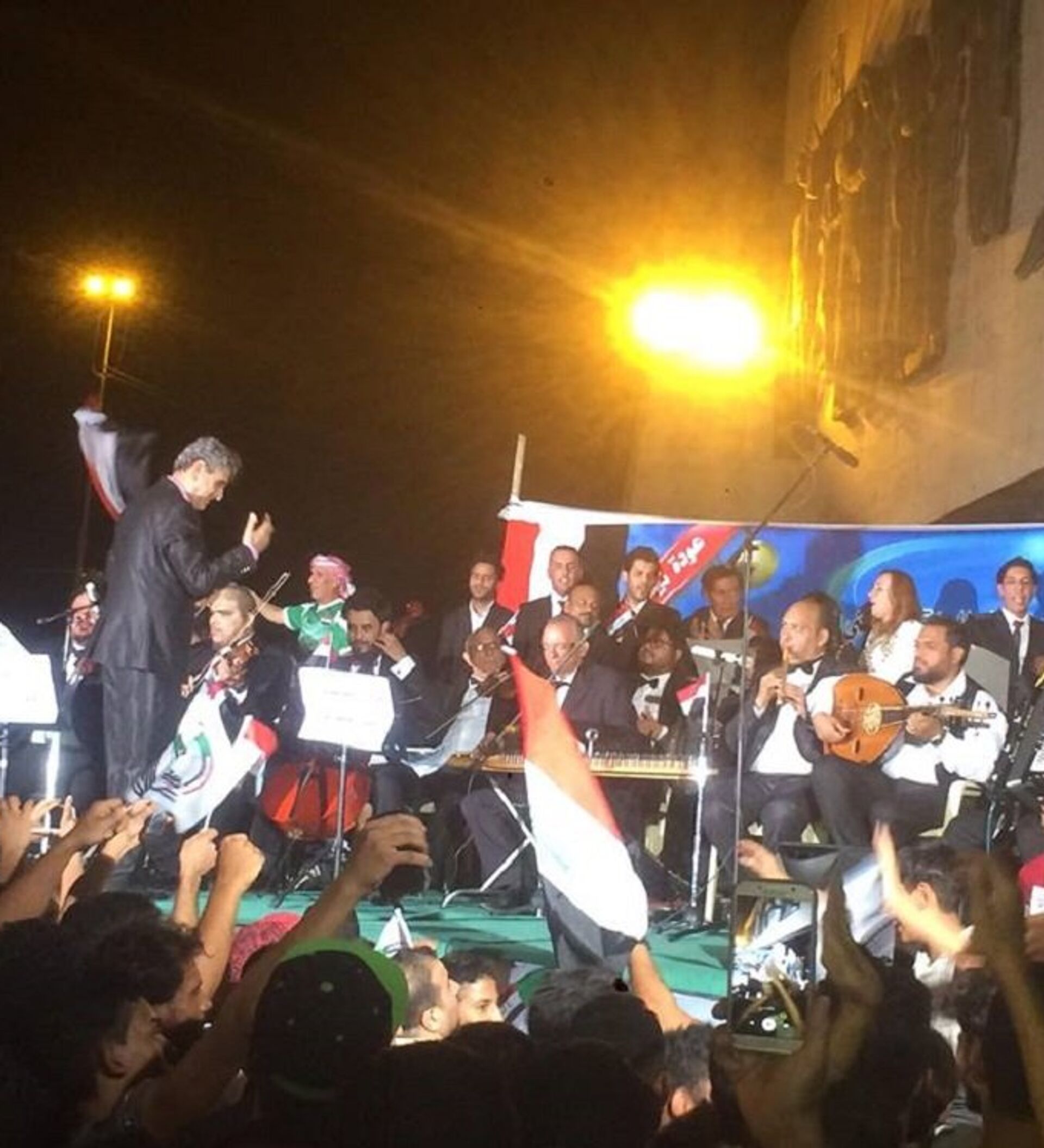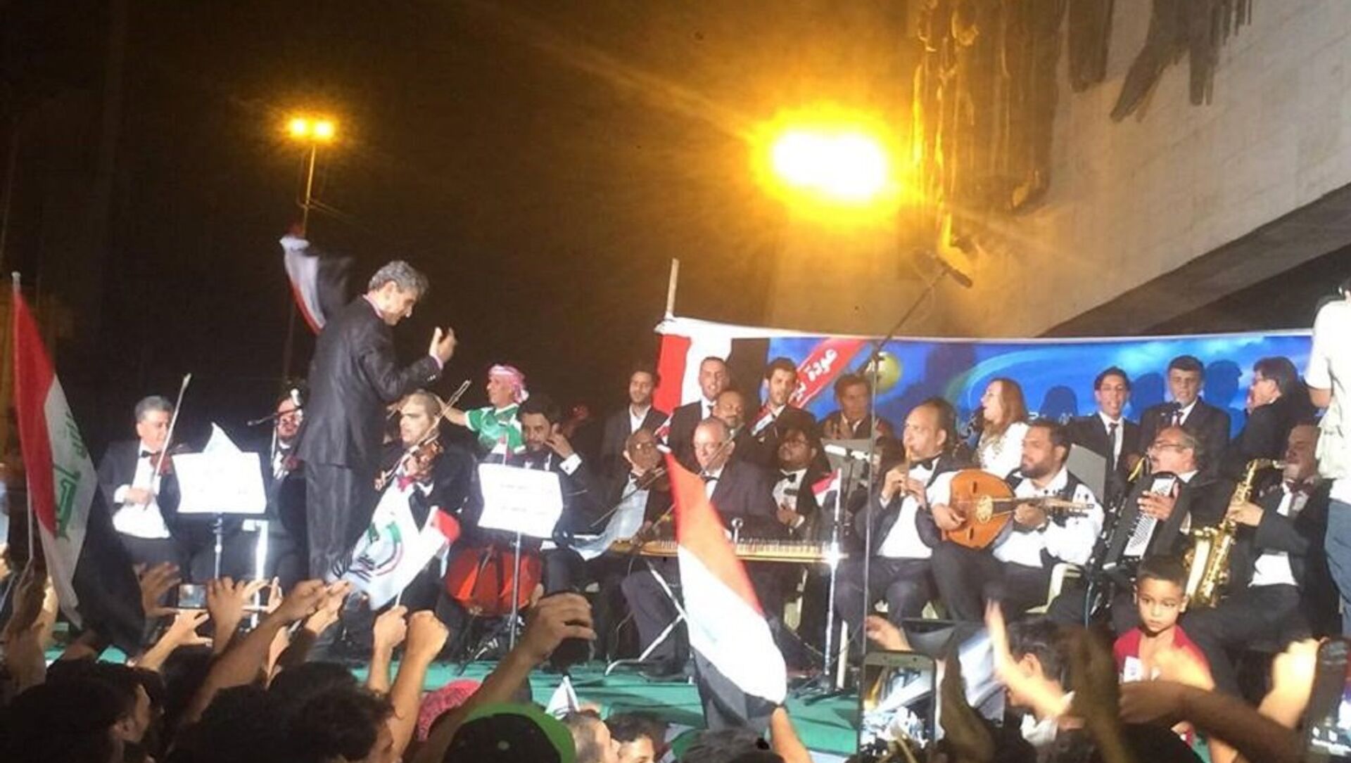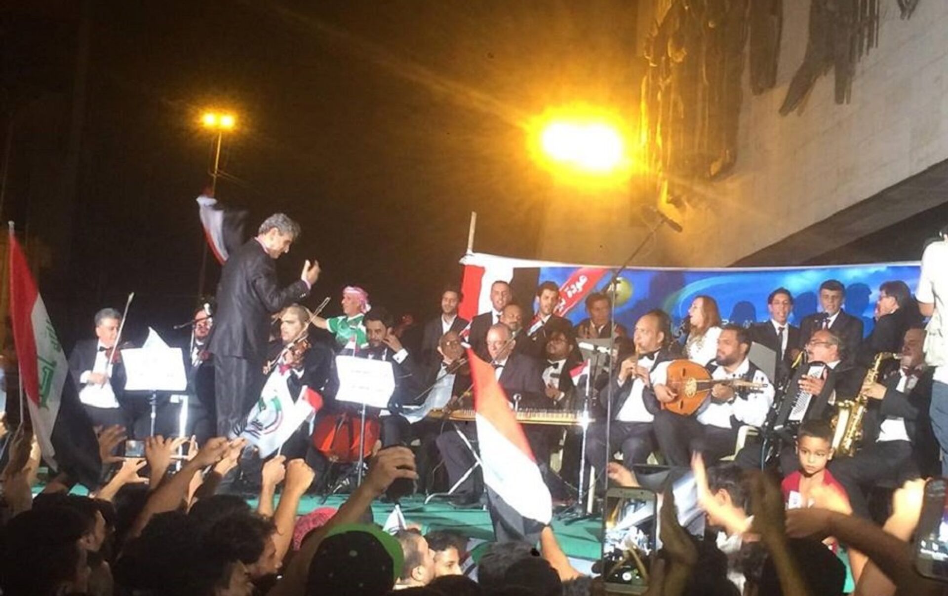 وقائد الموسيقي العراقي الكبير، علي خصاف فرقته للفنون الشعبية، لعزف مقطوعات موسيقية ساحرة تحت نصب الحرية في ساحة التحرير بقلب العاصمة بغداد، فرحاً بالانتصار الكبير على "داعش" الإرهابي في الموصل، مركز نينوى شمال العراق.