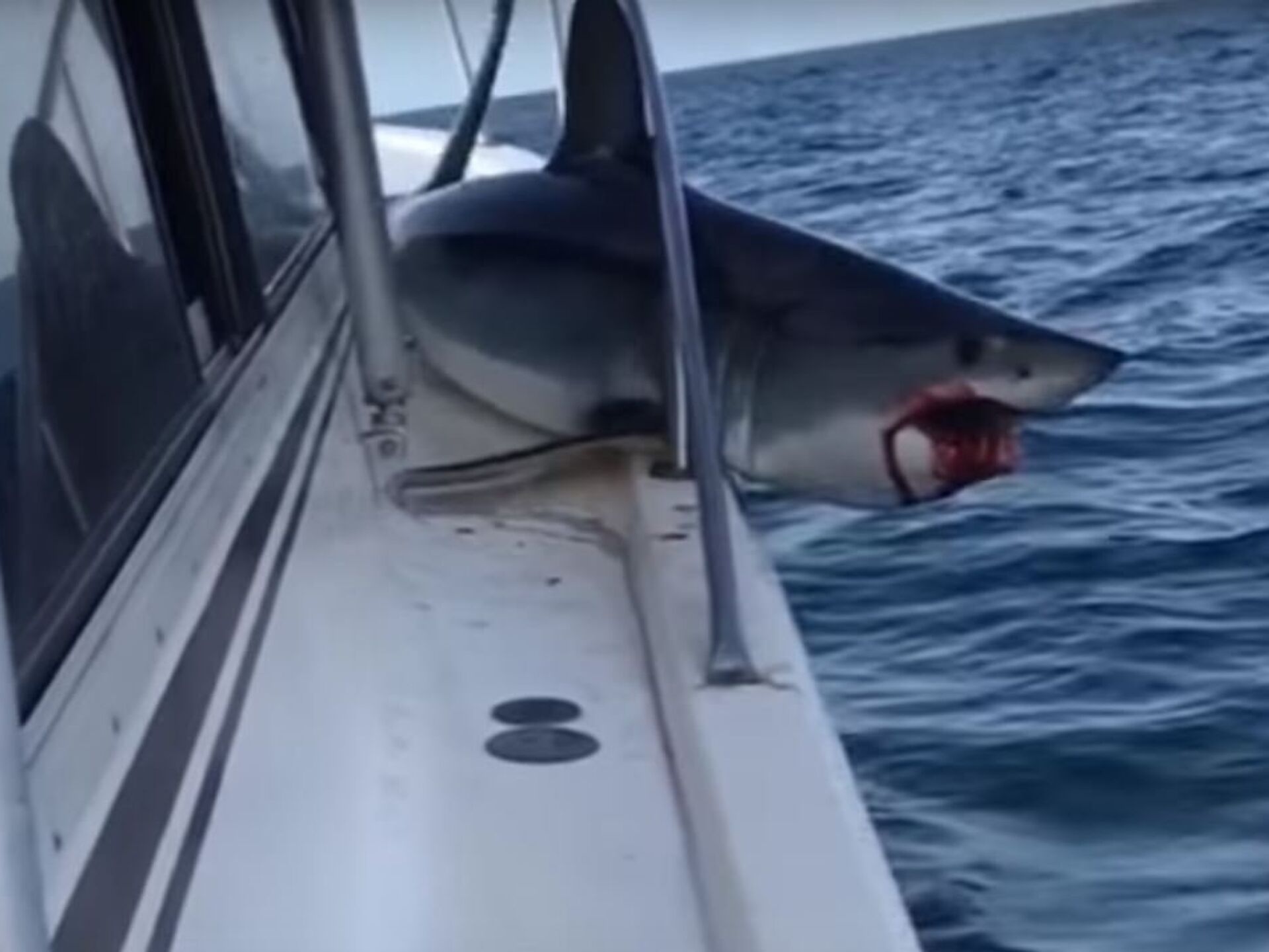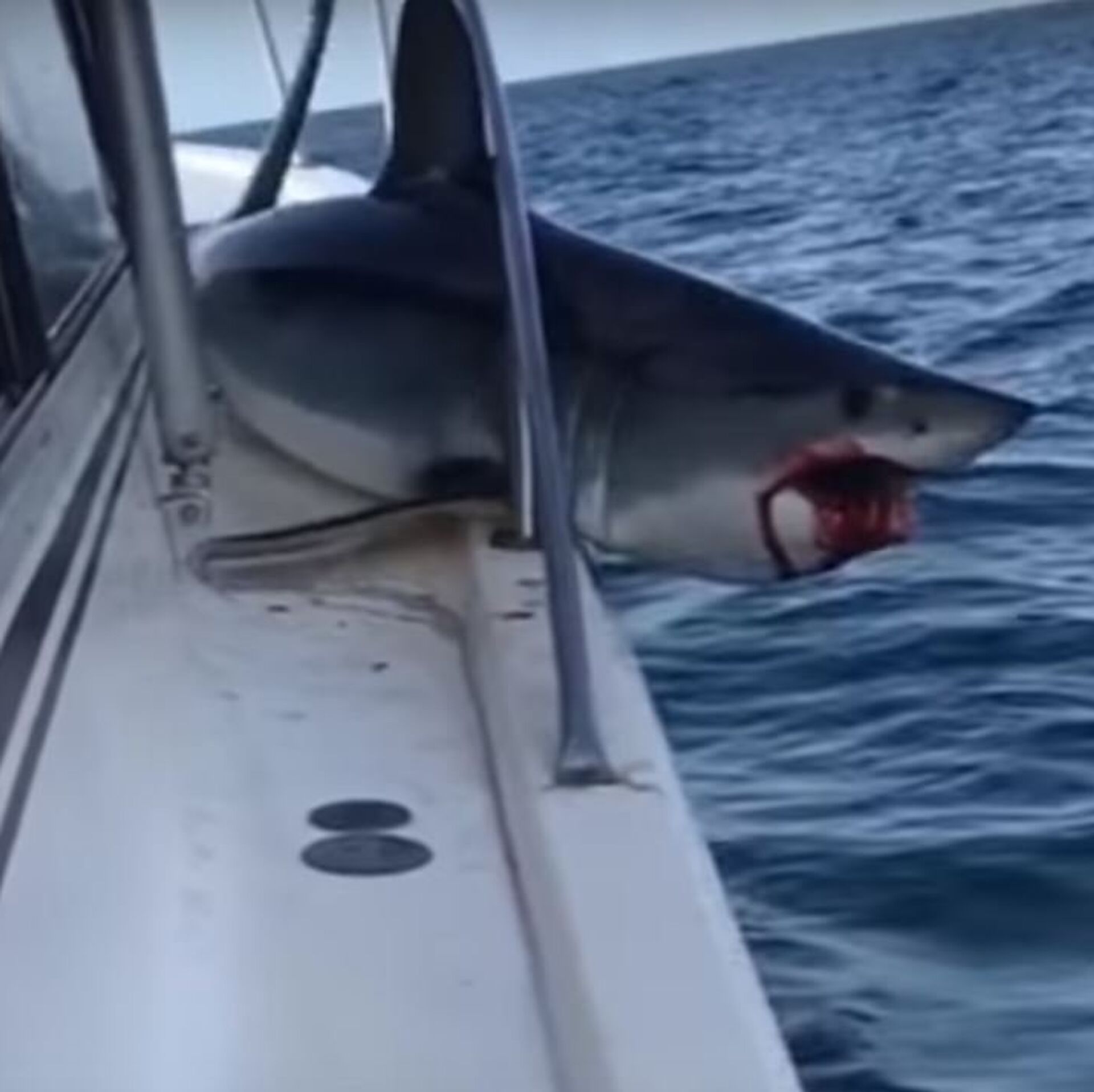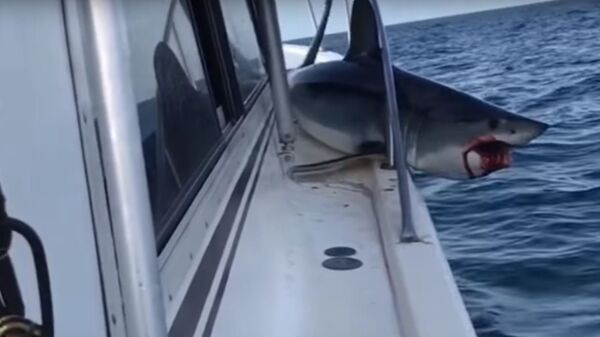 الفيديو الذي ألتقط قبالة سواحل لونج آيلاند في ولاية نيويورك الأمريكية، أظهر حالة الرعب التي أصابت الصياد لوجود سمكة القرش على سطح سفينته وجسمها محاصر بالحديد.