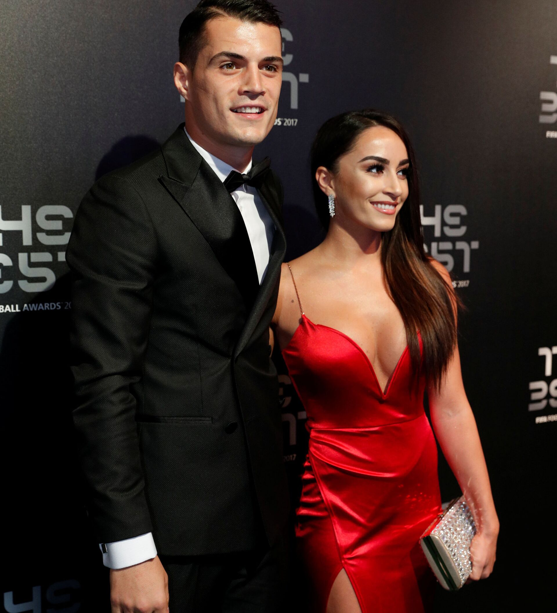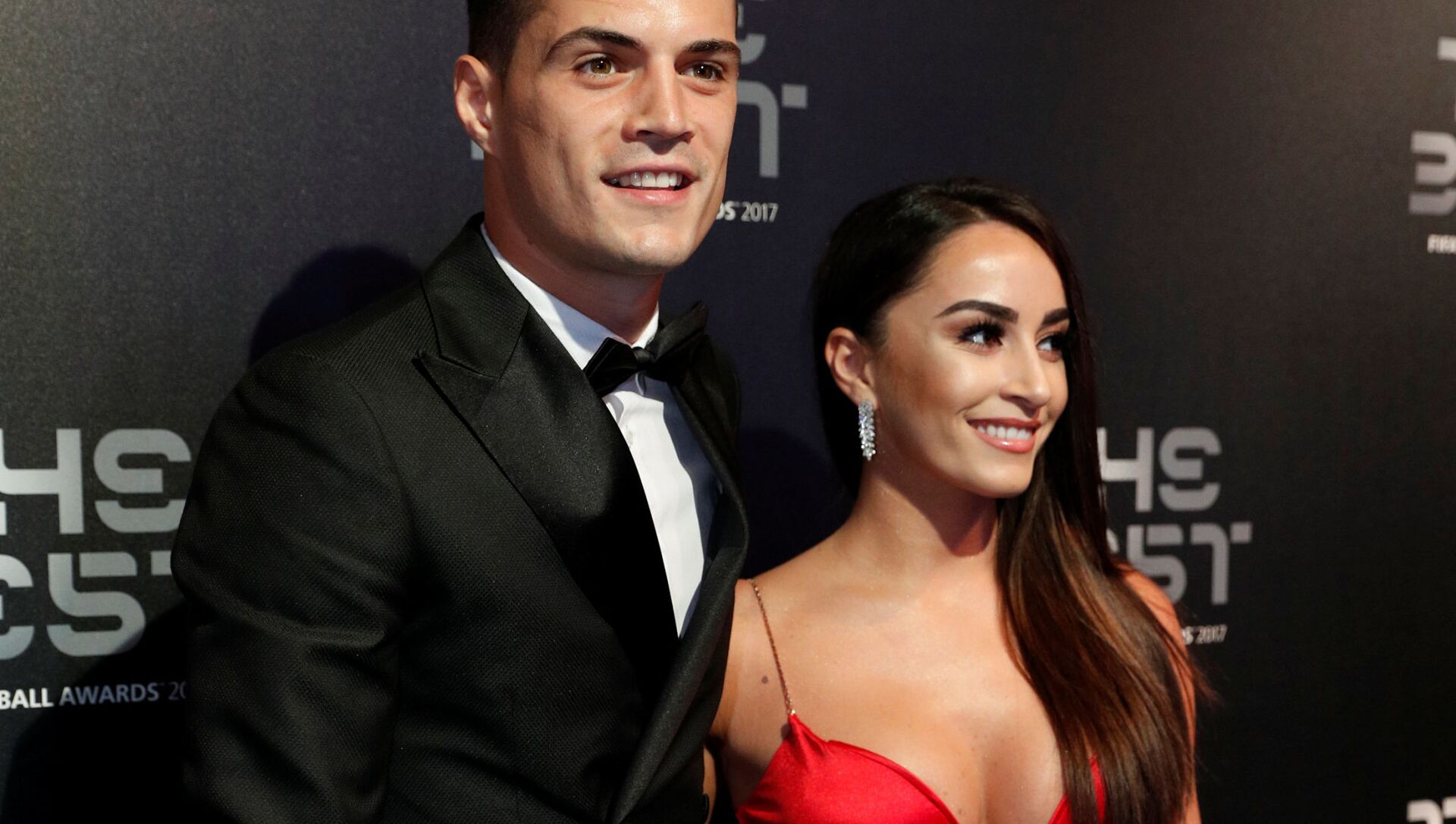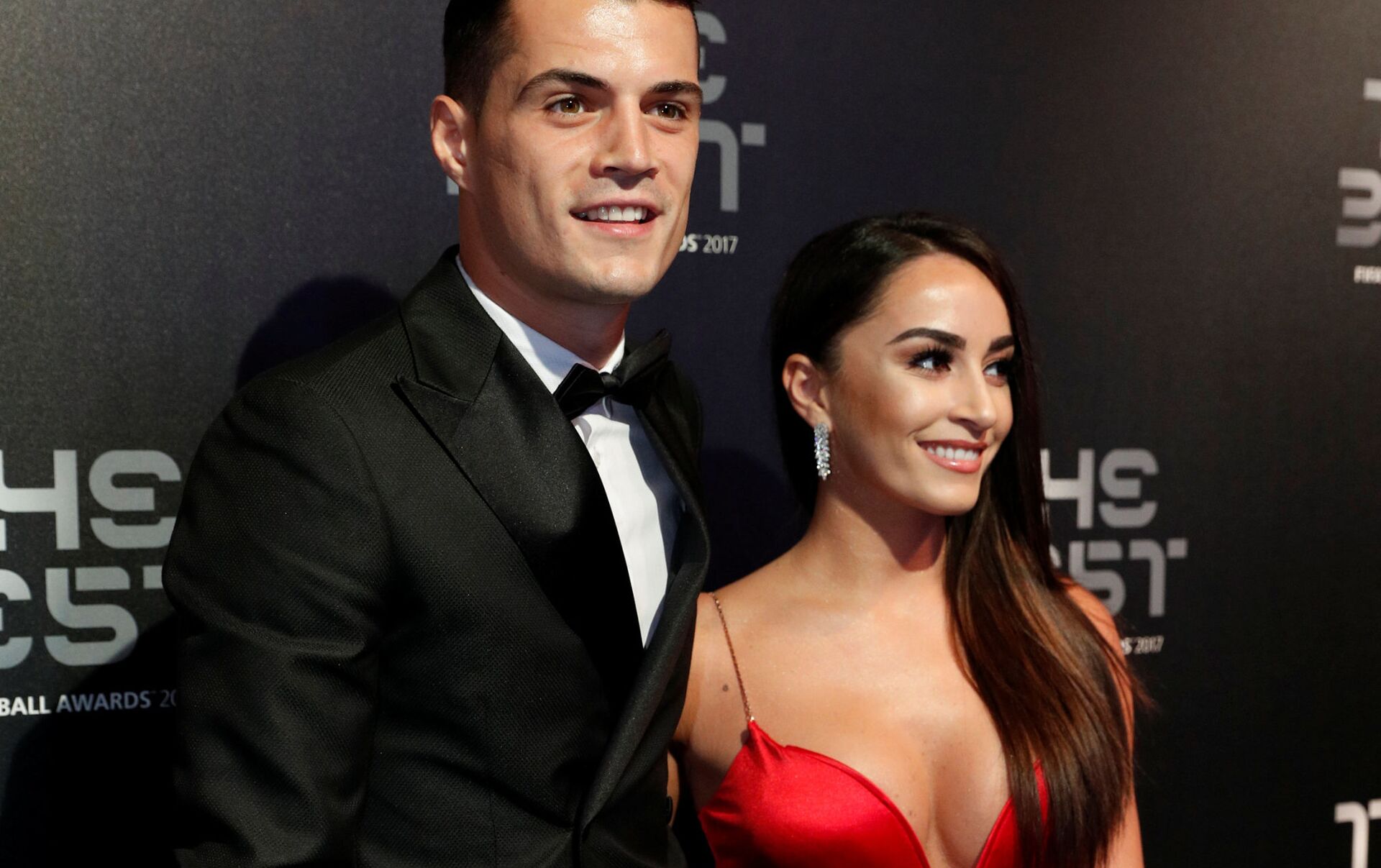 لاعب كرة قدم في فريق "أرسنال" غرانيت جاكا وزوجته ليونيتا ليكاج خلال حفل توزيع جائزة "الأفضل" في 2017 والمقدمة من الاتحاد الدولي لكرة القدم "فيفا" في لندن، بريطانيا 23 أكتوبر/ تشرين الأول 2017