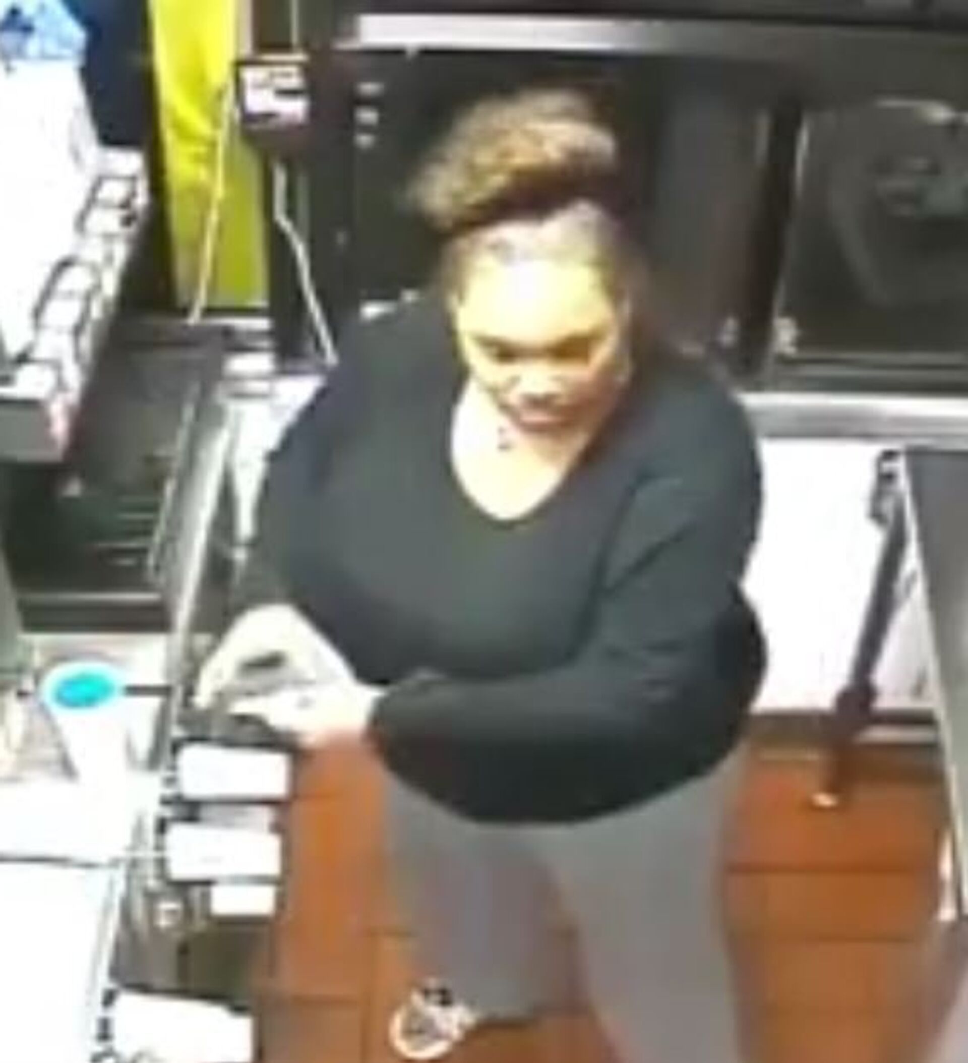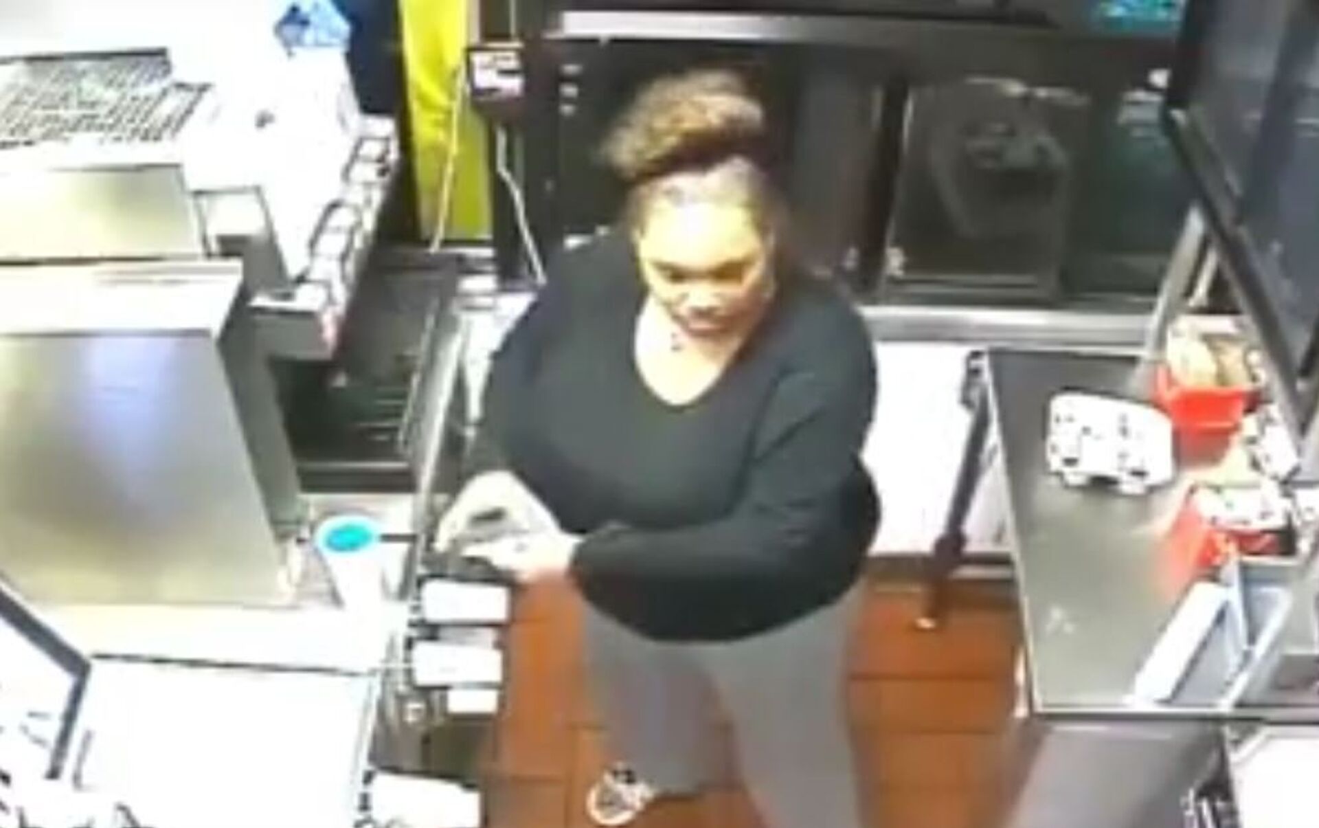 ويظهر مقطع الفيديو المرأة وهي تسكب لنفسها مشروبات غازية عبر النافذة، ومن ثم تدخل إلى داخل المطعم وتسرق علبة من المأكولات وتفر. وتبحث الشرطة عن المشتبه بها في المقاطعة.
