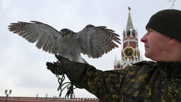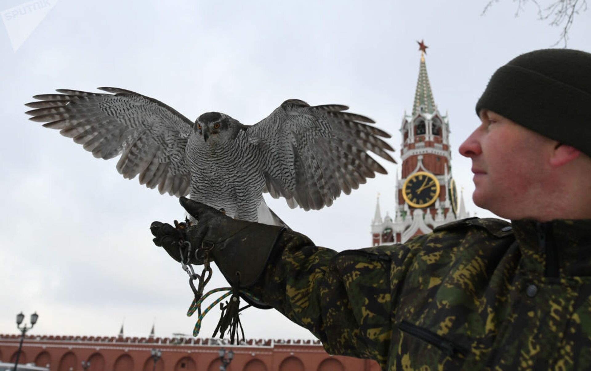 جندي يمسك صقرا من "طيور حرس الكرملين"