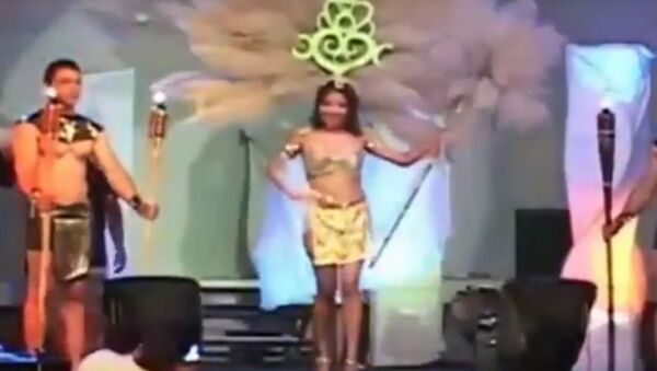 احترق رأس فتاة ترتدي تاجا من ريش كبير رمادي اللون، أثناء أدائها عرضا ترفيهيا أمام الجمهور.