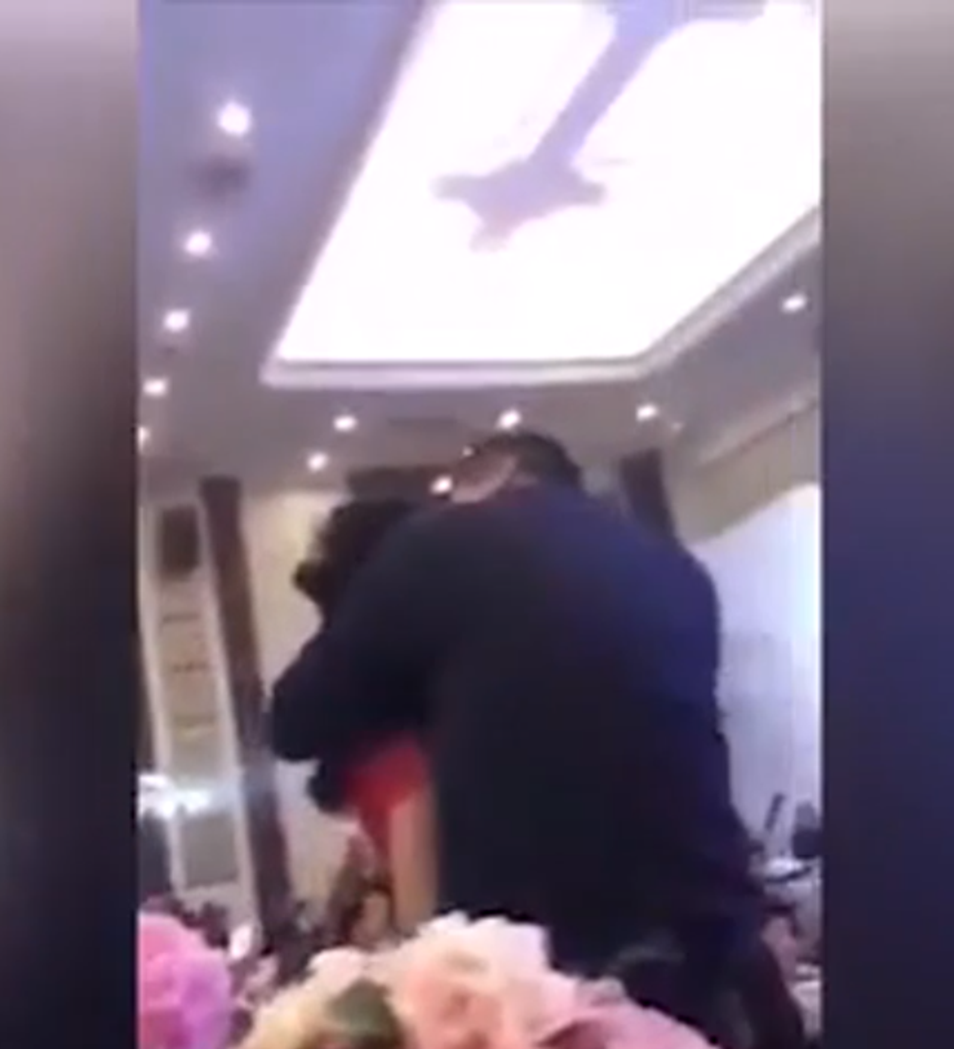 واندفع والد العريس فجأة تجاه العروس وبدأ يقبلها من فمها، وهي تحاول الهروب لكن دون جدوى، عندها توجه أقارب العروس لمساعدتها.
