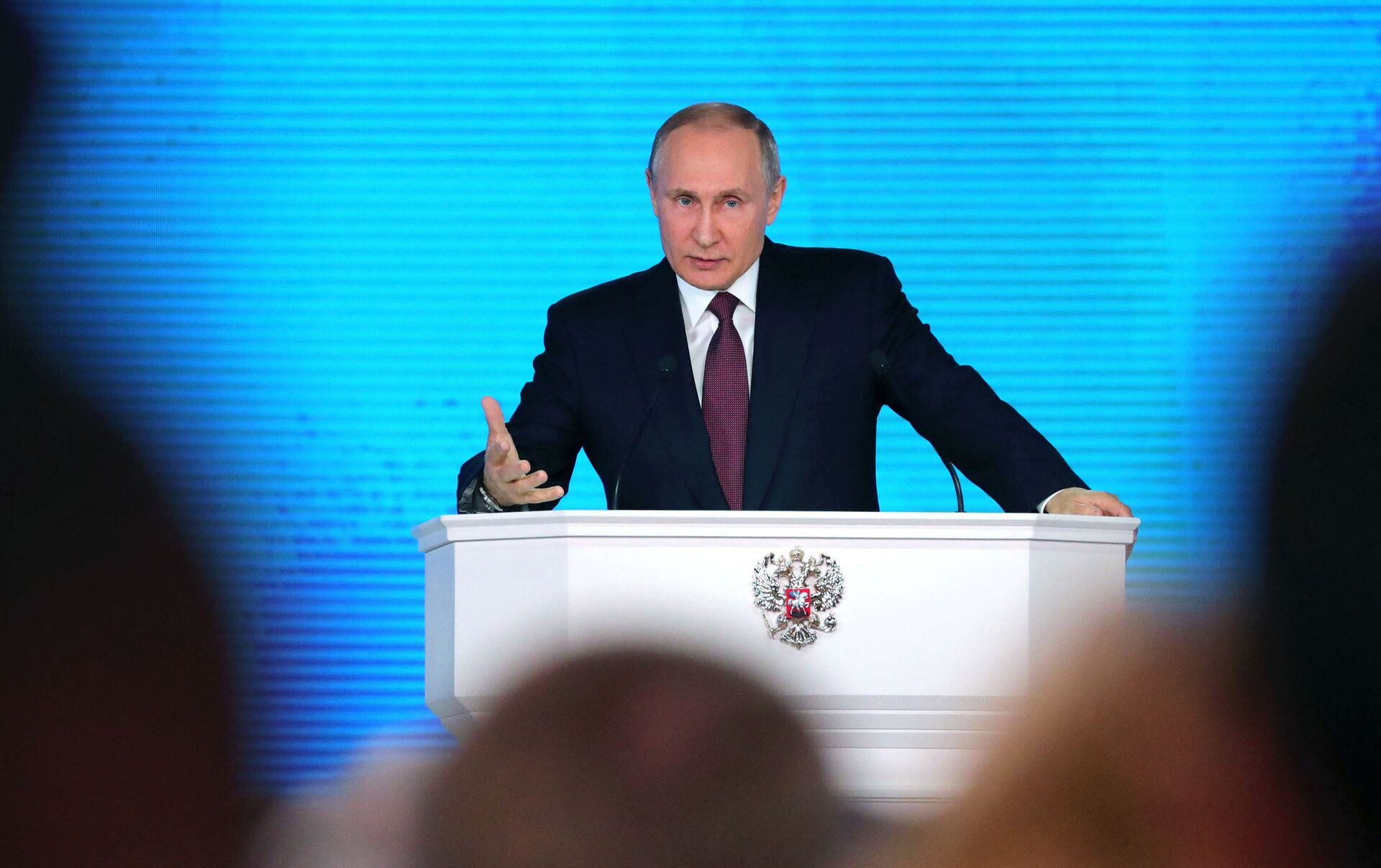 الرئيس فلاديمير بوتين خلال الرسالة السنوية أمام الجمعية الفيدرالية في قاعة مانيج، موسكو، 1 مارس/ آذار 2018 - سبوتنيك عربي
