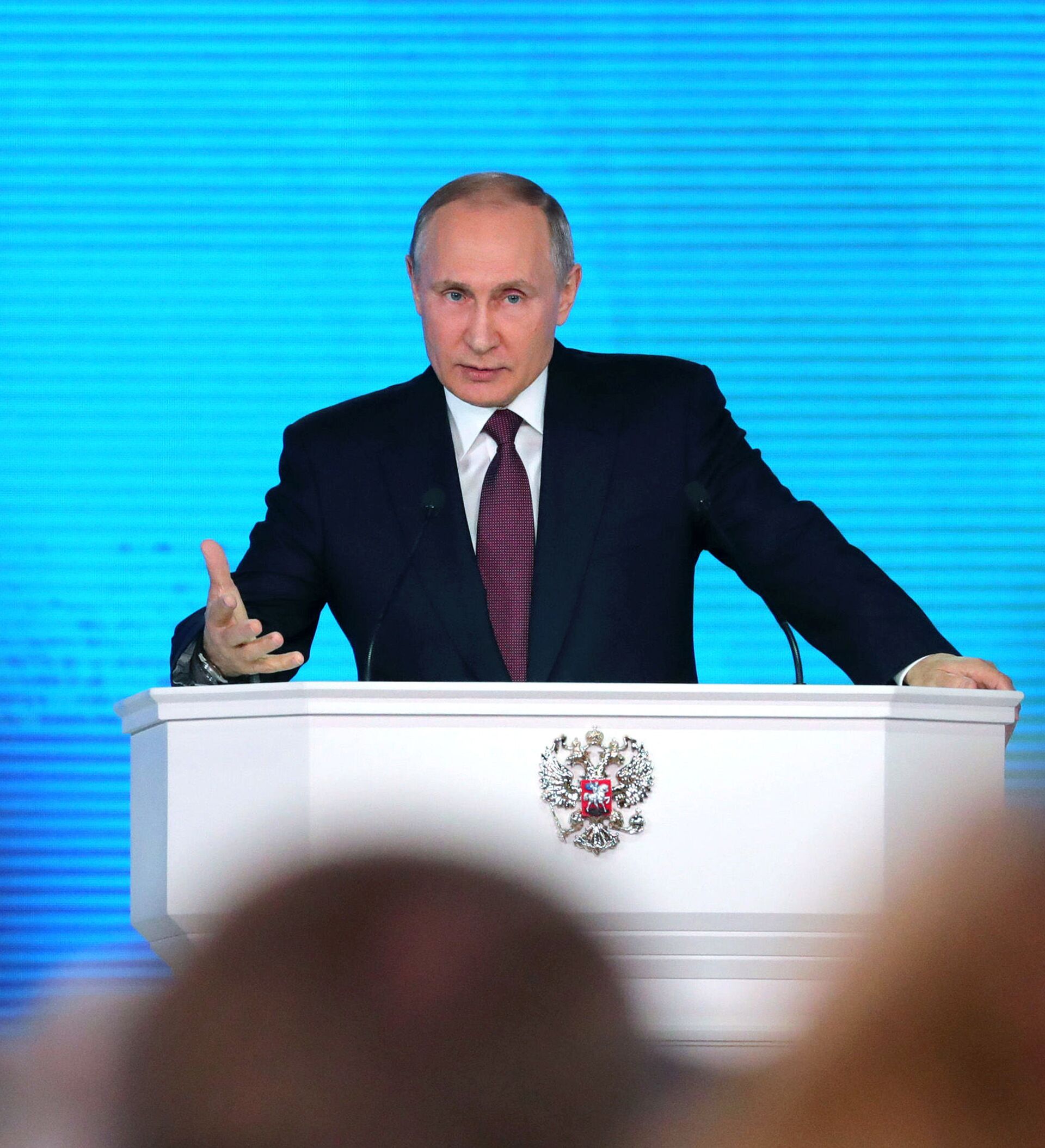 الرئيس فلاديمير بوتين خلال الرسالة السنوية أمام الجمعية الفيدرالية في قاعة "مانيج"، موسكو، 1 مارس/ آذار 2018