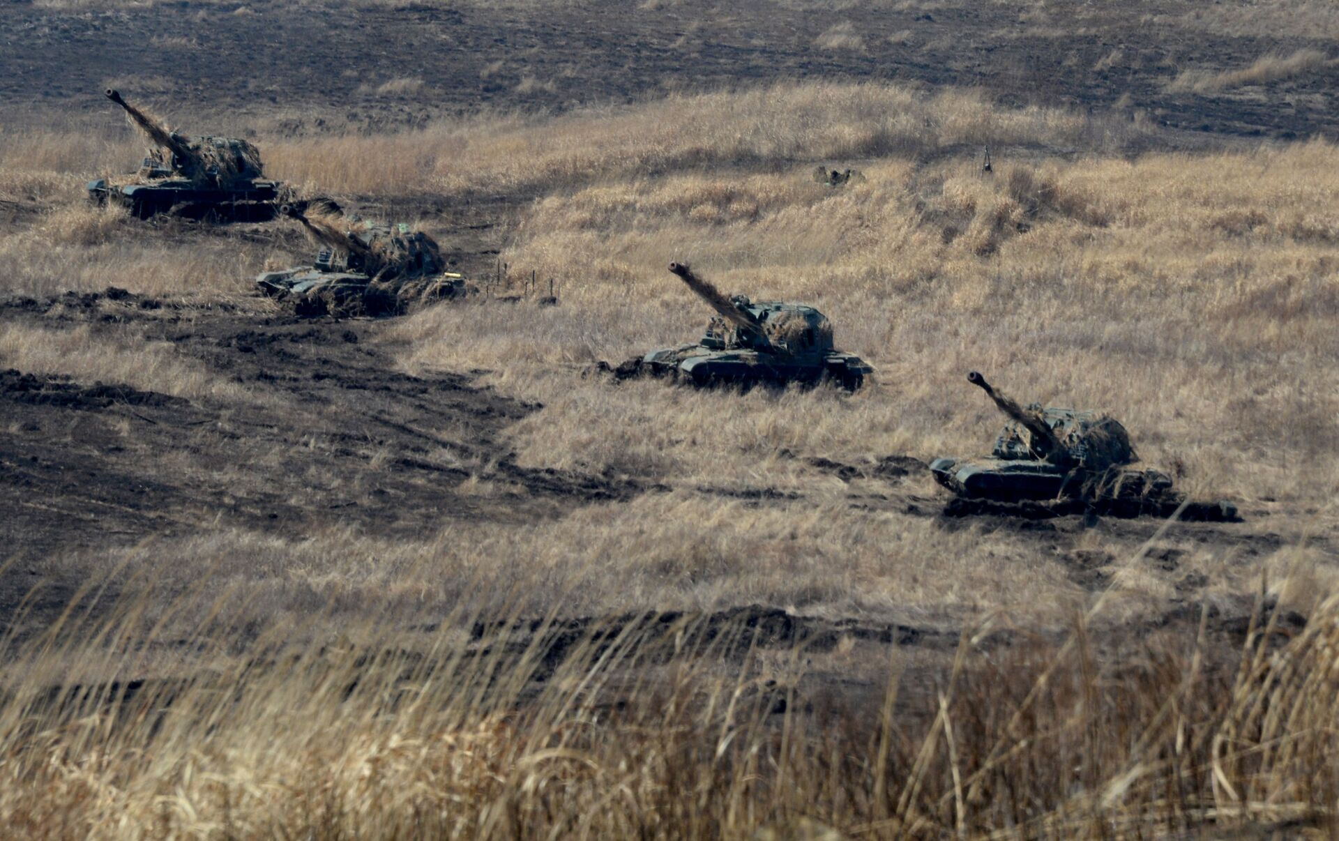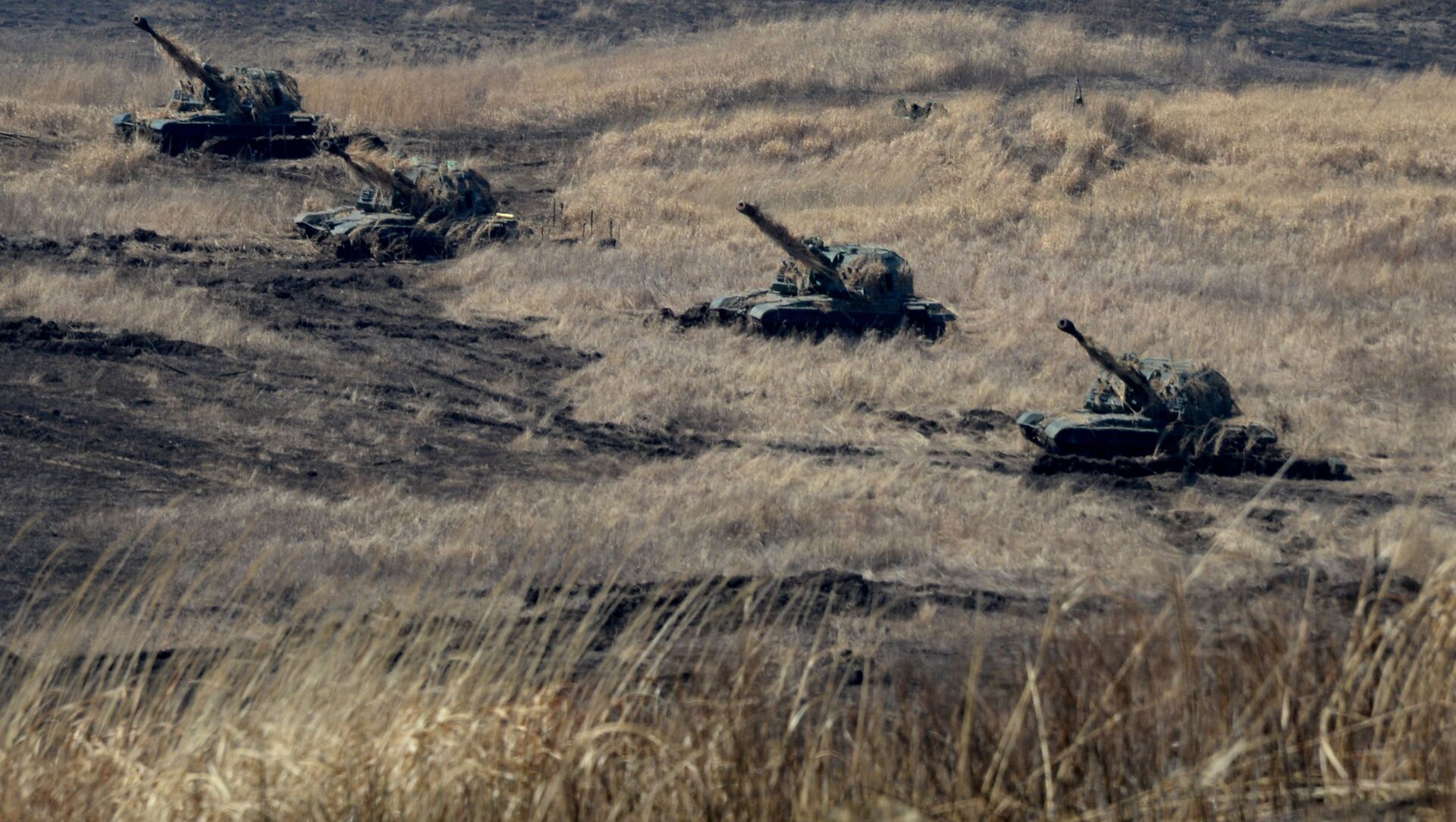 بطاريات مدافع الهاوتزر ذاتية الدفع مستا إس MSTA-S في حالة الهجوم إطلاق النار أثناء تدريبات أسطول المحيط الهادئ في إقليم بريمورسكي. - سبوتنيك عربي