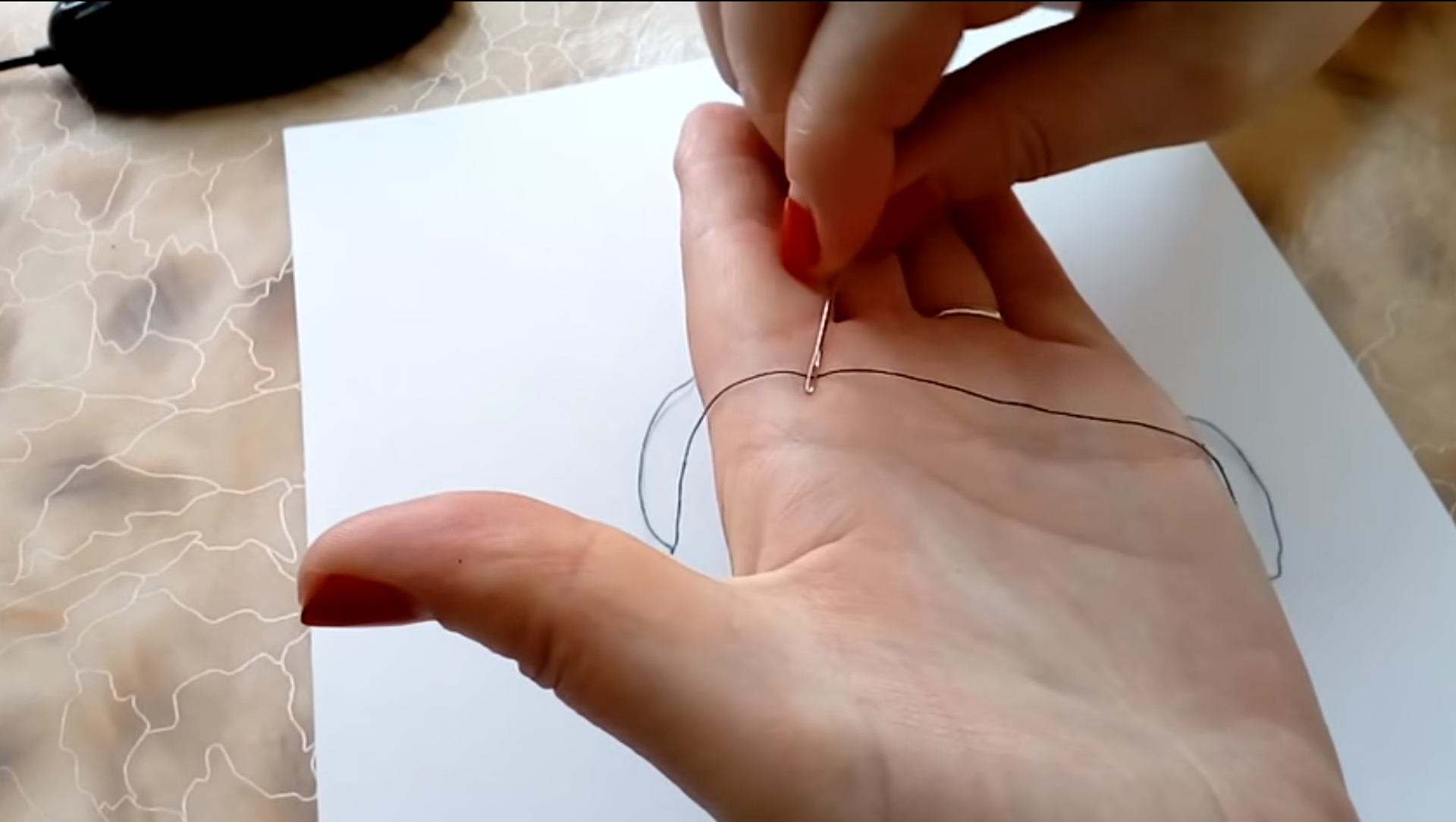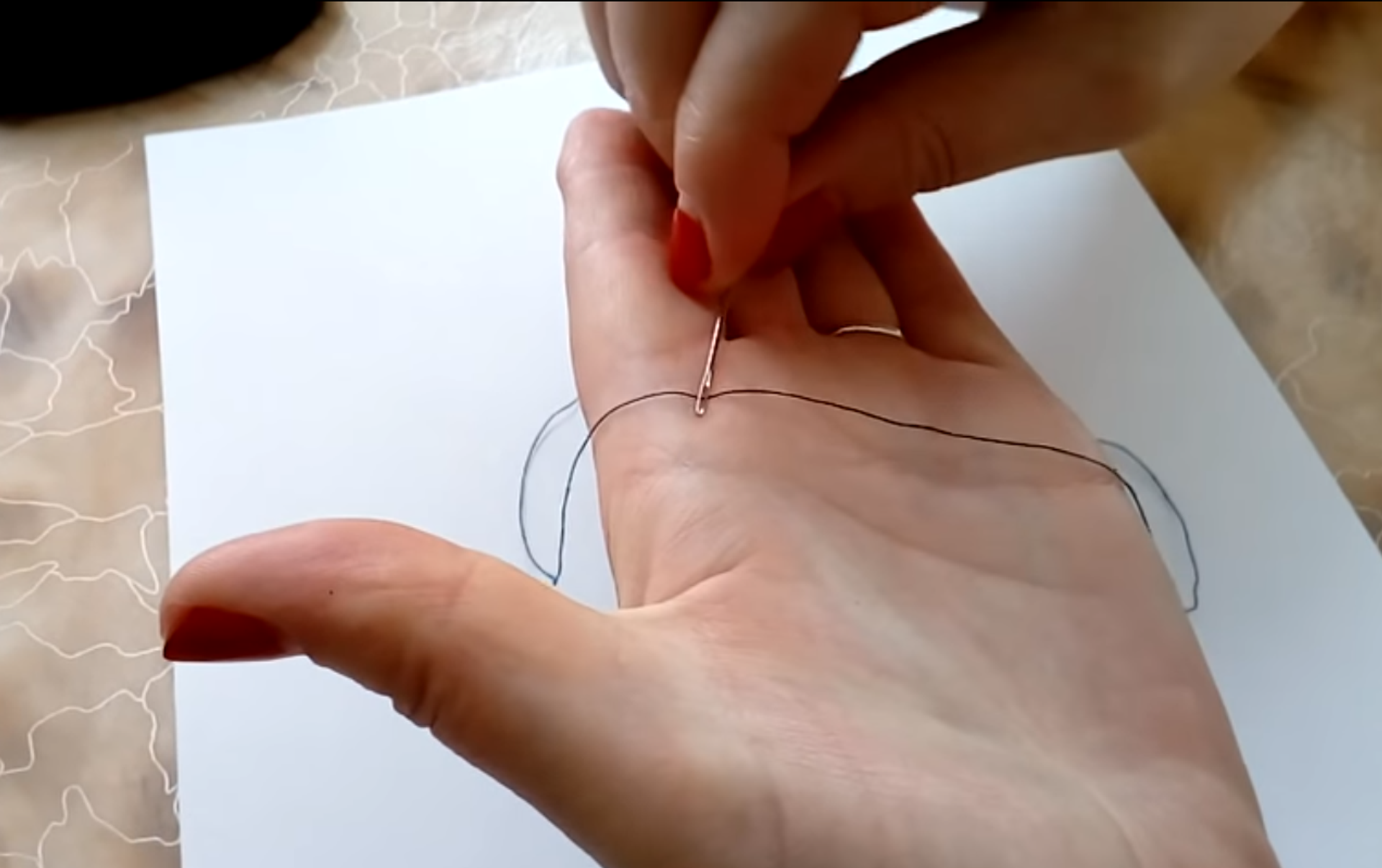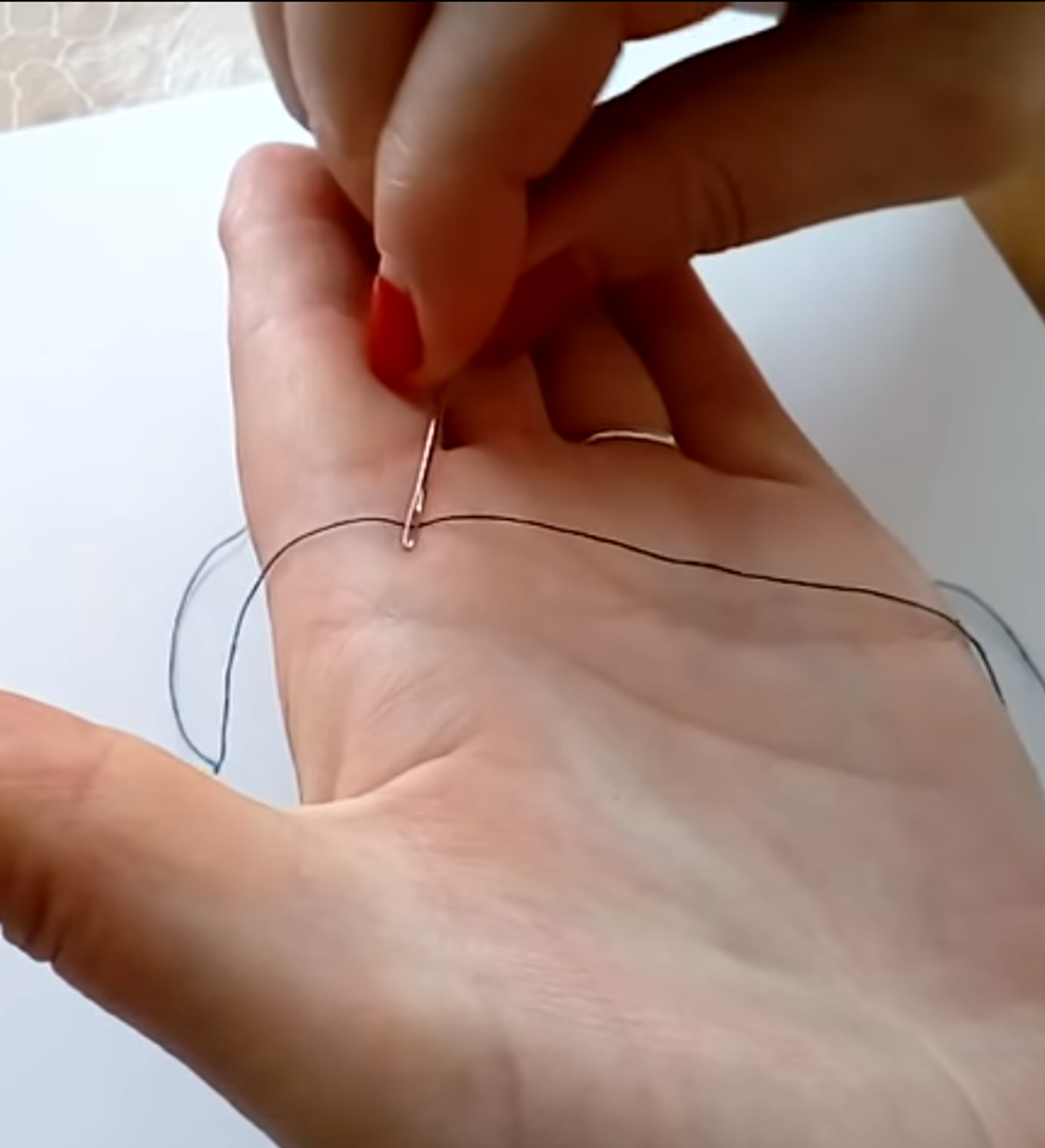 ولكي تتمكن من إدخال الخيط داخل الإبرة بكل سهولة، يجب عليك وضع الخيط على كف يدك، ثم تبدأ بفرك الإبرة بالخيط كما هو موضح في الفيديو.