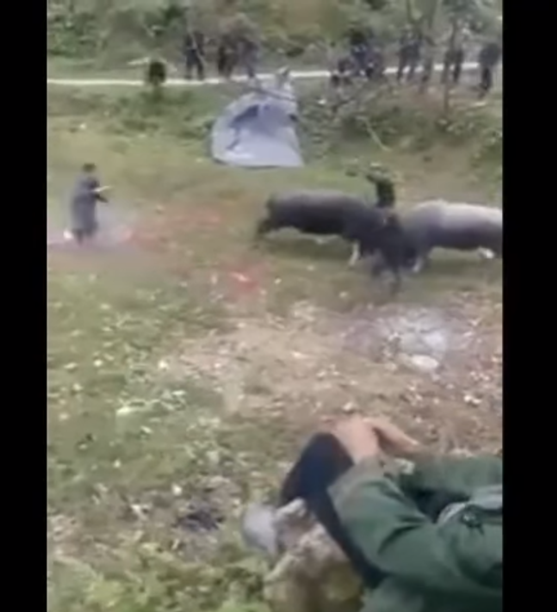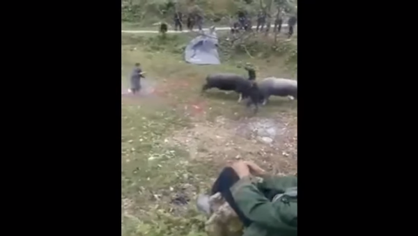 ووقعت الحادثة في إحدى الساحات في الصين، فيما لم يتمكن الرجل من الهروب من بين الثورين الغاضبين، بينما حاول الأشخاص الموجودين هناك مساعدته من خلال إبعادهما عنه.