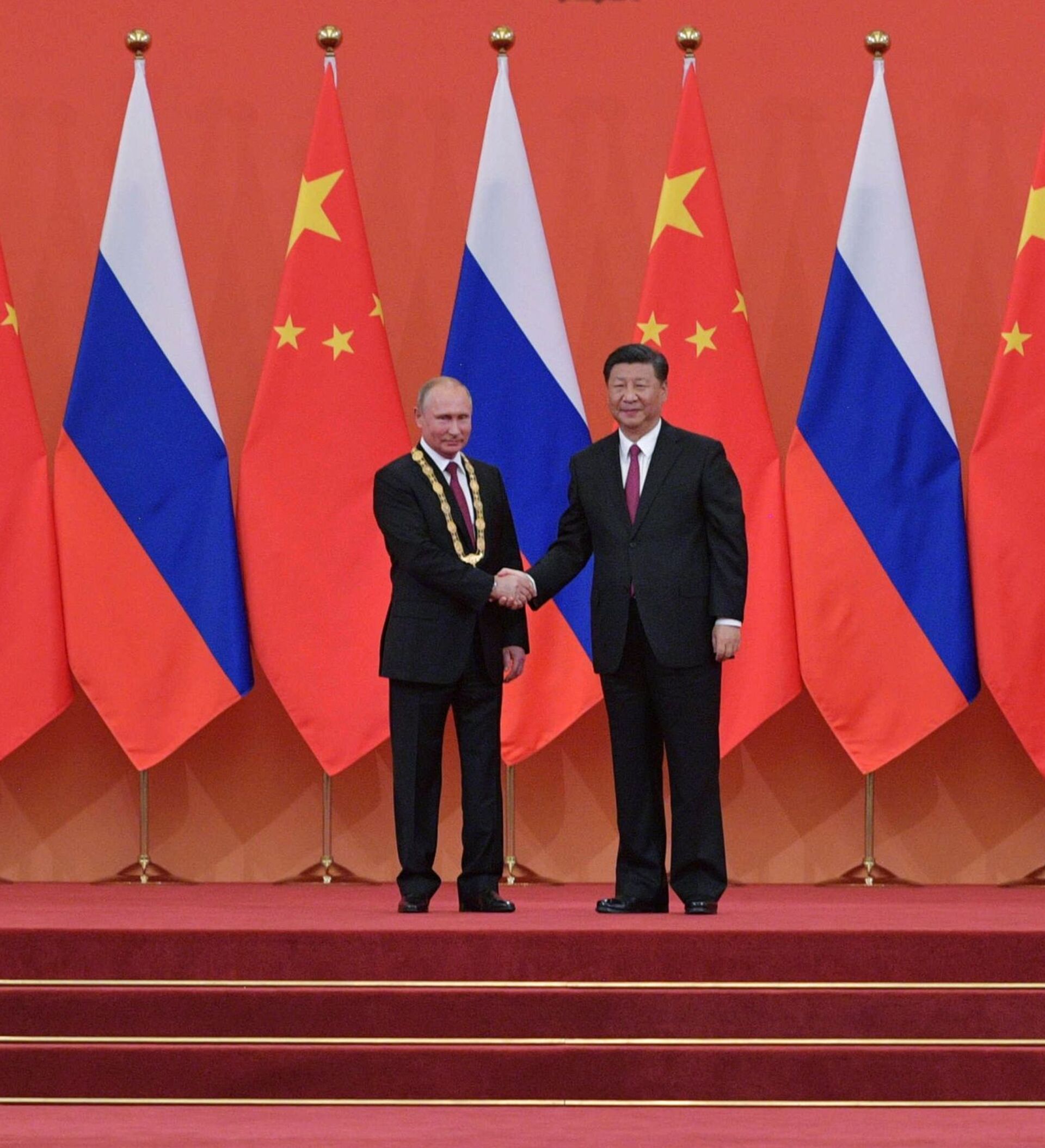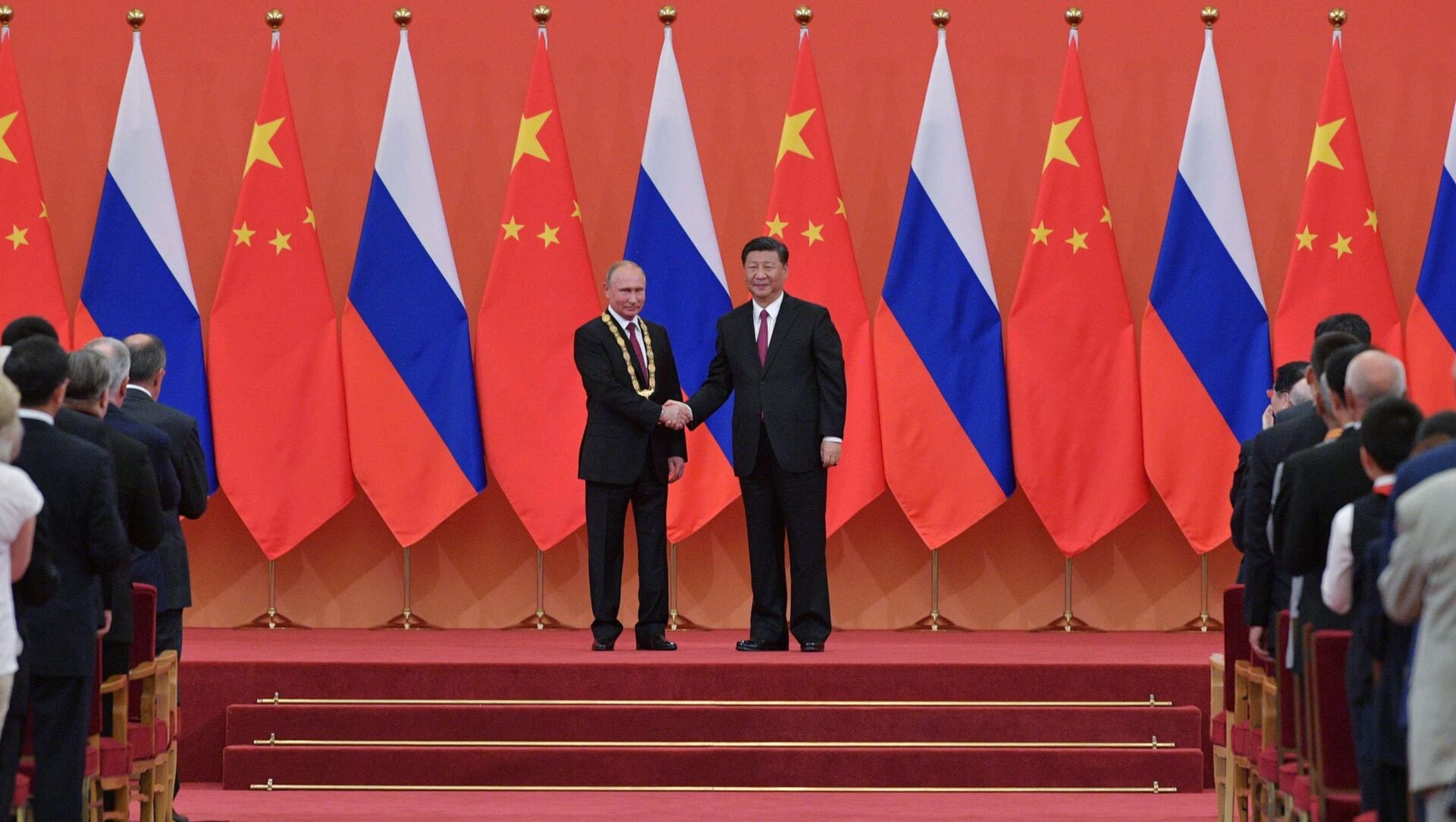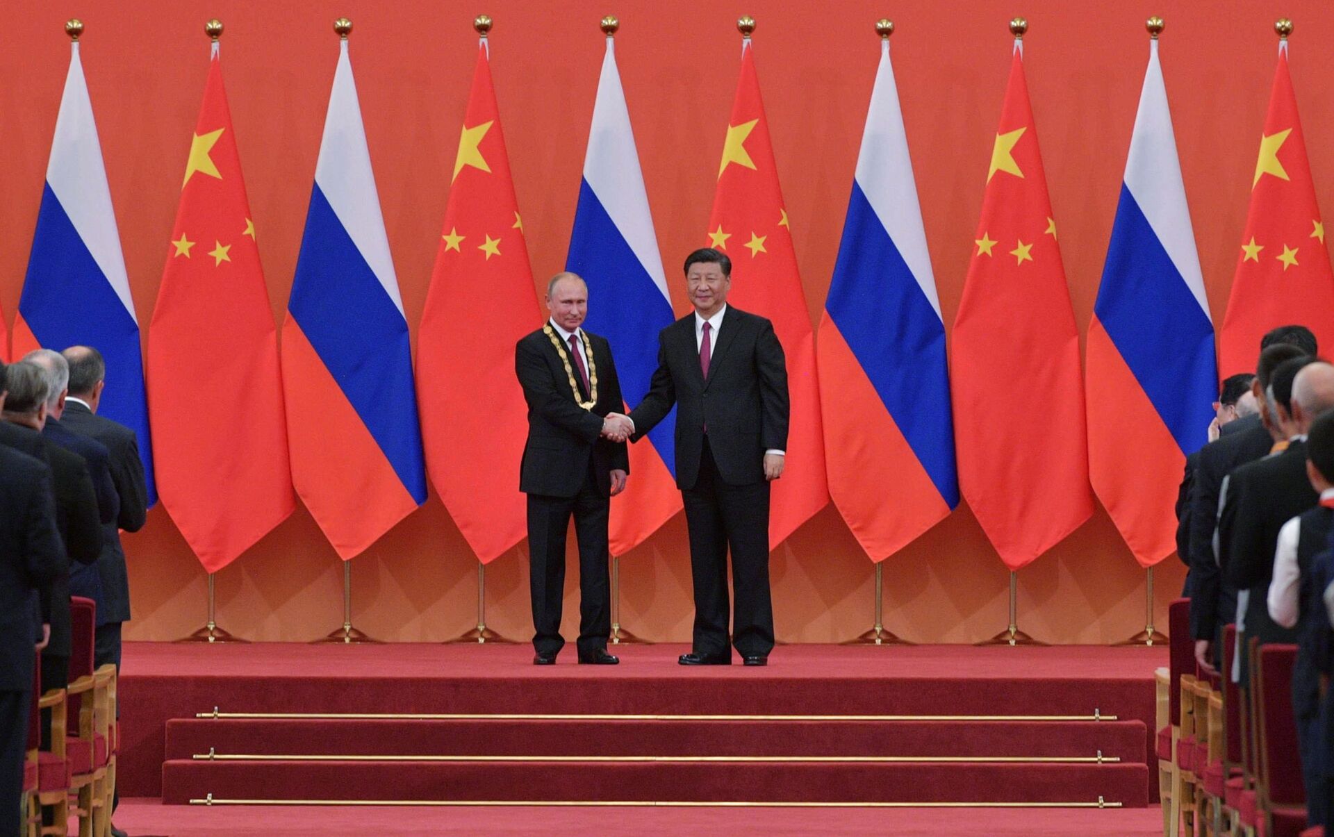 © Sputnik . Alexei Druzhinin / الانتقال إلى بنك الصورالرئيس الروسي فلاديمير بوتين والرئيس الصيني شى جين بينغ خلال اللقاء في الصين