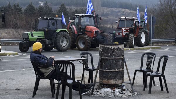مزارع يوناني يجلس بجوار جراره لليوم الرابع احتجاجاً على سياسة خفض الدخل، اليونان 2 فبراير/ شباط 2017 - سبوتنيك عربي