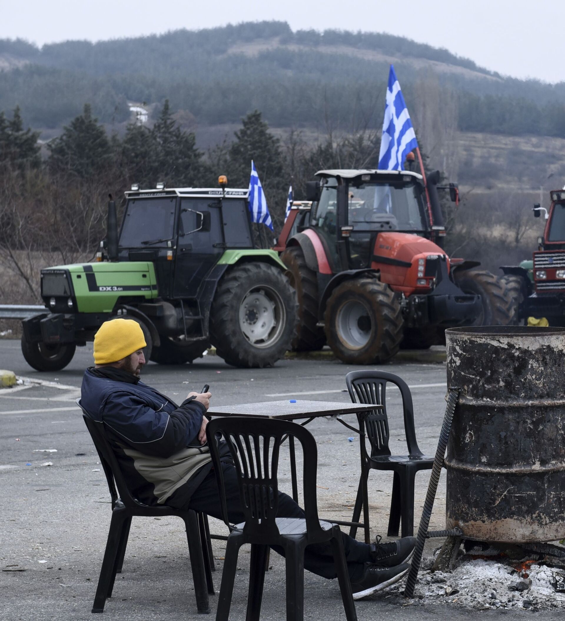 © AP Photo / Giannis Papanikosمزارع يوناني يجلس بجوار جراره لليوم الرابع احتجاجاً على سياسة خفض الدخل، اليونان 2 فبراير/ شباط 2017