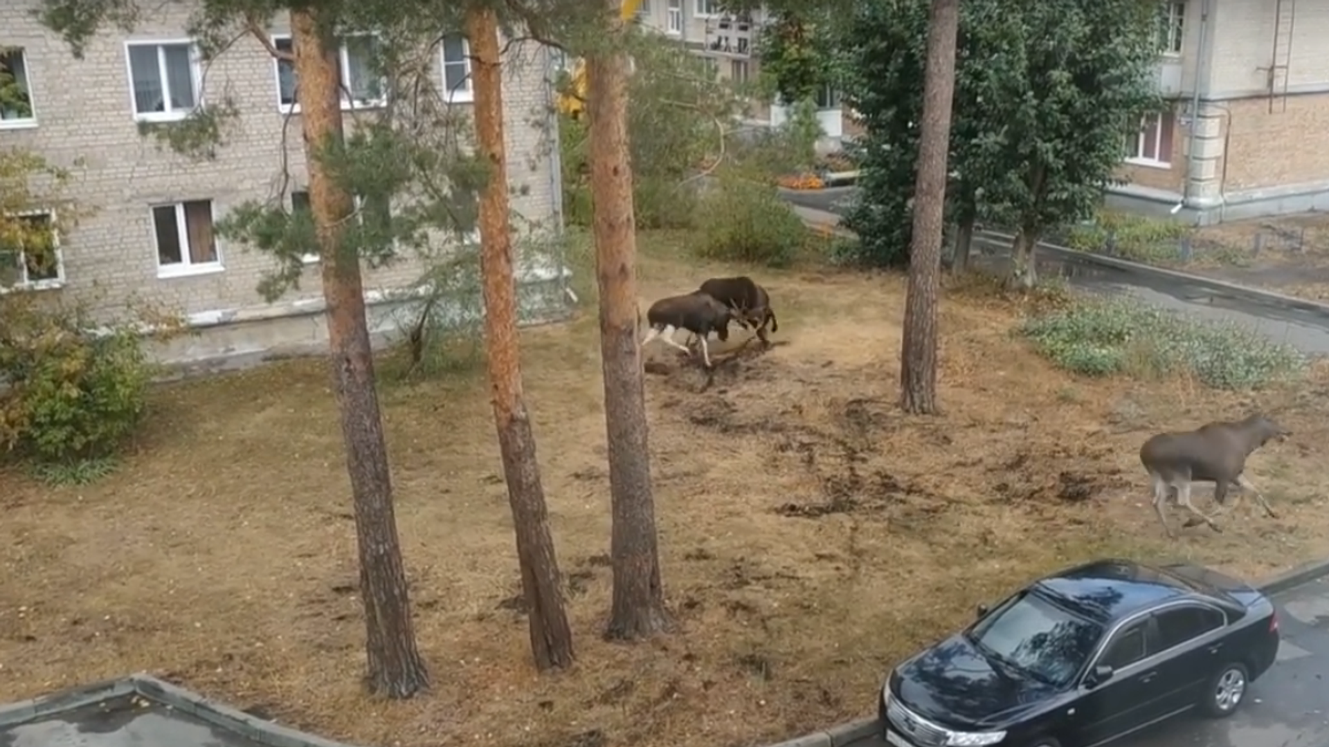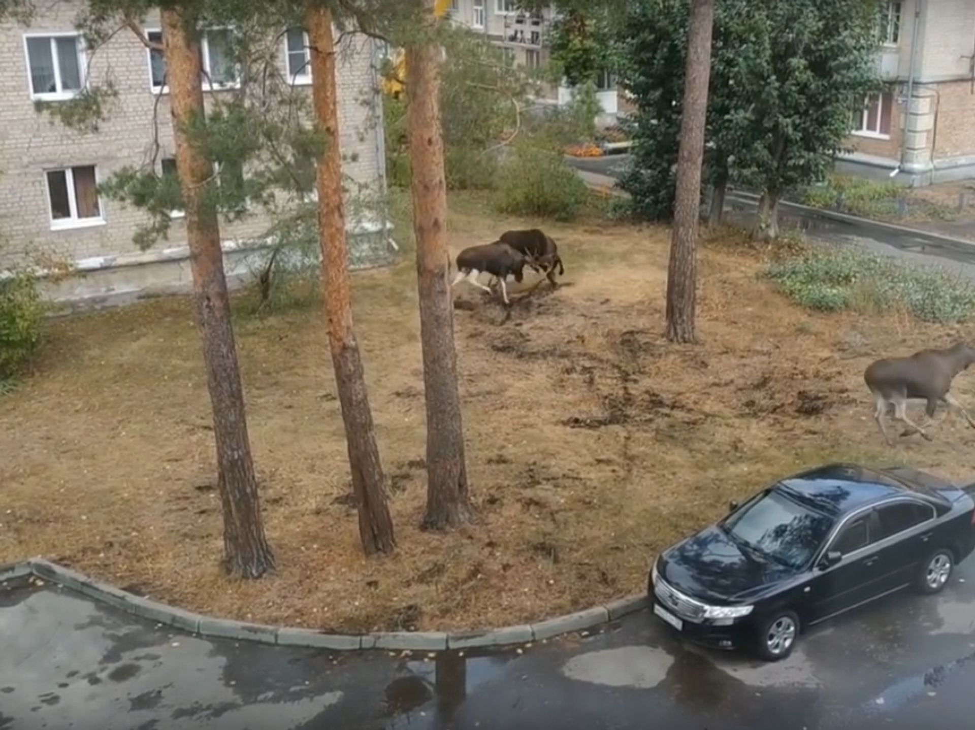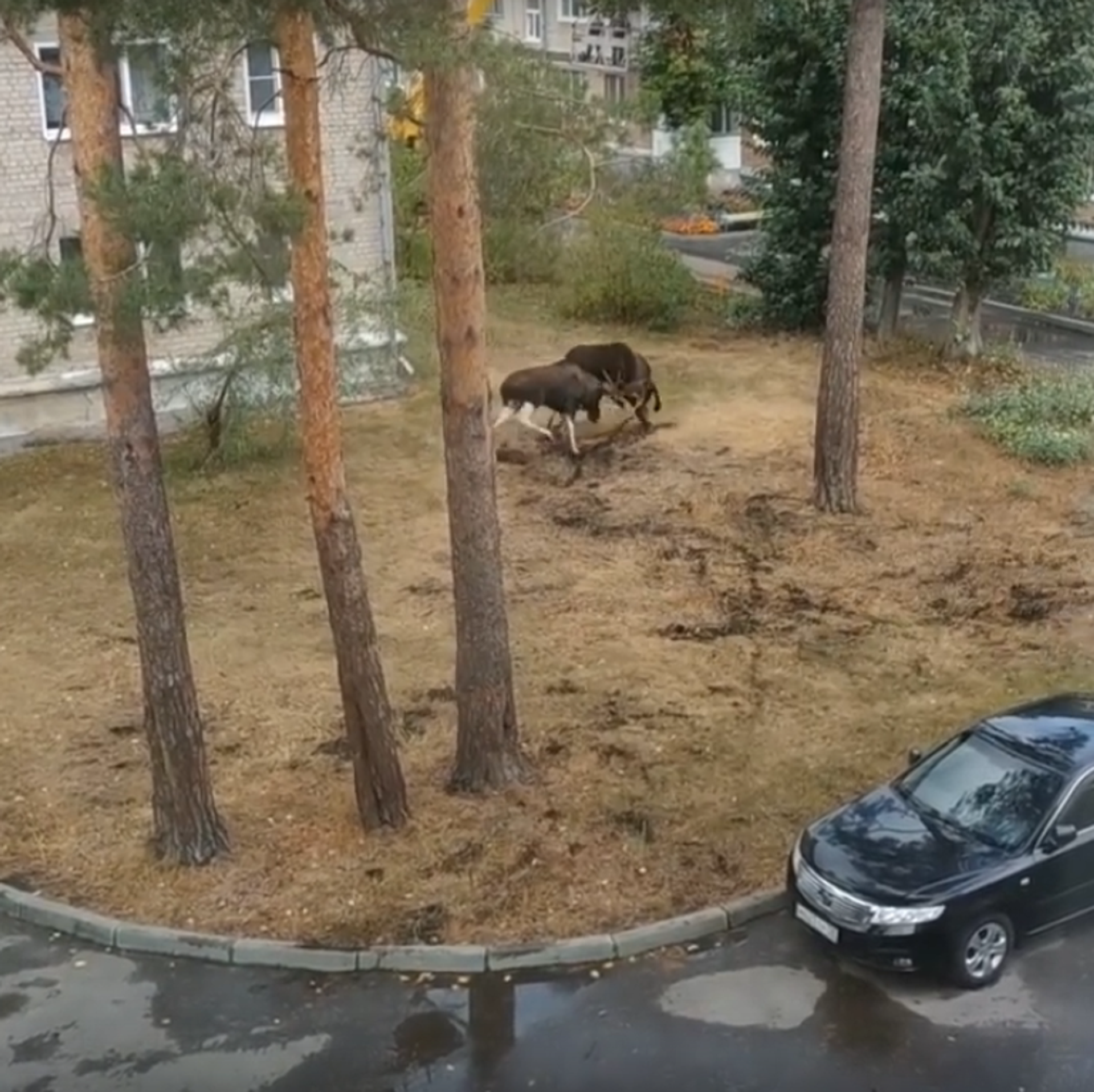 المعركة بين ذكري الموظ شهدت صراعا في حديقة ضمن حي سكني، ولم تعبأ الحيوانات بتواجد بعض سكان الحي.