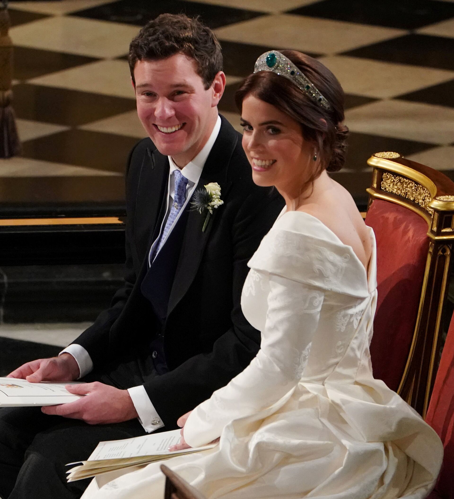 Princess Eugenie looks stunning as👰🏼We were pretty spot on with our dress prediction! Dress designed by Peter Pilotto & Christopher De Vos with a delicate brocade fabric, wide shoulder deep v neckline and long train, with no veil and the Queens Emerald tiara 👸🏻 #royalwedding pic.twitter.com/g62VTe0UOX