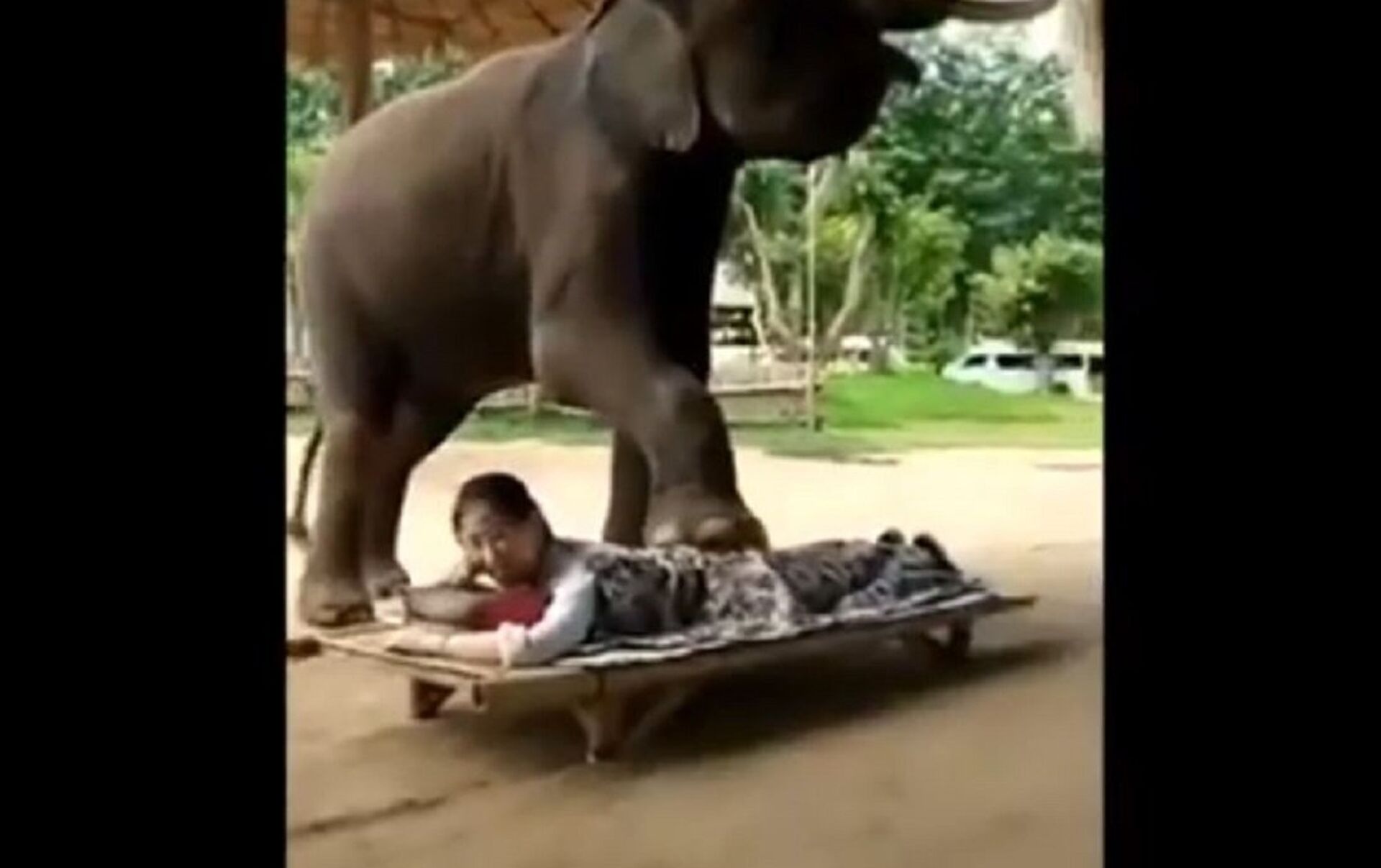بالفيديو... فتاة تجرب مساجا تحت أقدام فيل