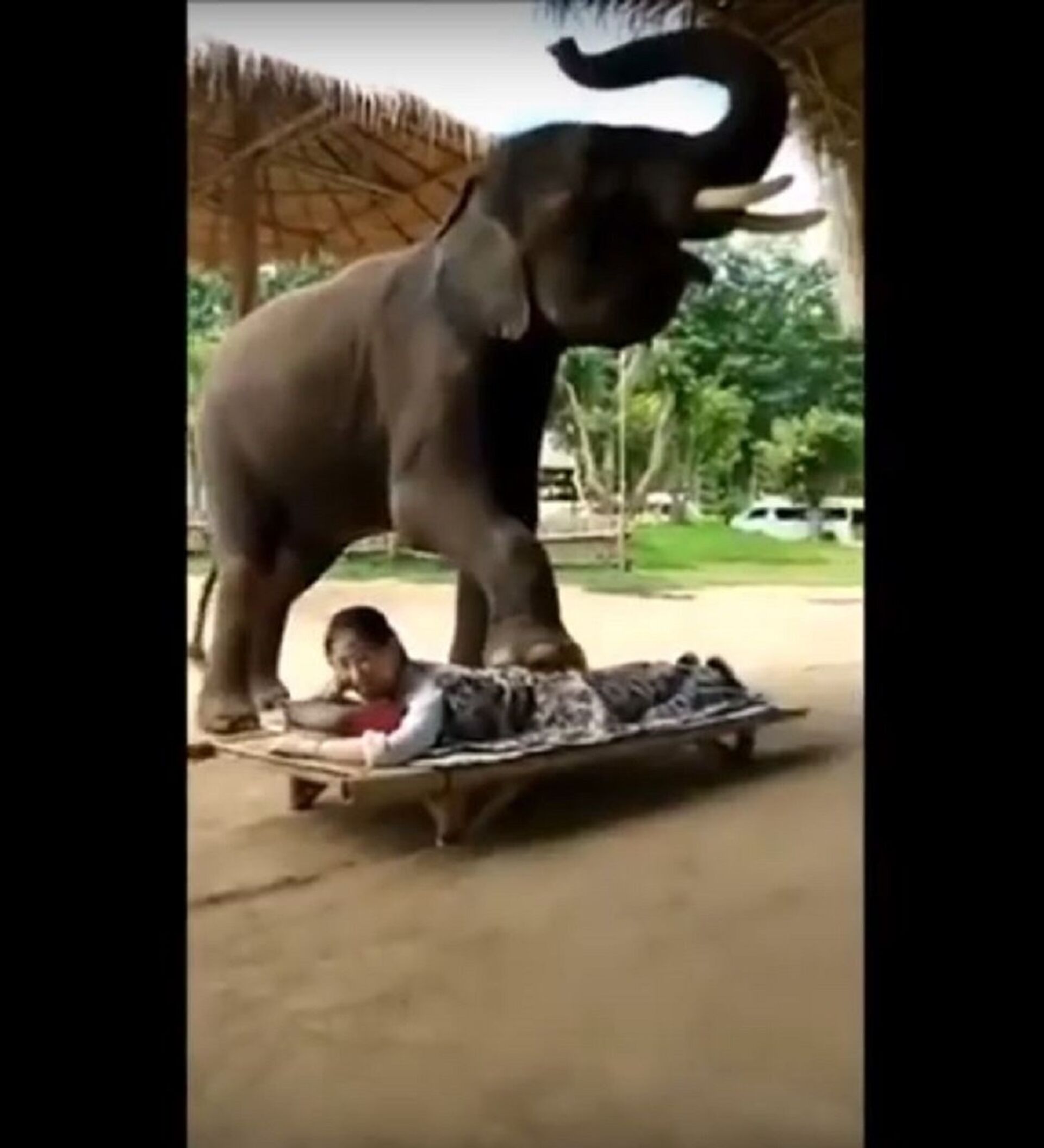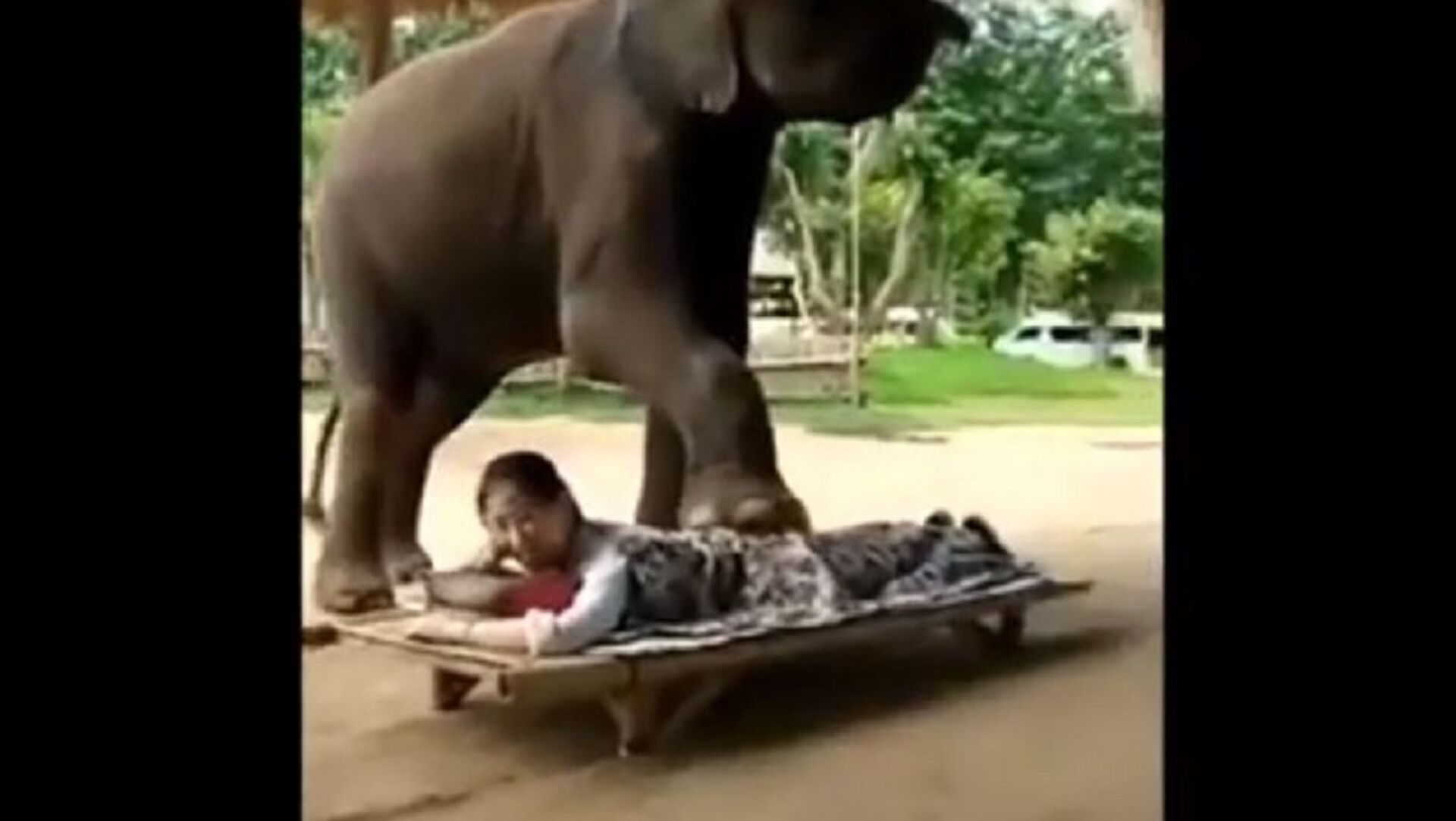 ويظهر مقطع الفيديو، الفيل وهو يستخدم أرجله وخرطومه لعمل المساج، ويتهافت الكثير من السياح لمشاهدة وتجربة هذا النوع من التدليك.