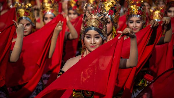 فتيات يؤدين الرقصة التقليدية على شاطئ مدينة بانيوانجي، إندونيسيا 20 أكتوبر/ تشرين الأول 2018 - سبوتنيك عربي