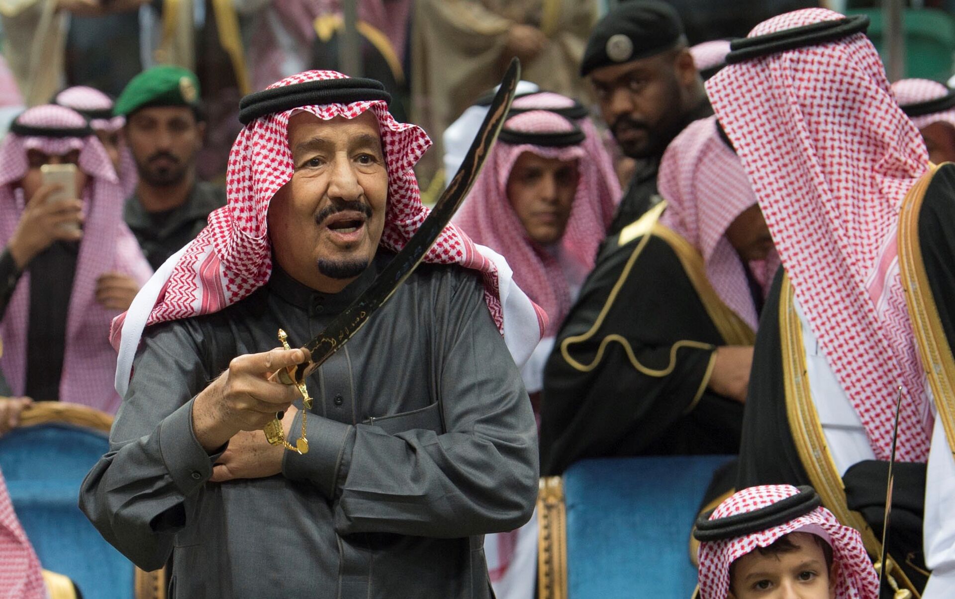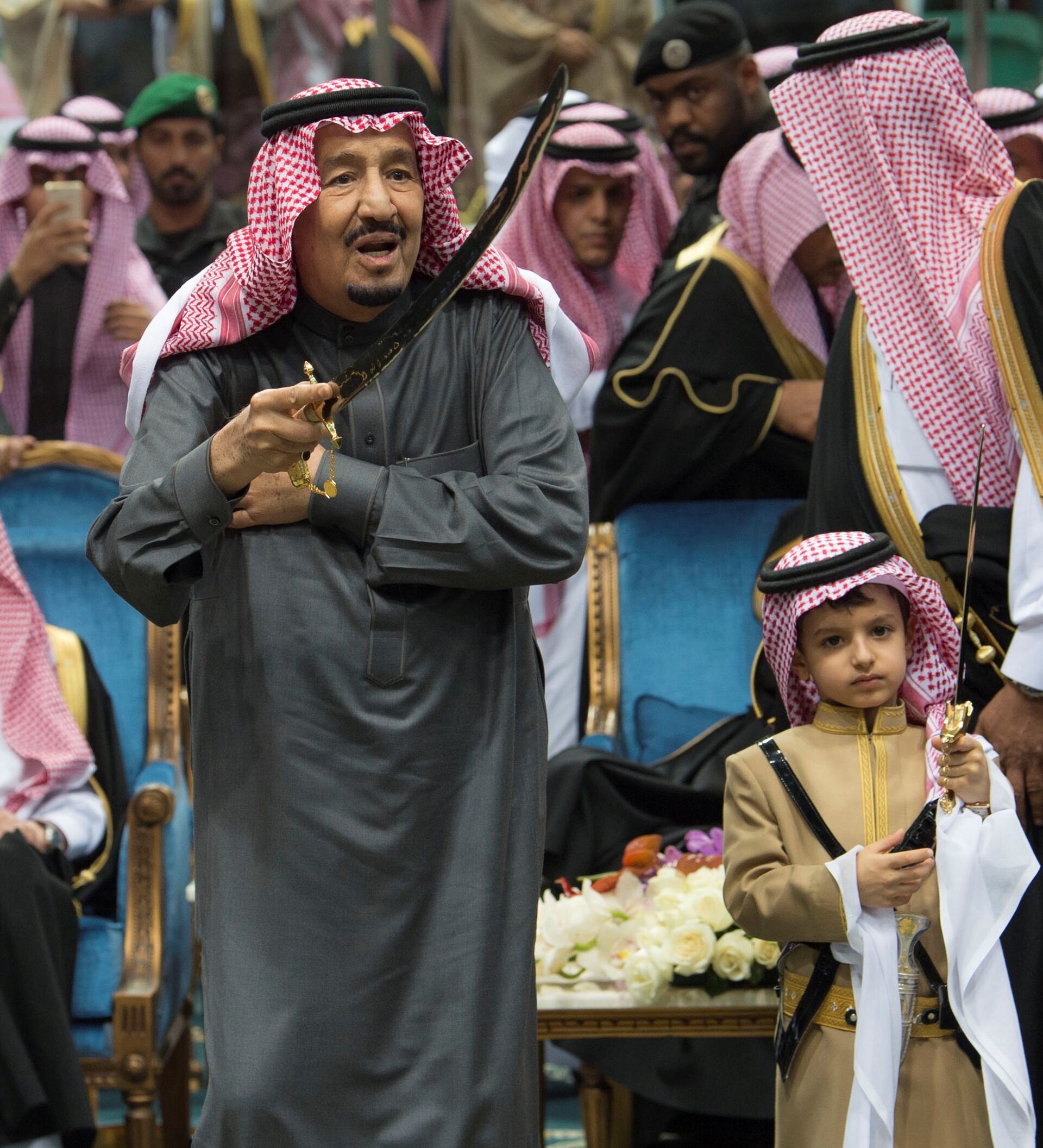 وأدى الملك سلمان رقصة "العرضة" السعودية متوشحا بعلم المملكة قبل أن يقوم بتقبيله.