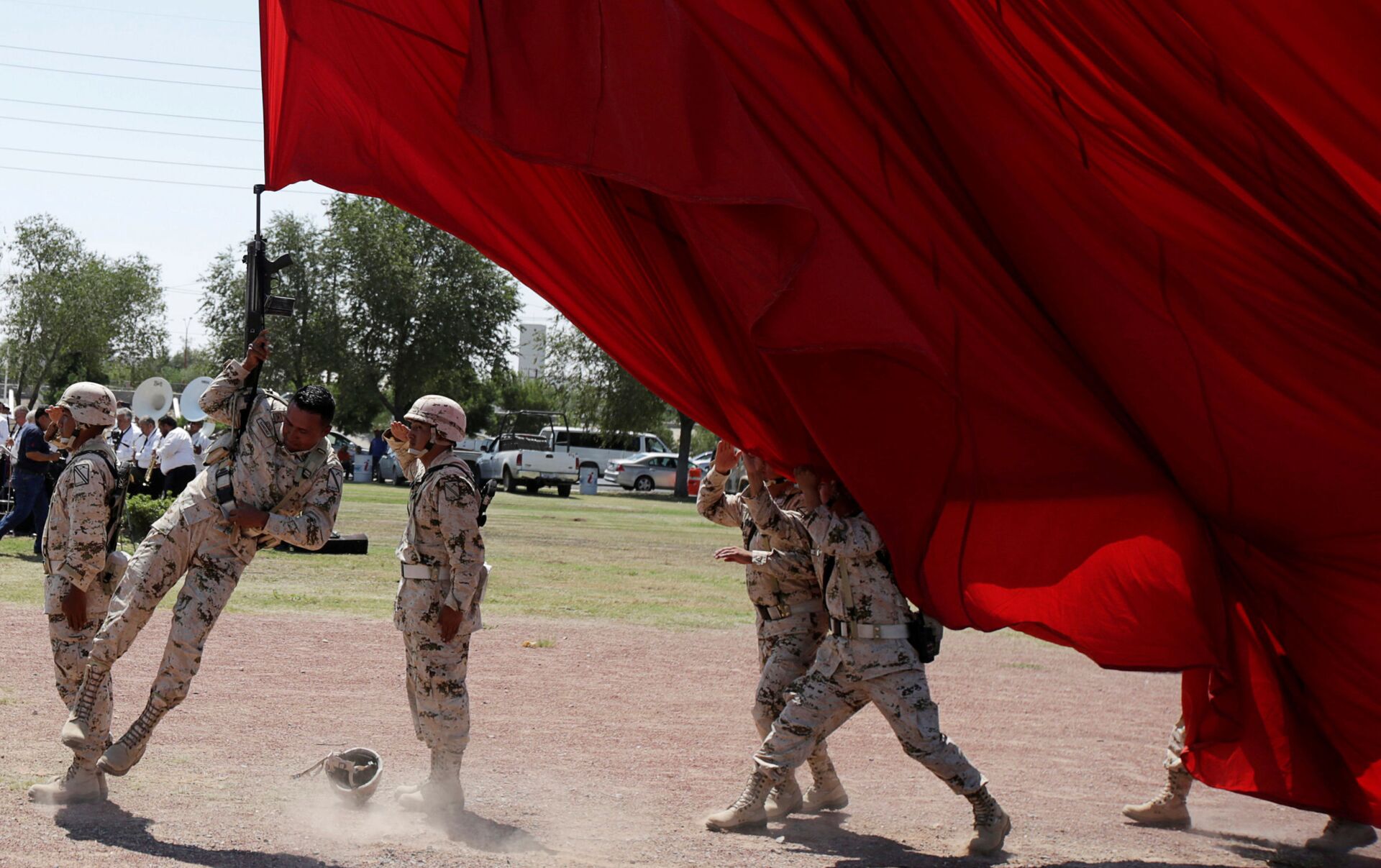 © REUTERS / Jose Luis Gonzalez جندي وبندقيته يتعلقان بعلم عملاق عن طريق الخطأ خلال التحضيرات للاحتفال بالذكرى الـ 207 لاستقلال المكسيك عن إسبانيا، والتي تصادف يوم 16 سبتمبر/ أيلول فى سيوداد خواريز، المكسيك فى 4 سبتمبر/ أيلول 2017