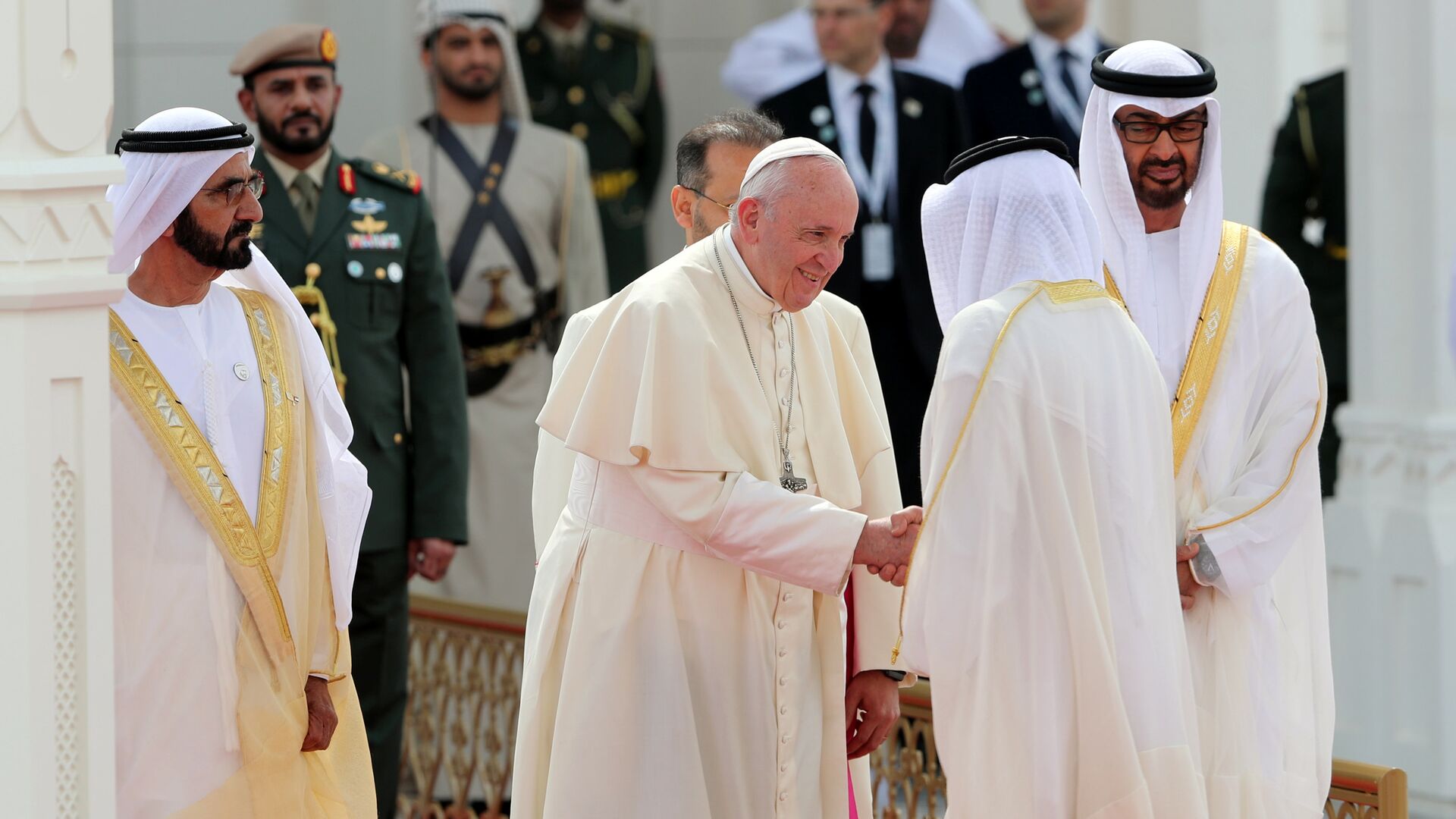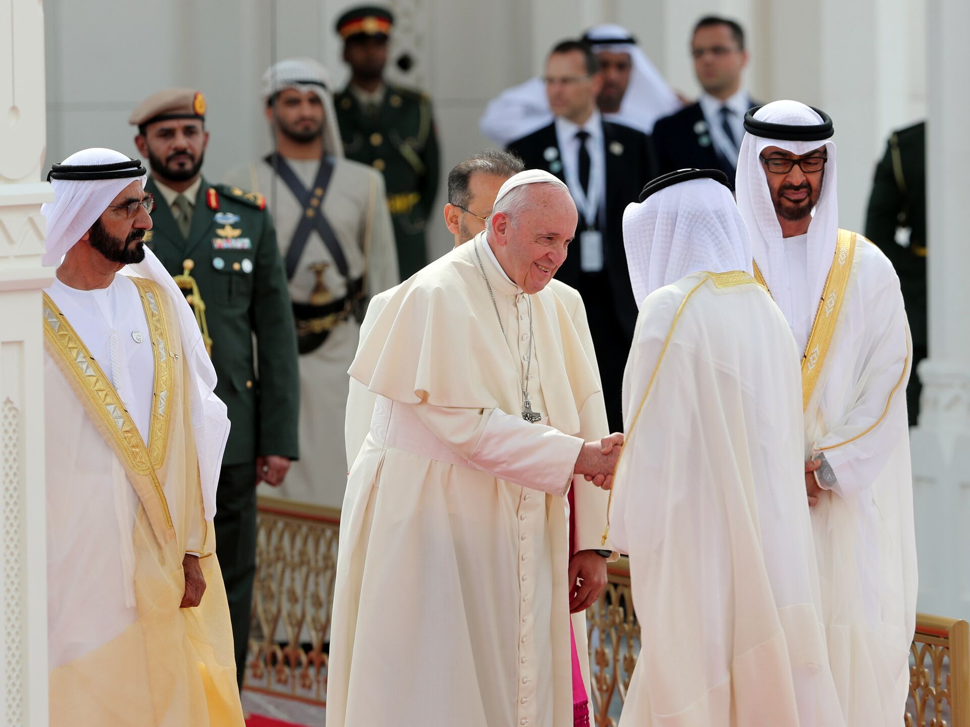 ​ونشر ولي عهد أبو ظبي تغريدة سابقة، قال فيها: "محمد بن راشد ومحمد بن زايد يستقبلان البابا فرنسيس بابا الكنيسة الكاثوليكية حيث جرت له مراسم استقبال رسمية في قصر الرئاسة بأبو ظبي".