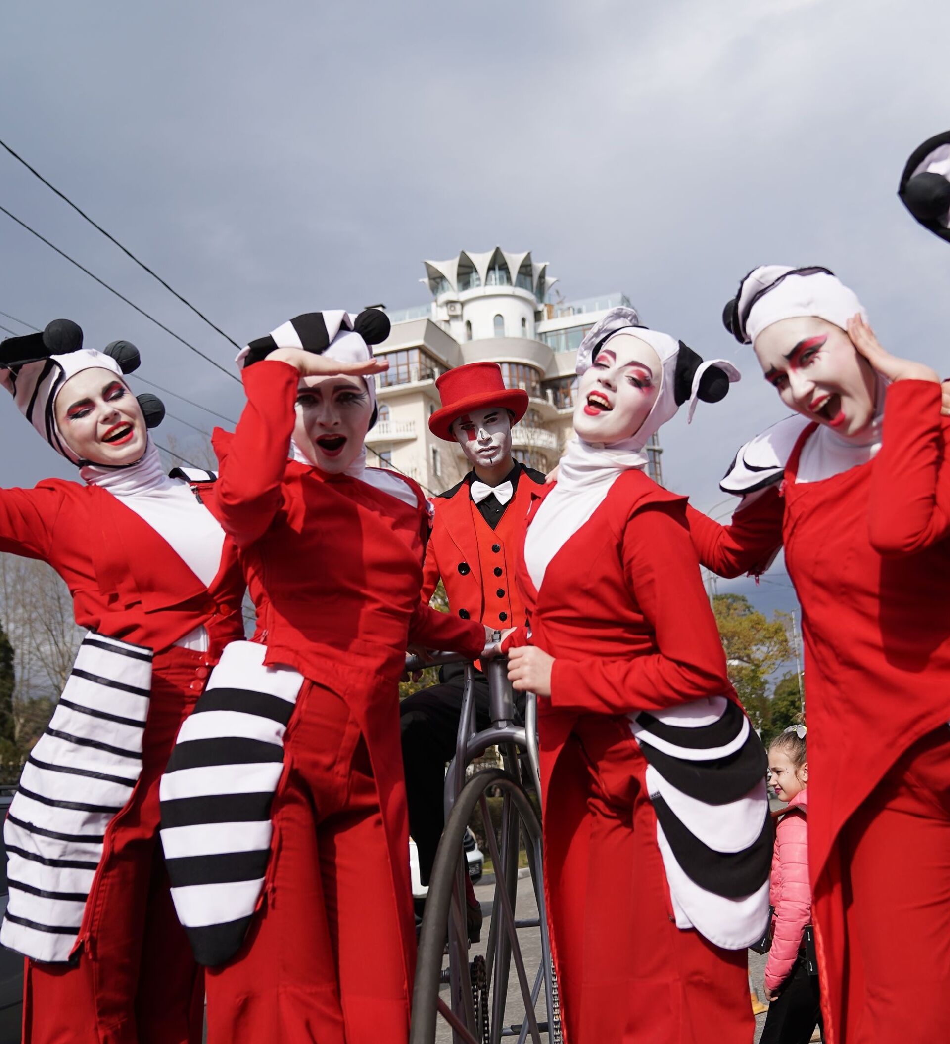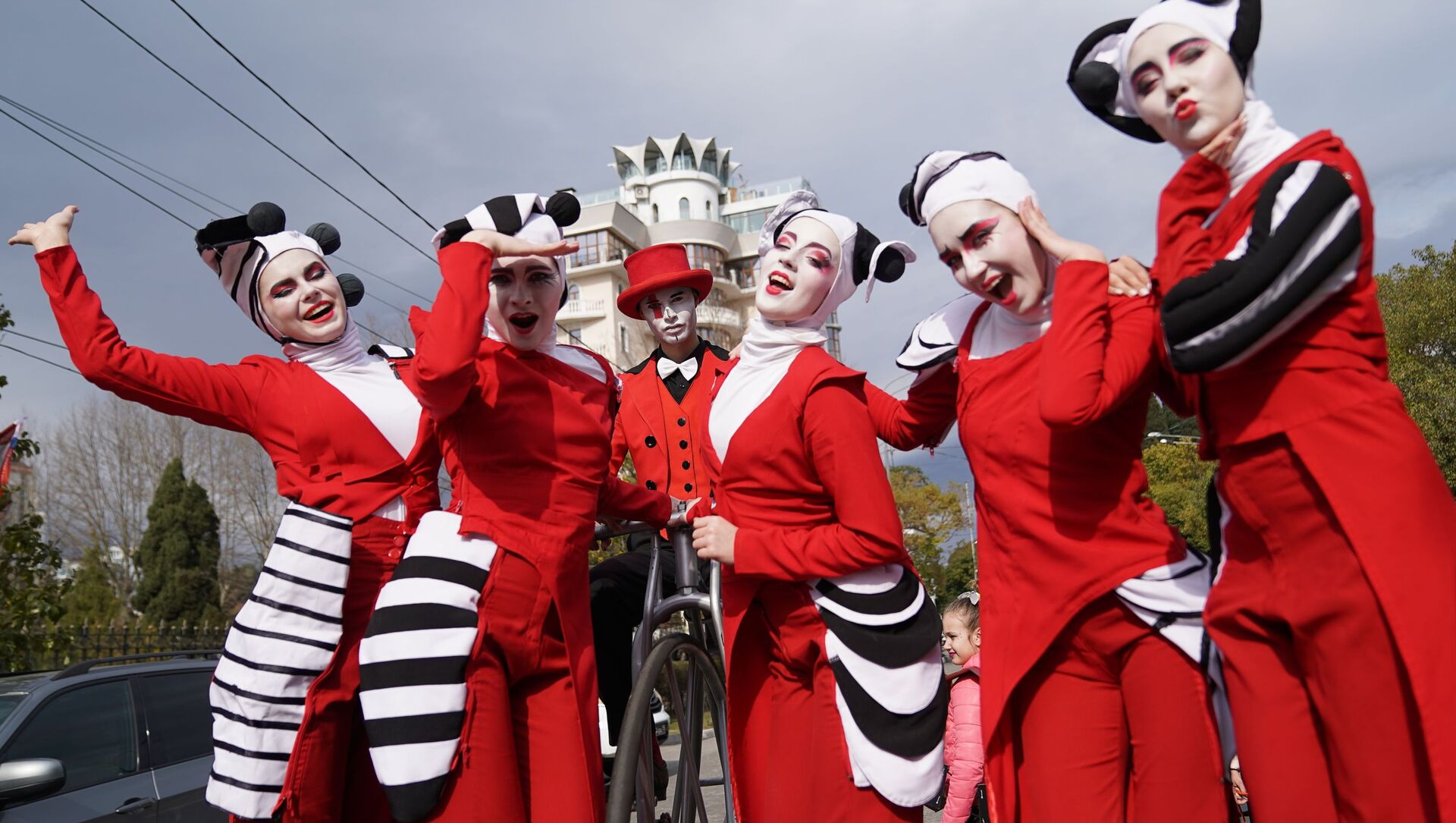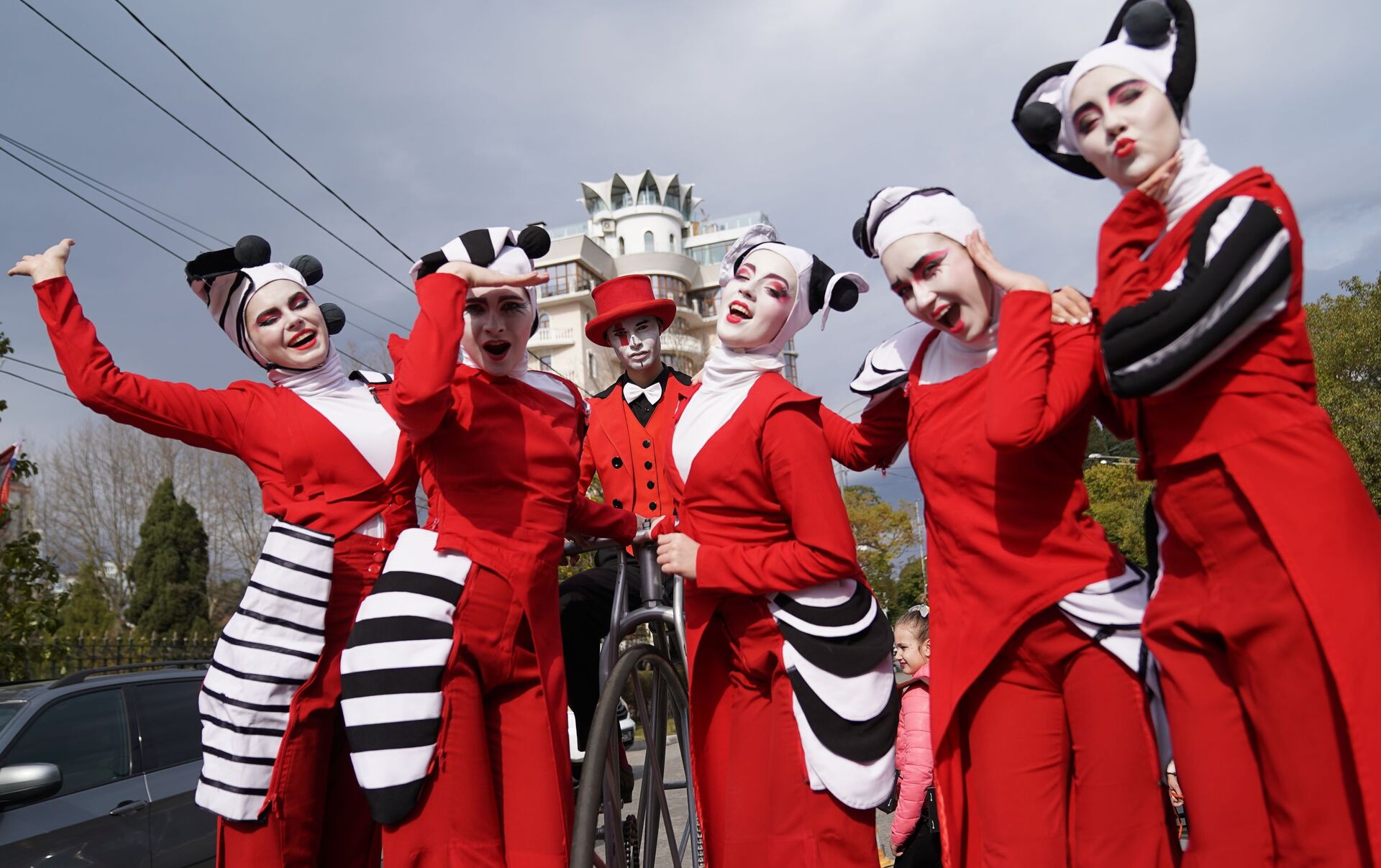 © Sputnik . Artur Lebedev / الانتقال إلى بنك الصور فنانون روس من مسارح الشوارع خلال العرض في ساحة تياترالنايا في سوتشي. فنانون روس من مسارح الشوارع خلال العرض في ساحة تياترالنايا في سوتشي.