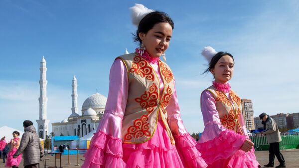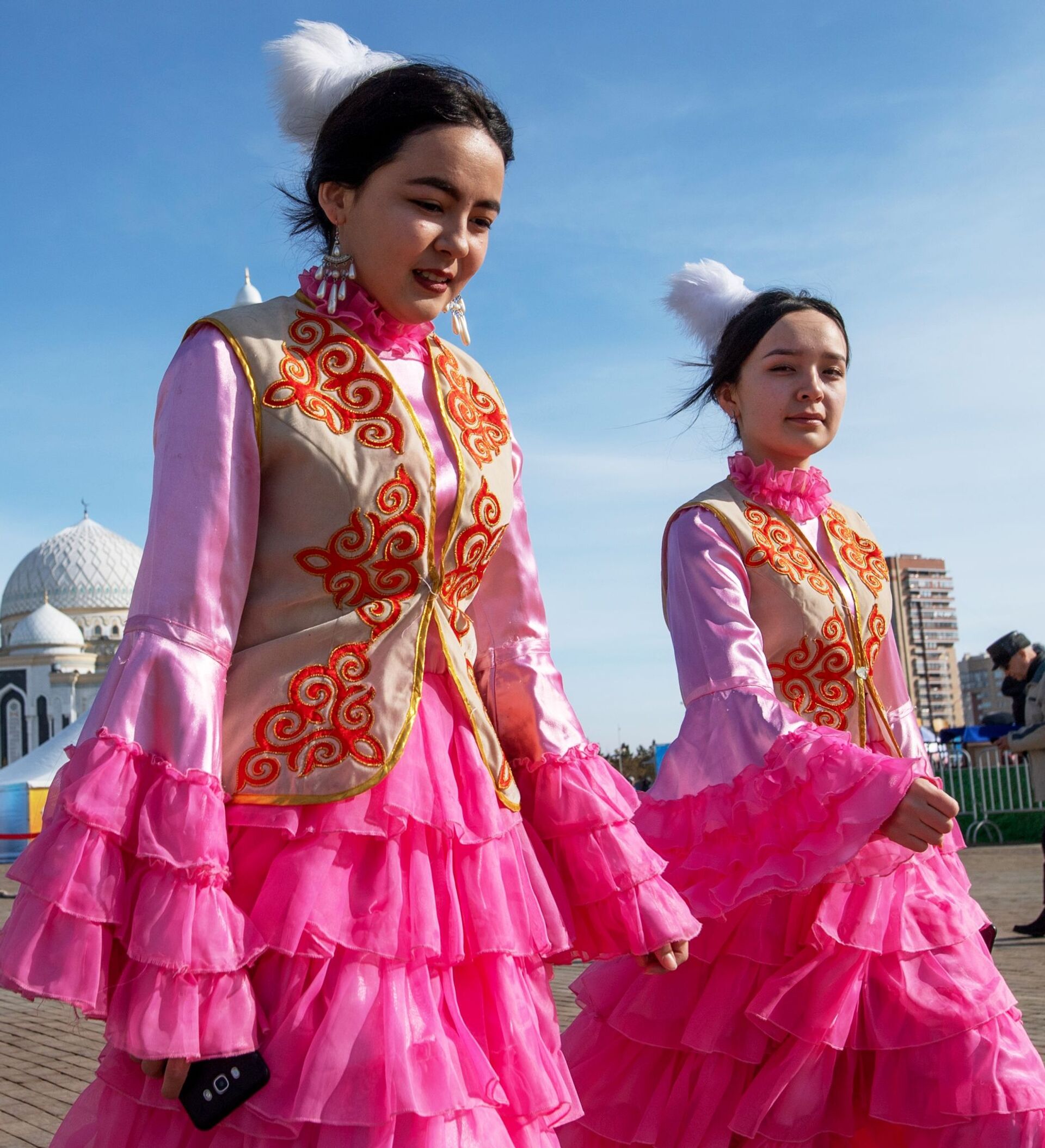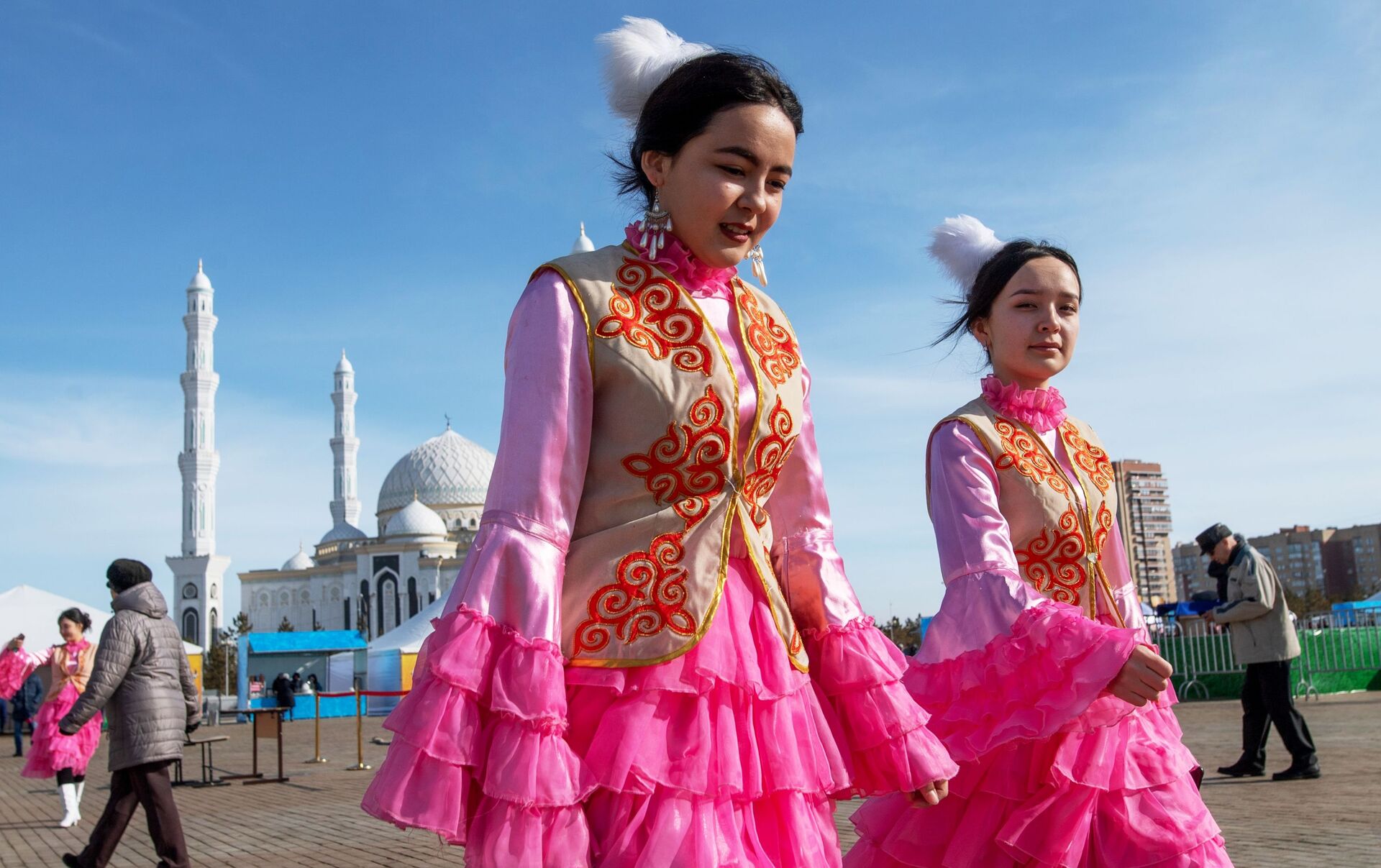 فتيات يرتدين الزي التقليدي في أستانا خلال الاحتفالات في عيد نفروز في كازاخستان
