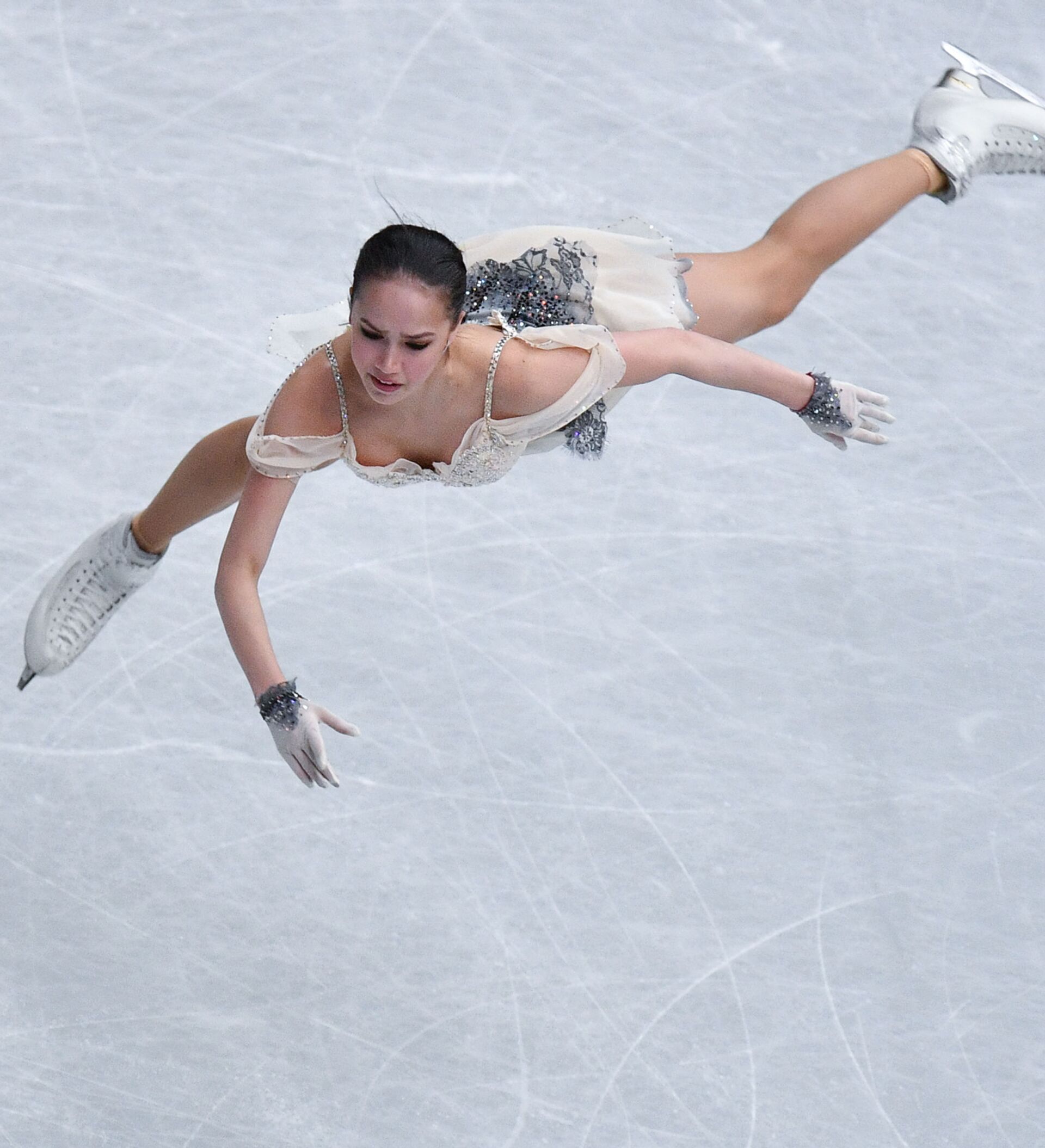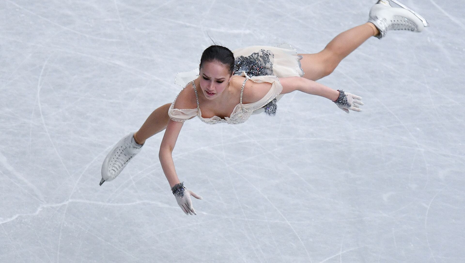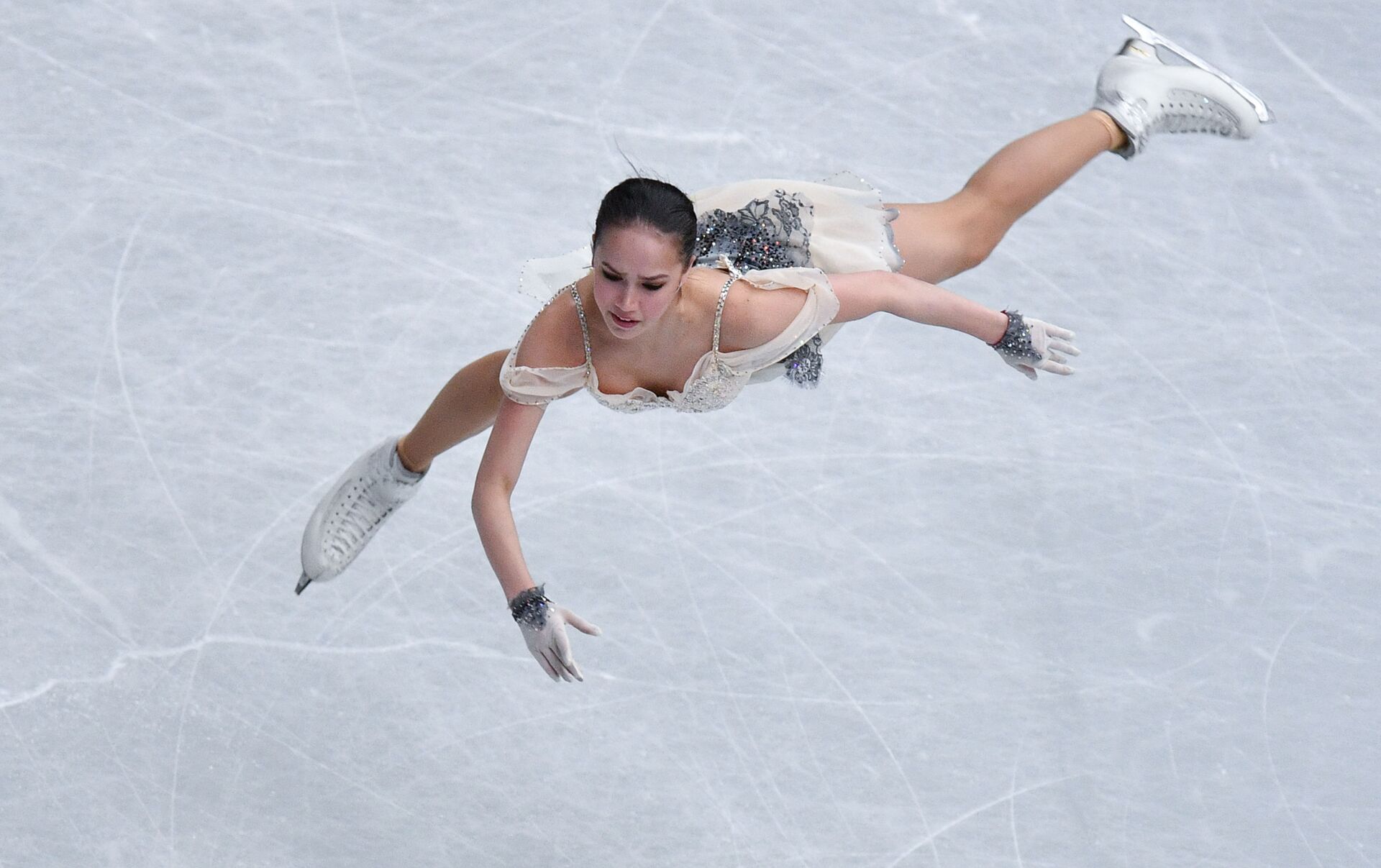 المتزحلقة الروسية ألينا زاغيتوفا خلال تقديم فقرة للأداء الفني الفردي للنساء، في إطار بطولة العالم للتزحلق الفني على الجليد لعام 2019 في مدينة سايتامي اليابانية
