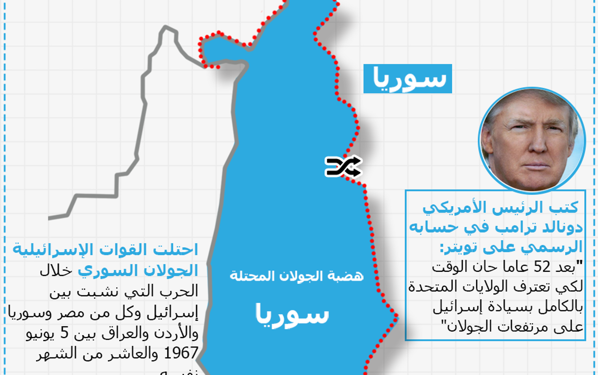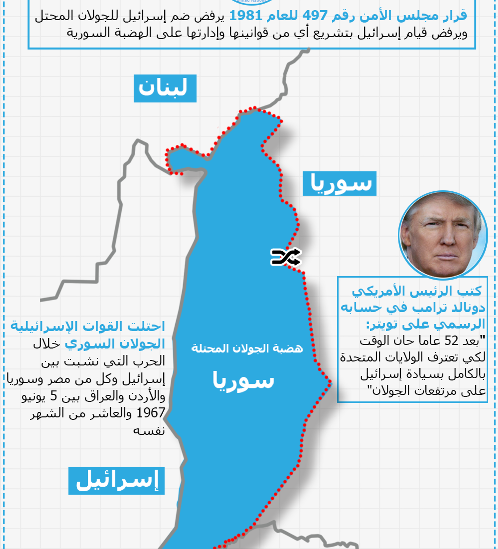 أعلن الرئيس الأمريكي دونالد ترامب بأنه حان وقت الاعتراف بسيادة إسرائيل على الجولان السوري، منتهكا قرار الأمم المتحدة 479 للعام 1981، مما أدى إلى انتقادات واسعة في المجتمع الدولي.