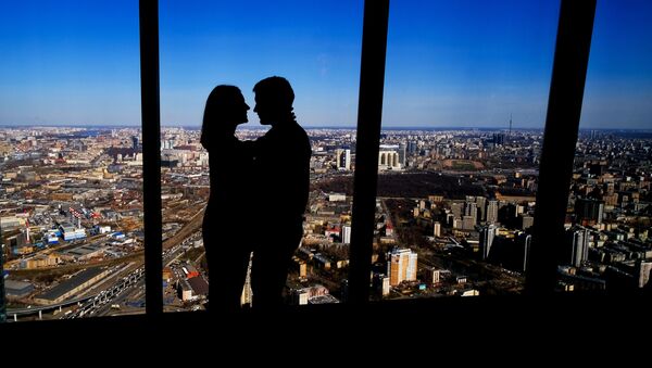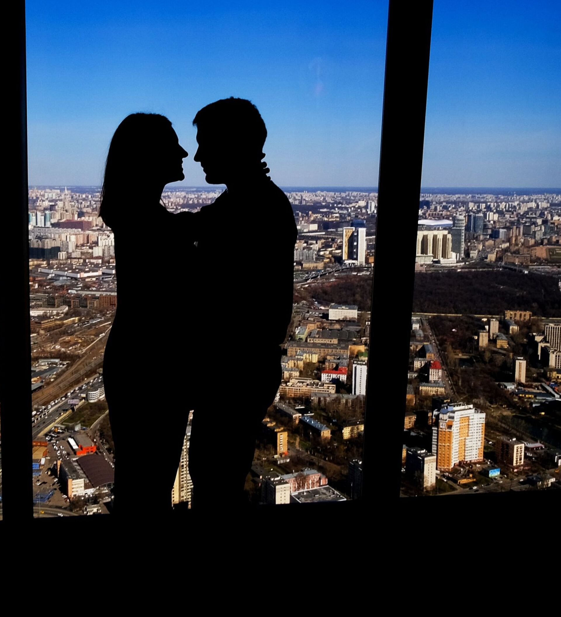 زوار منصة المشاهدة "بانوراما 360 (PANORAMA360)، على الطابق الـ89 من ناطحة السحاب "فيديراتسيا" (الاتحاد)، في المجمع الاقتصادي الدولي "موسكفا-سيتي" (موسكو سيتي)