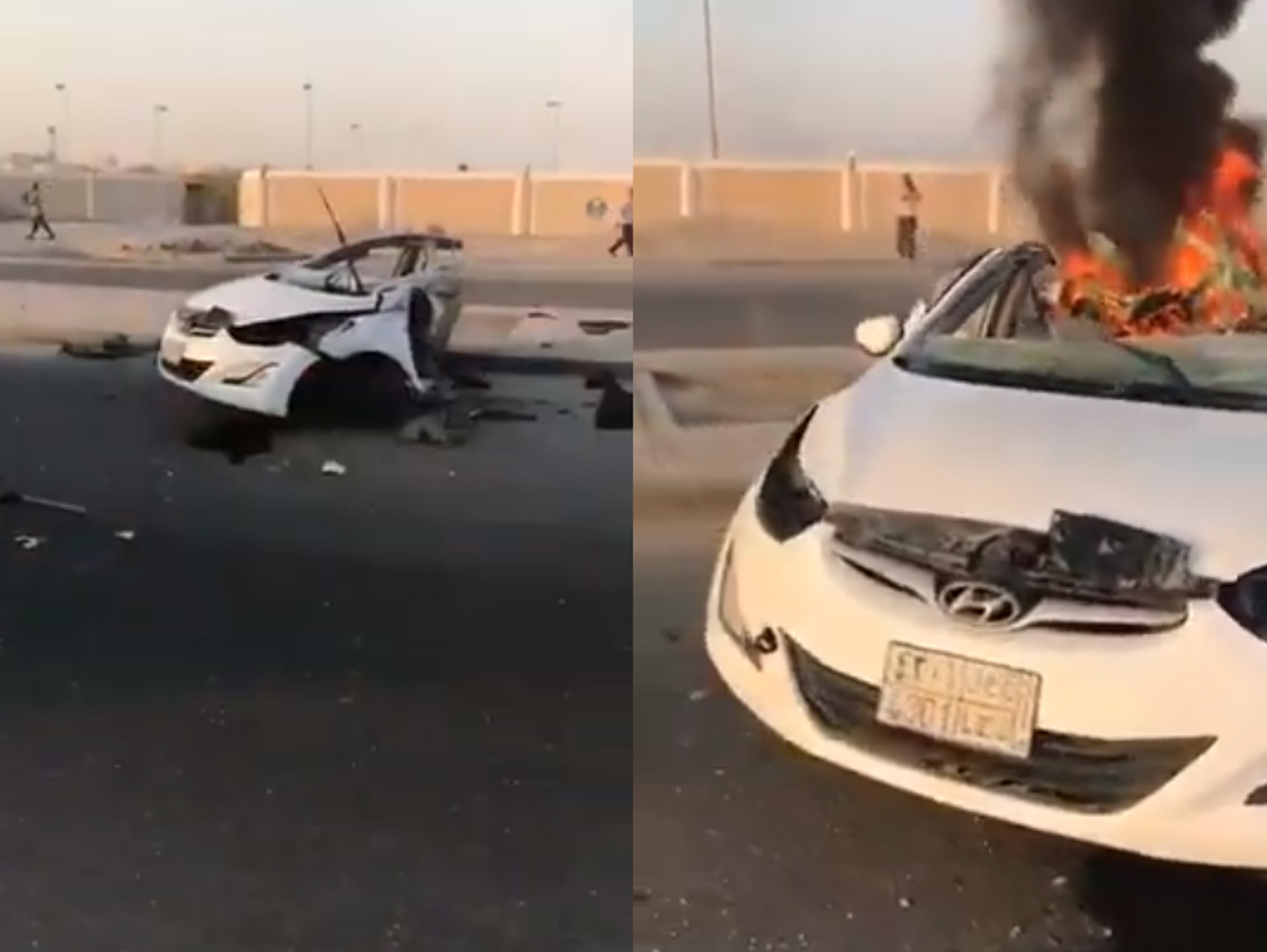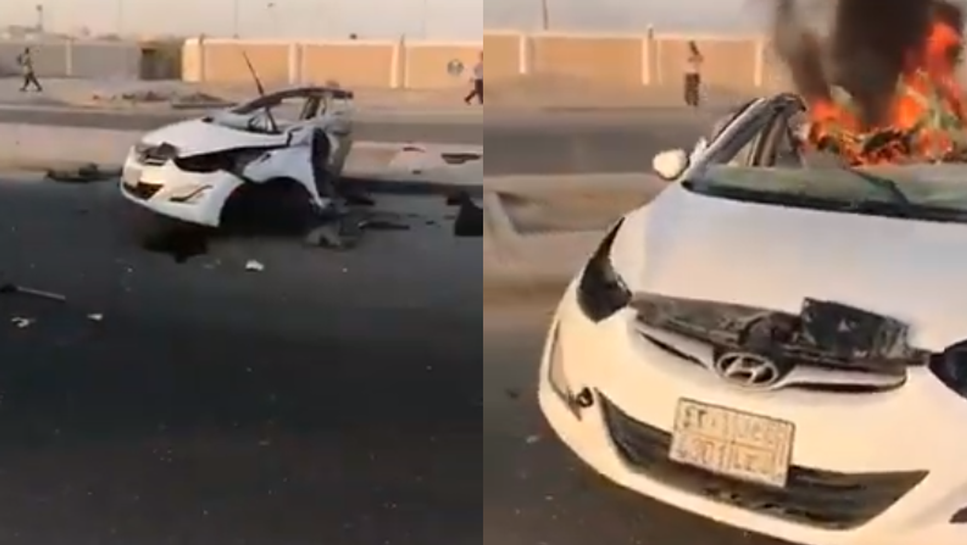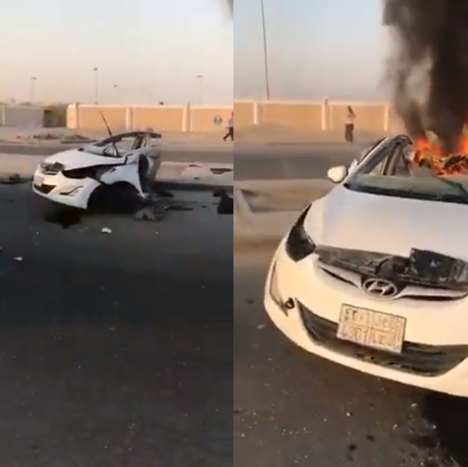 ووفقا لوكالة "تواصل"، فإن السيارة ارتطمت بعامود الإنارة، الأمر الذي أدى إلى انقسامها إلى شطرين، واشتعال النيران بداخلها.
