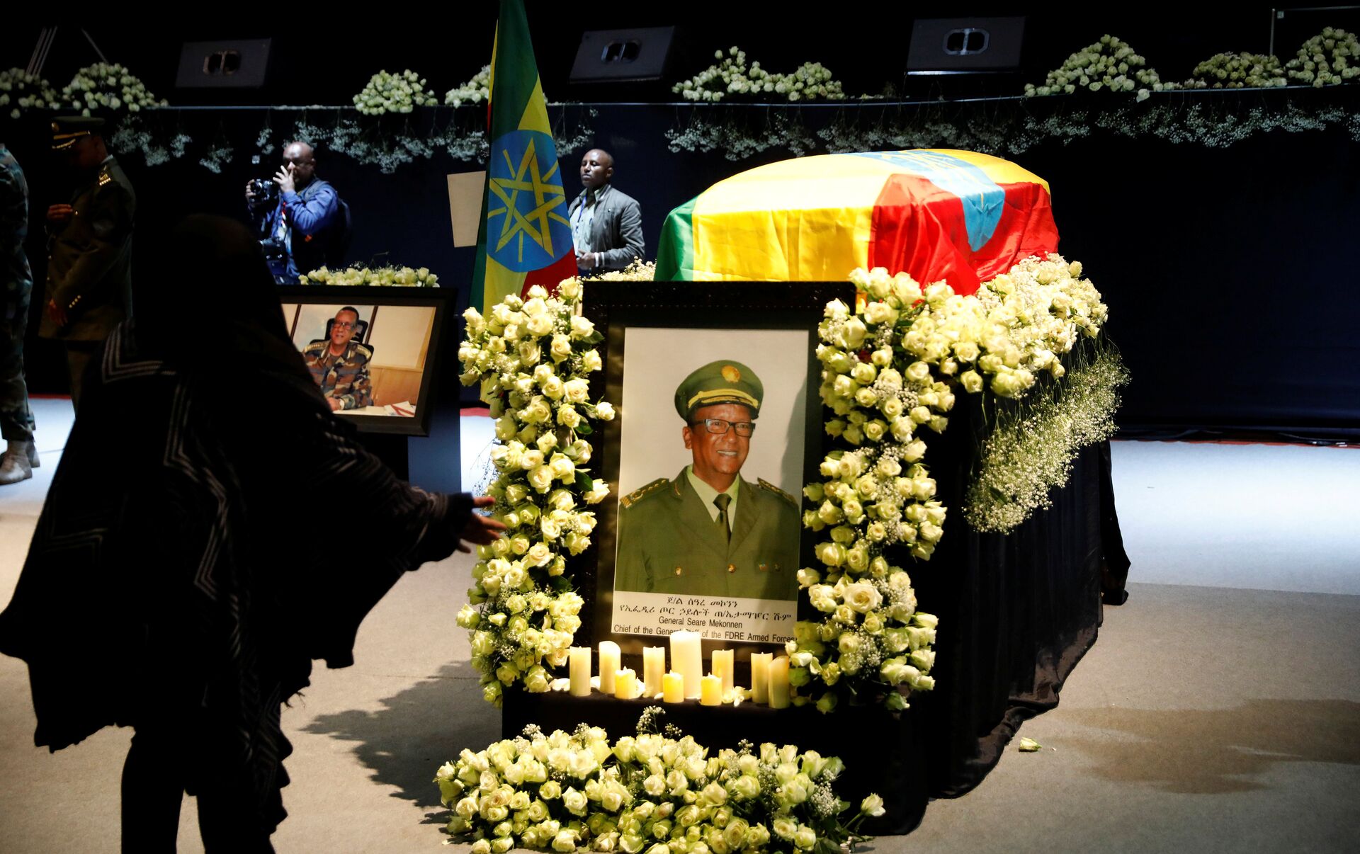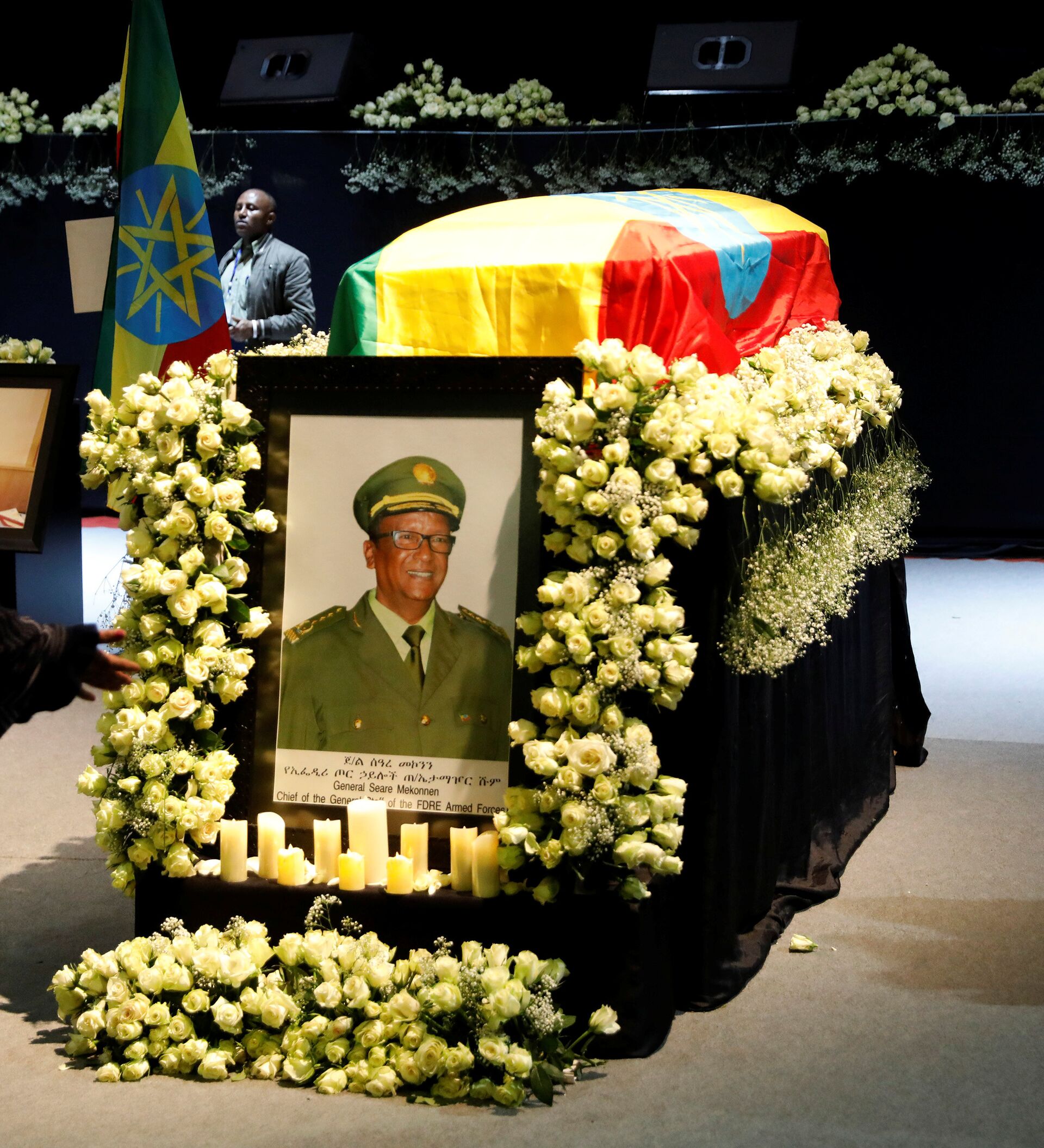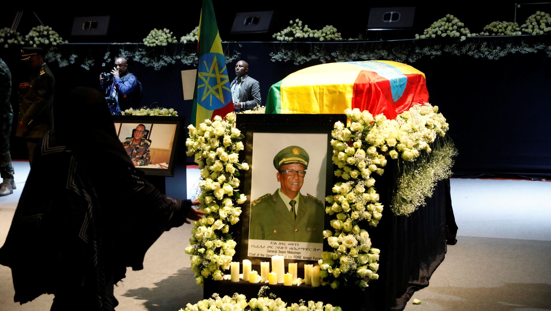 ونقل النعشين إلى القاعة ملفوفين بعلم إثيوبيا، ودخل رئيس الوزراء أبي أحمد القاعة وجلس وأحنى رأسه وبدا عليه الحزن، كما حضرت شخصيات كبيرة أخرى ومسؤولون من الكنيسة الأرثوذكسية.
